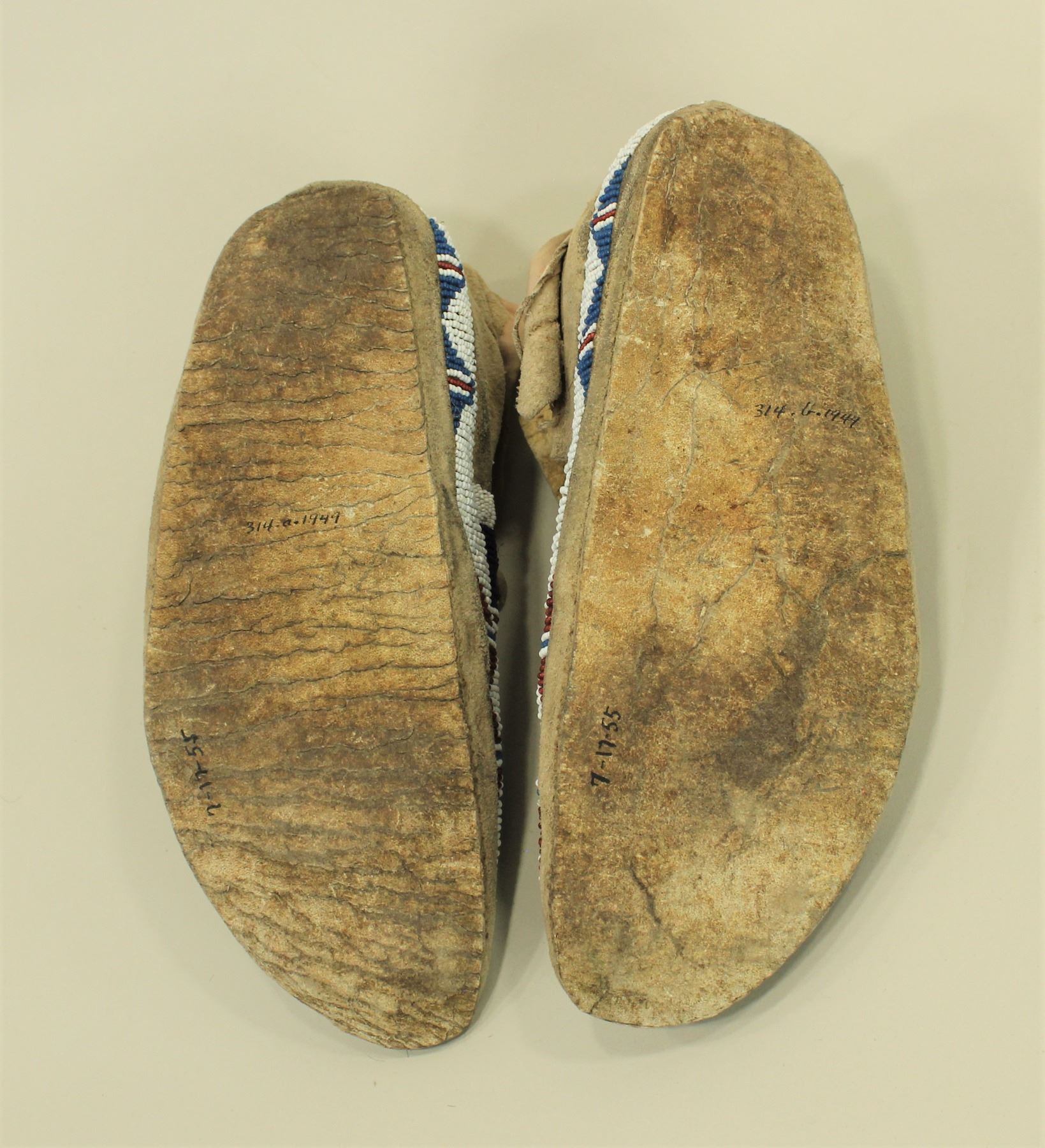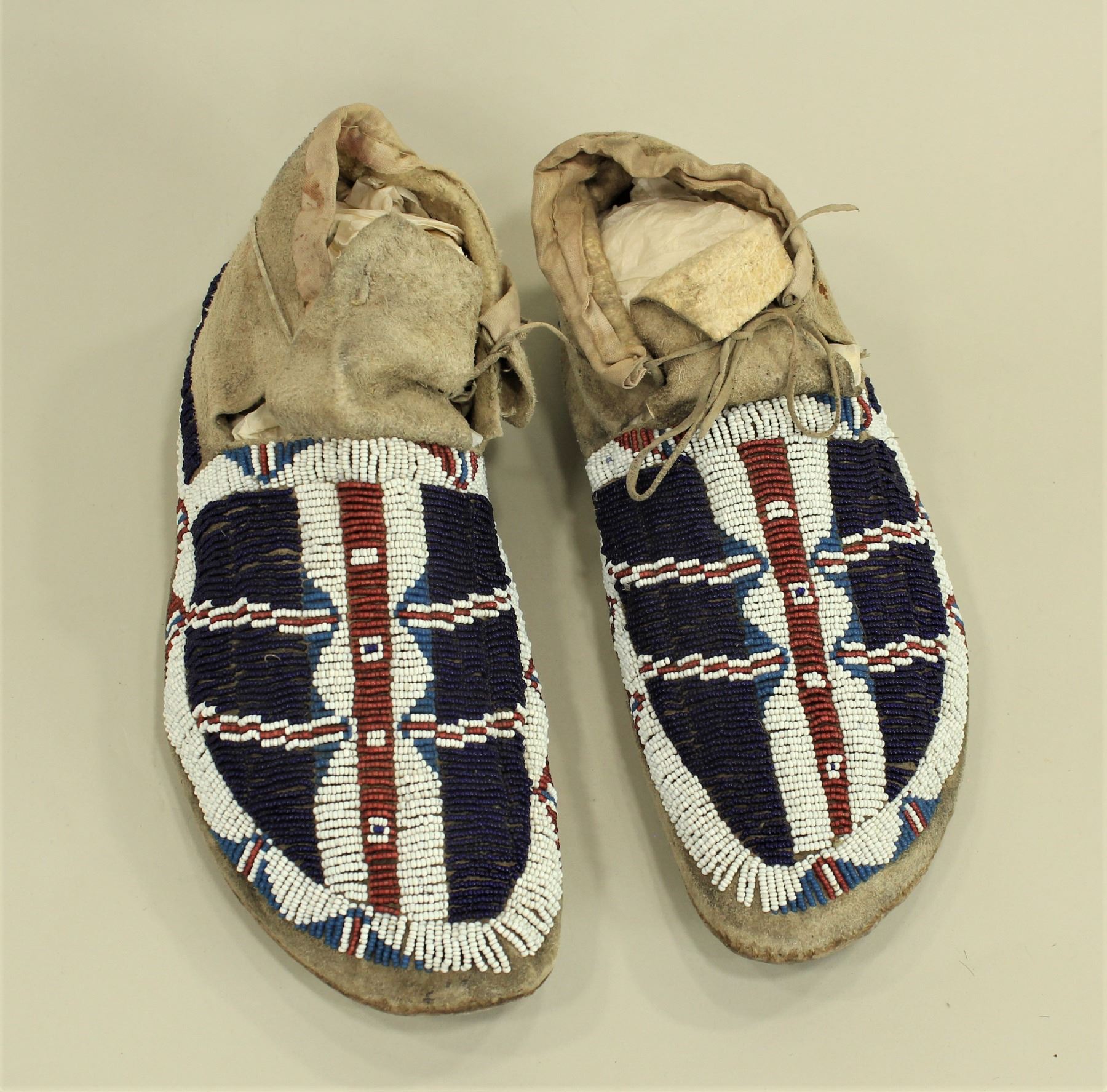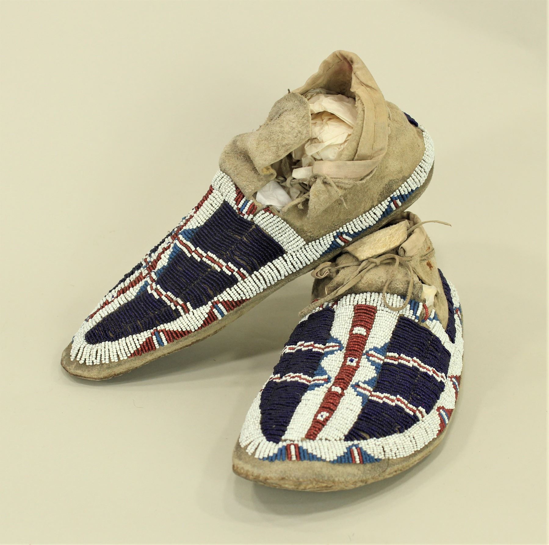 A beautifully beaded pair of men's moccasins with bold colors that include red white hearts, on a cobalt blue buffalo track background. Having parfleche soles with museum log numbers. Circa 1890's.