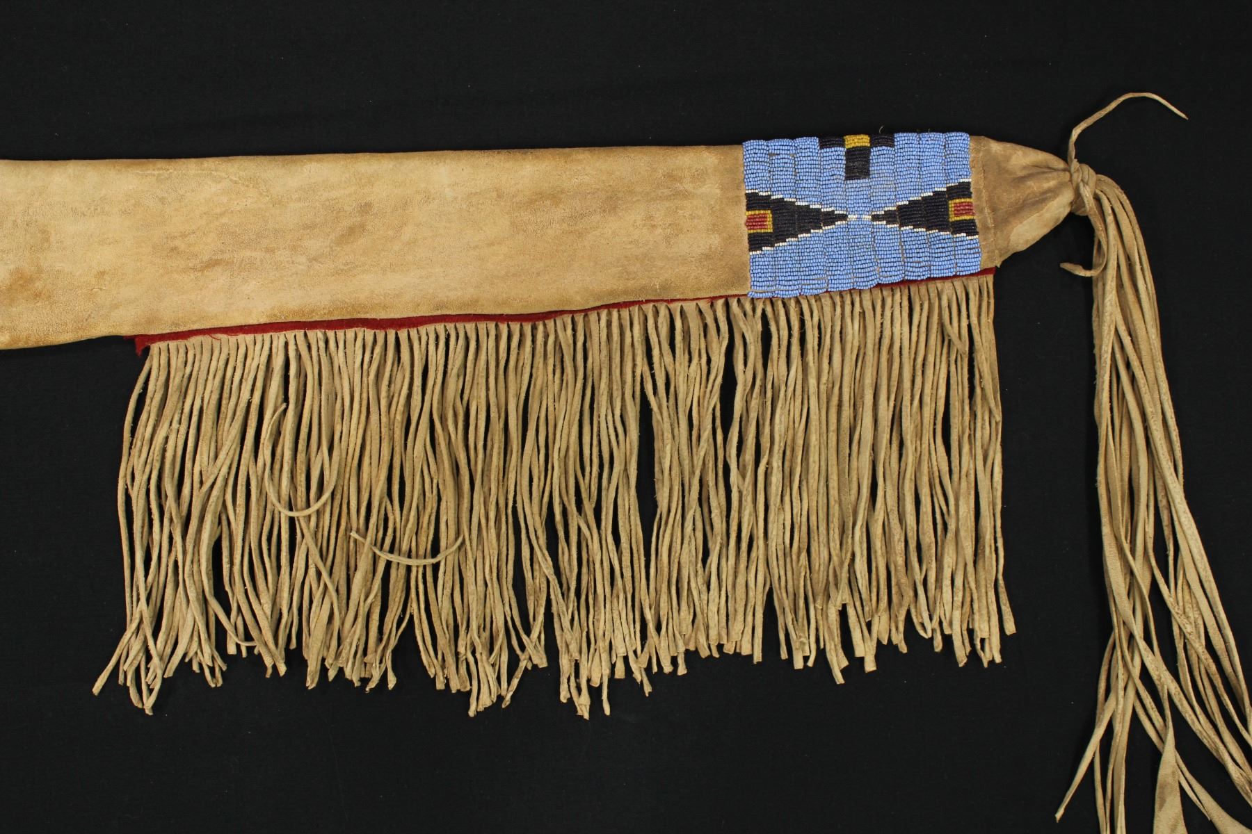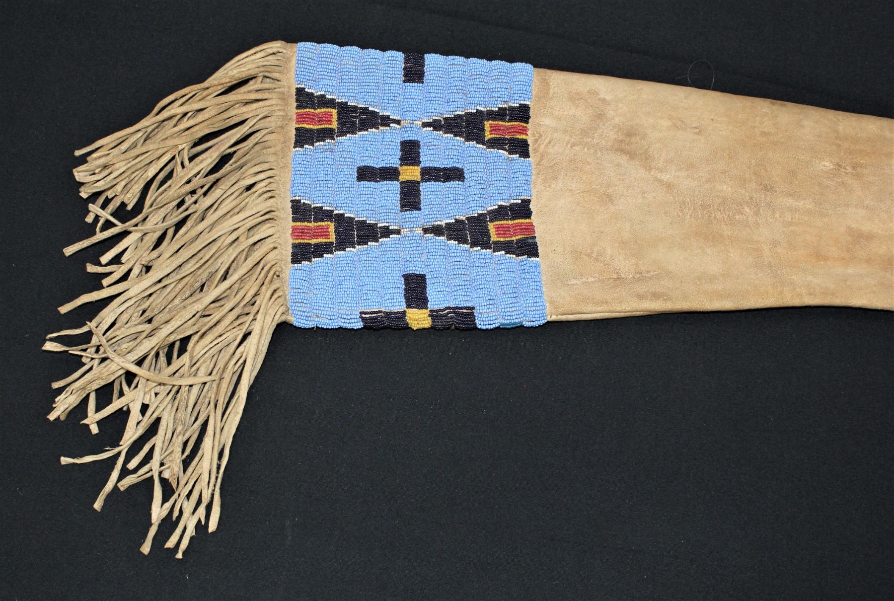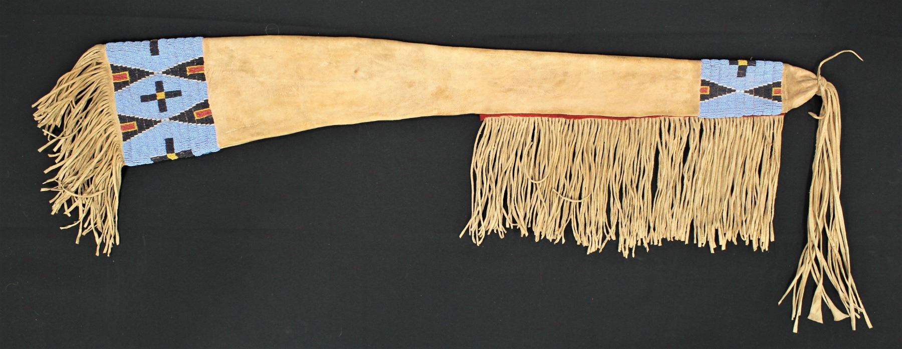 An exceptionally nice buckskin rifle scabbard, beautifully beaded with cobalt blue and red white heart beads on a light blue background and finished with long fantastic fringe.