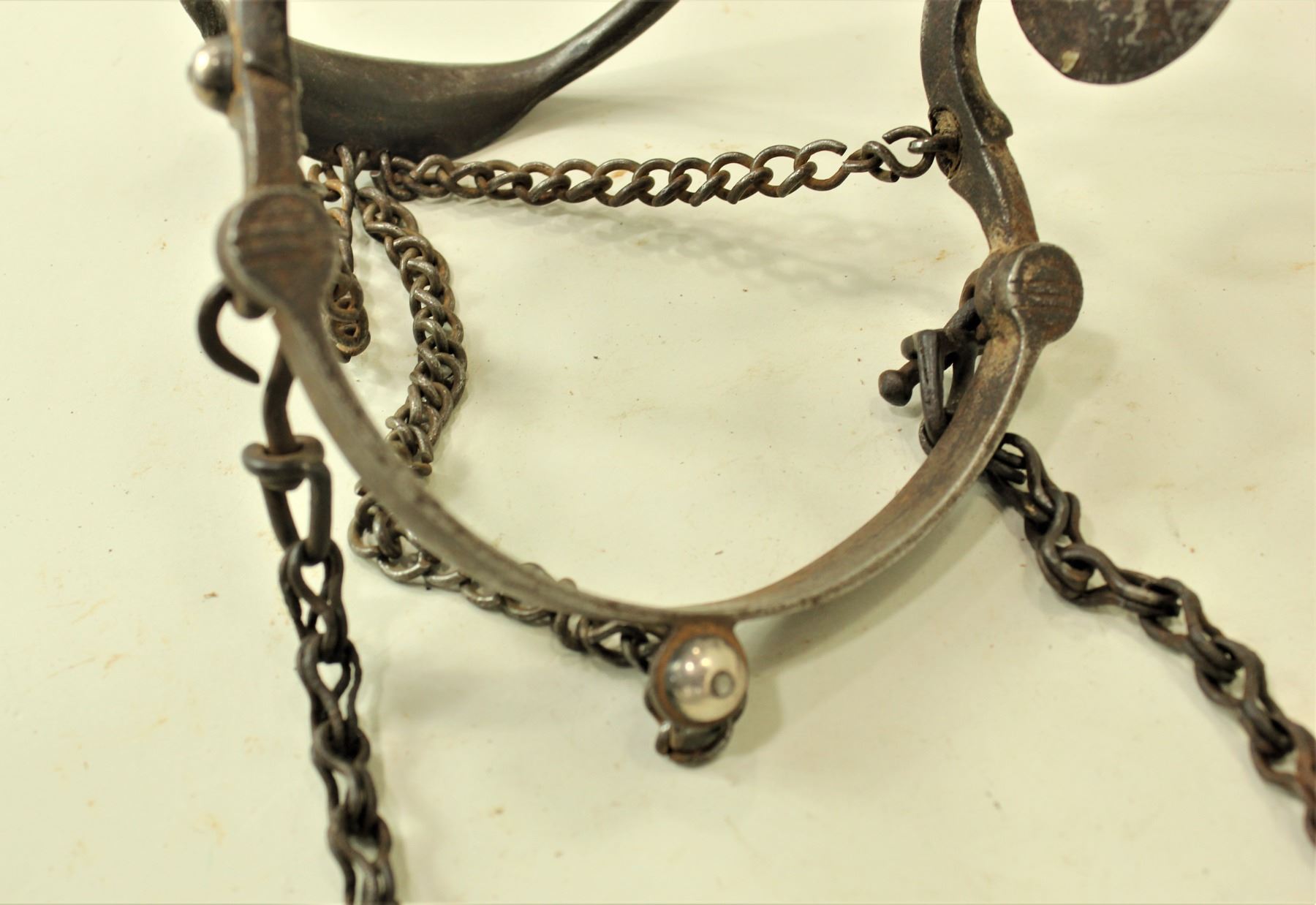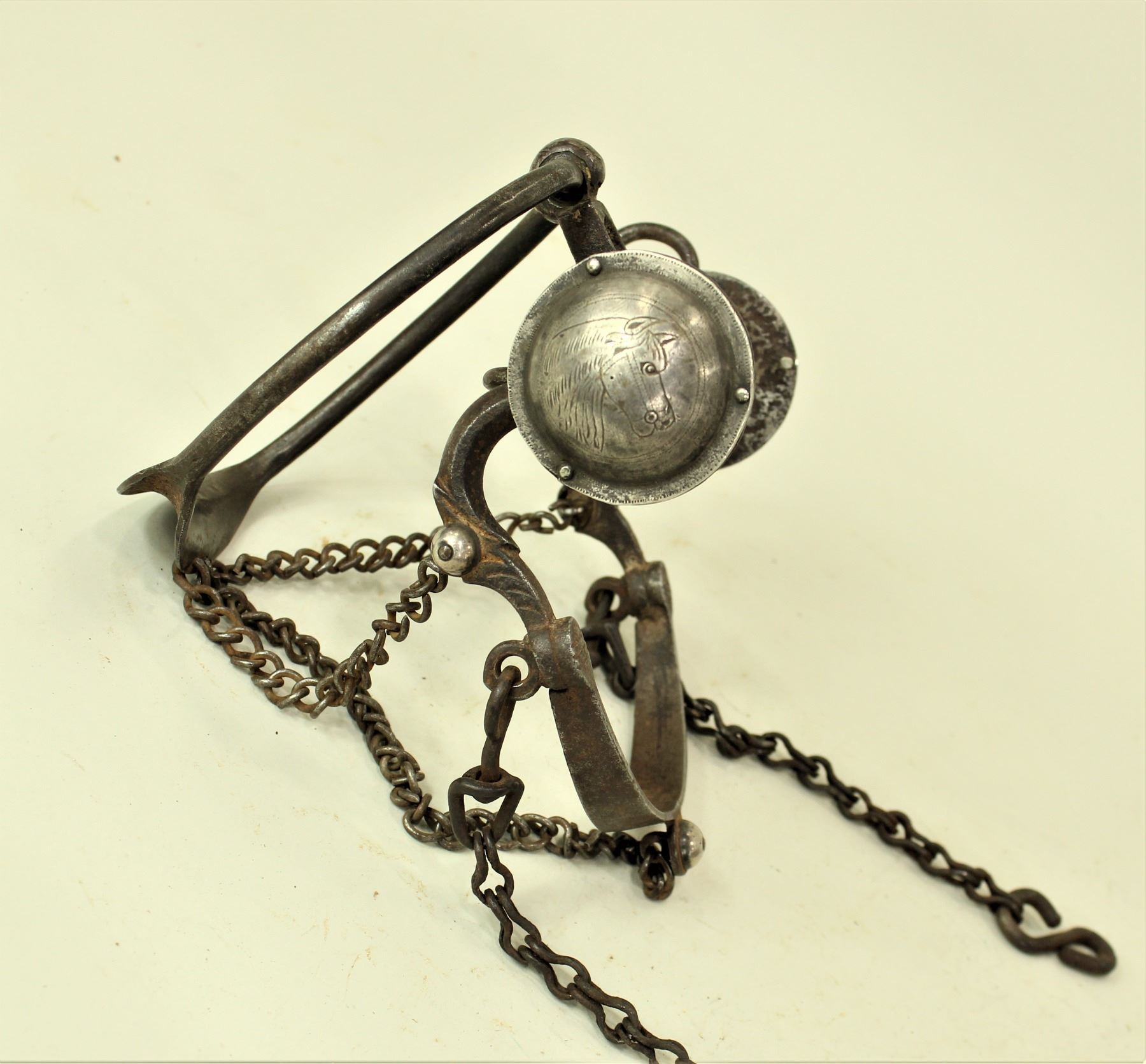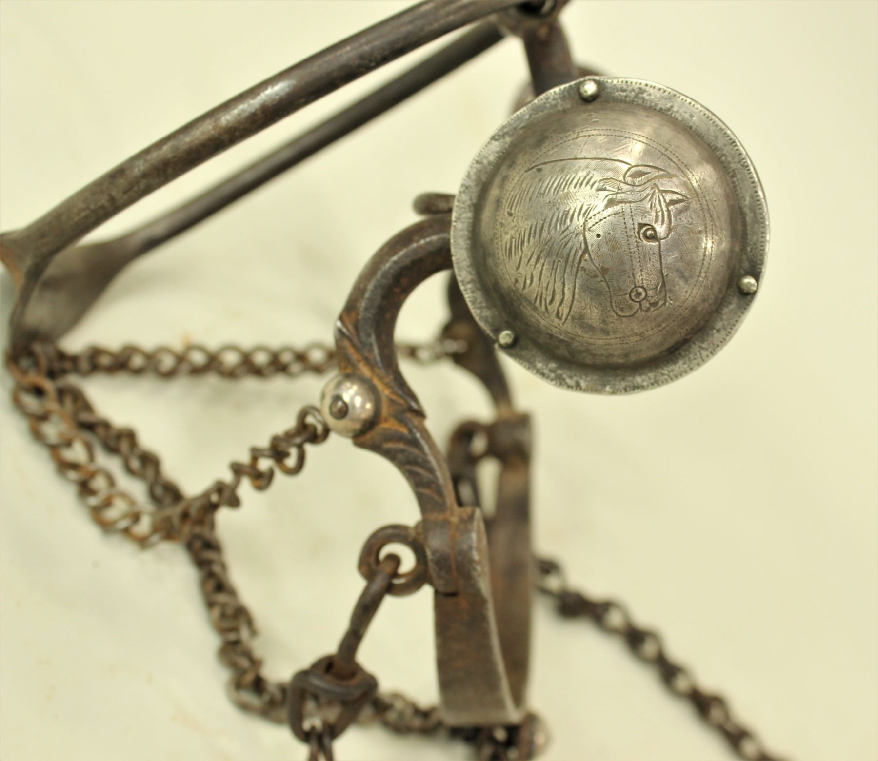 A phenomenal untouched ring bit with incredible horsehead engraved conchos, ring and all original chains. Unmarked but is pictured in the Garcia catalog, bit #42.