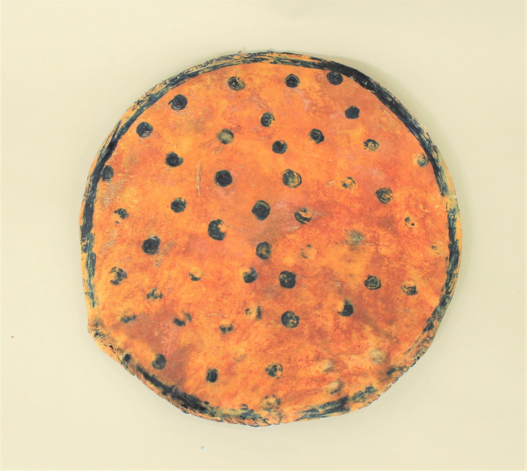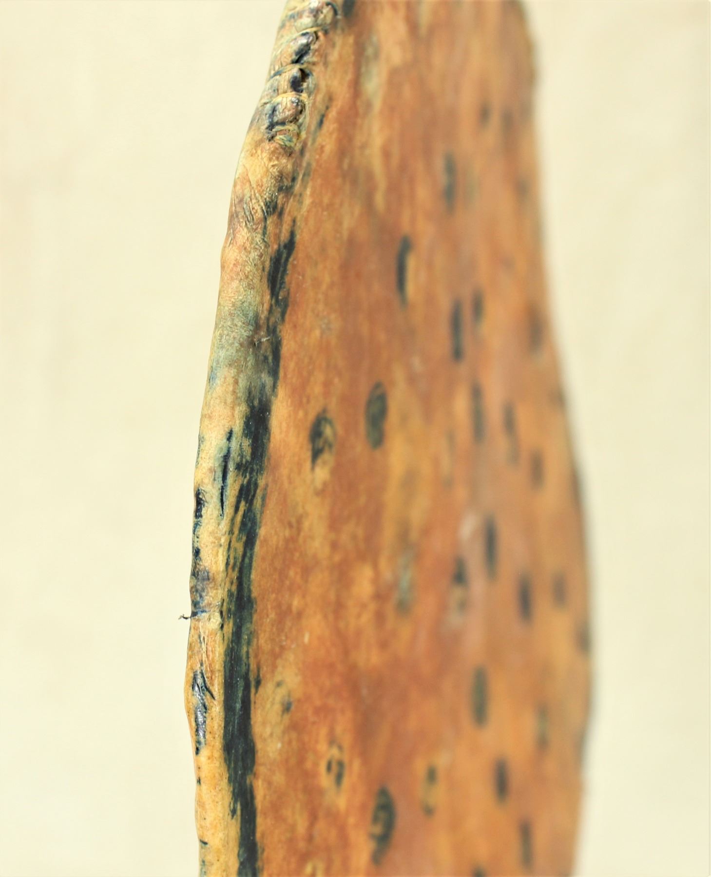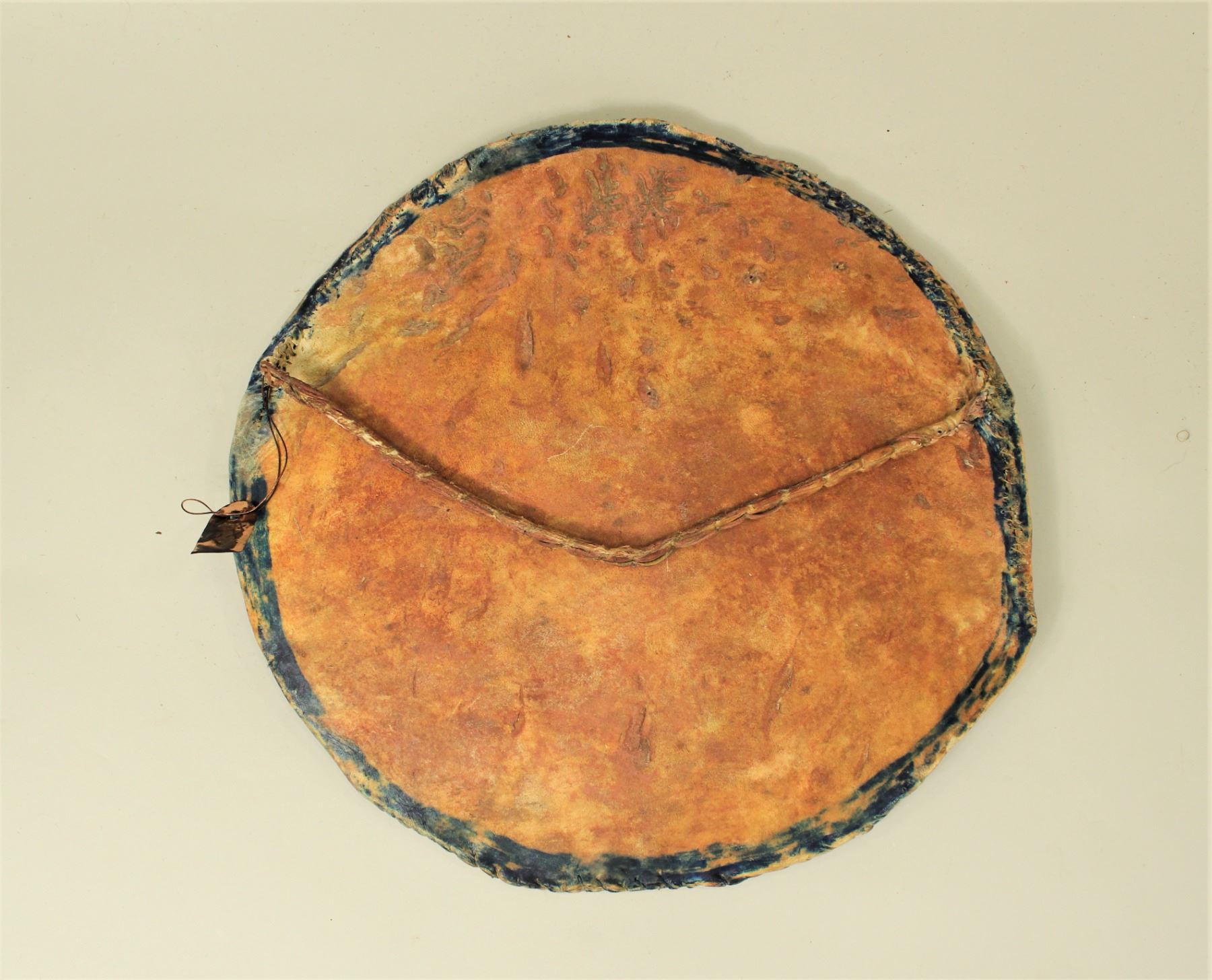 A highly sought after and very rare ceremonial dance shield, made of double-sided thick and heavy parfleche hide over an inner core. Showing as very attractive red ocre color throughout with bold blue spots. In very nice condition, and measuring 15" in diameter.