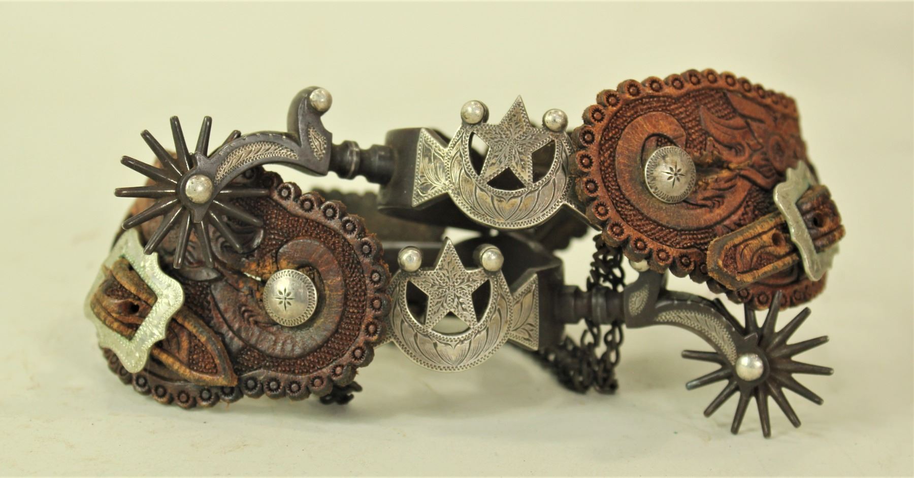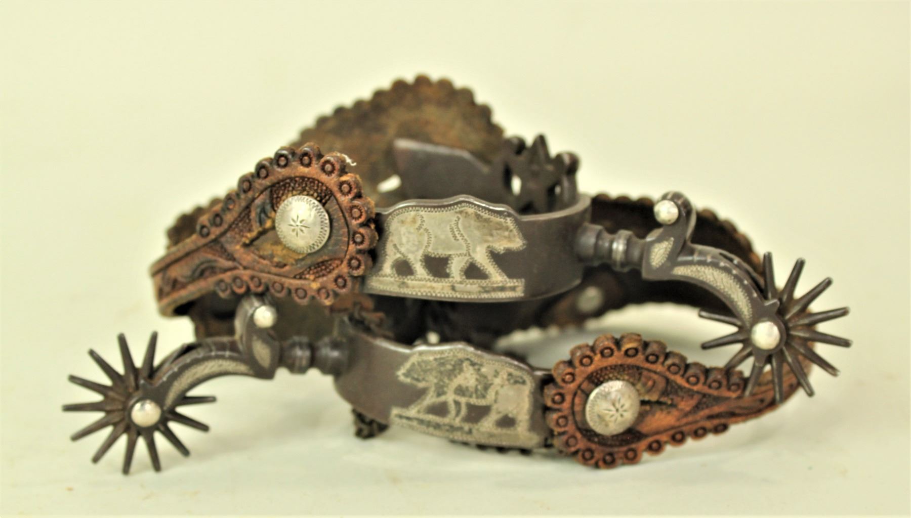 A breathtaking pair of double inlaid California style spurs in the G.S. Garcia Elko Star pattern with the California state bear inlaid on the off side. This pair of spurs is a masterpiece of art, with classic G.S. shanks and multi-point rowels. Finished by a pair of amazing straps with silver buckles.