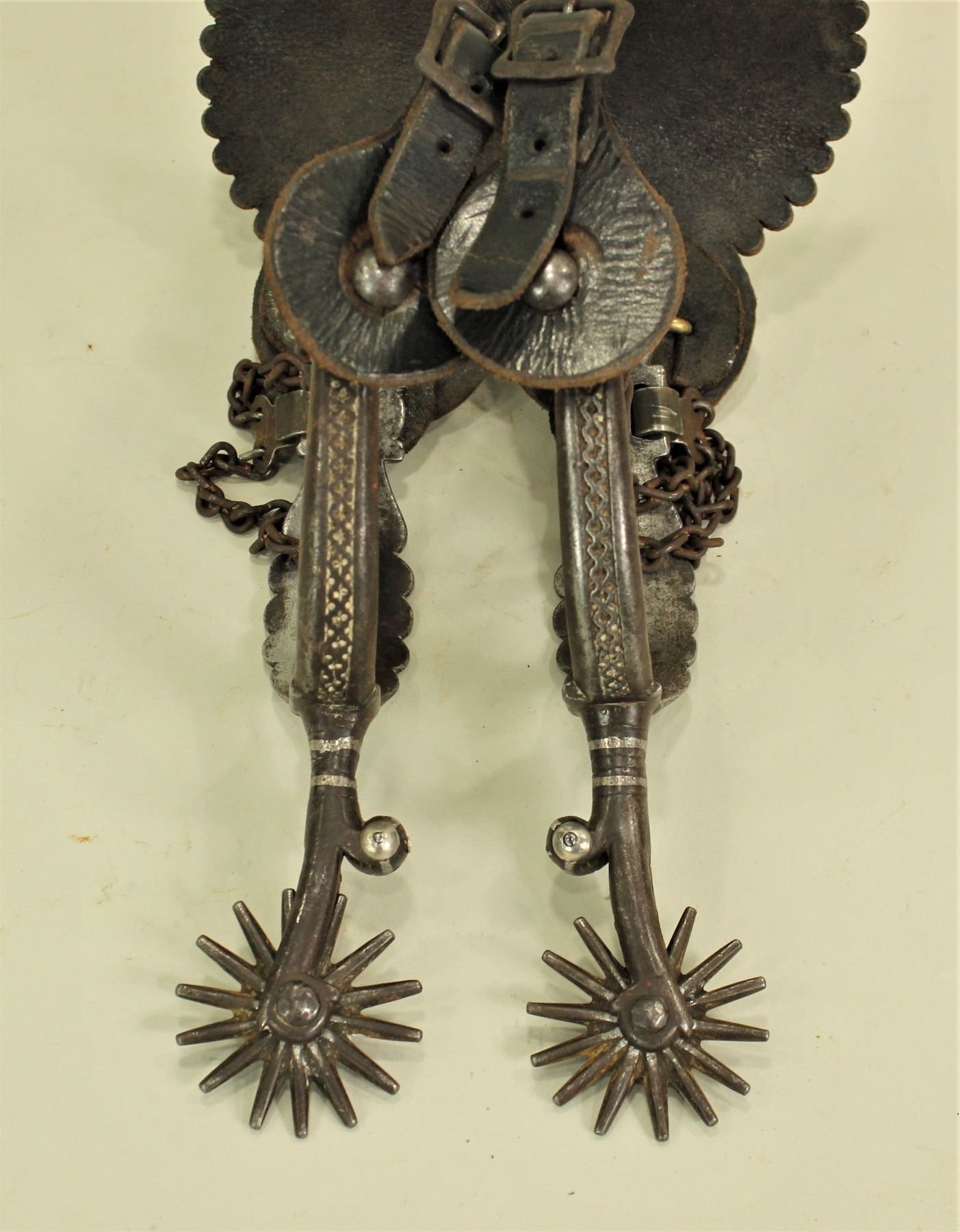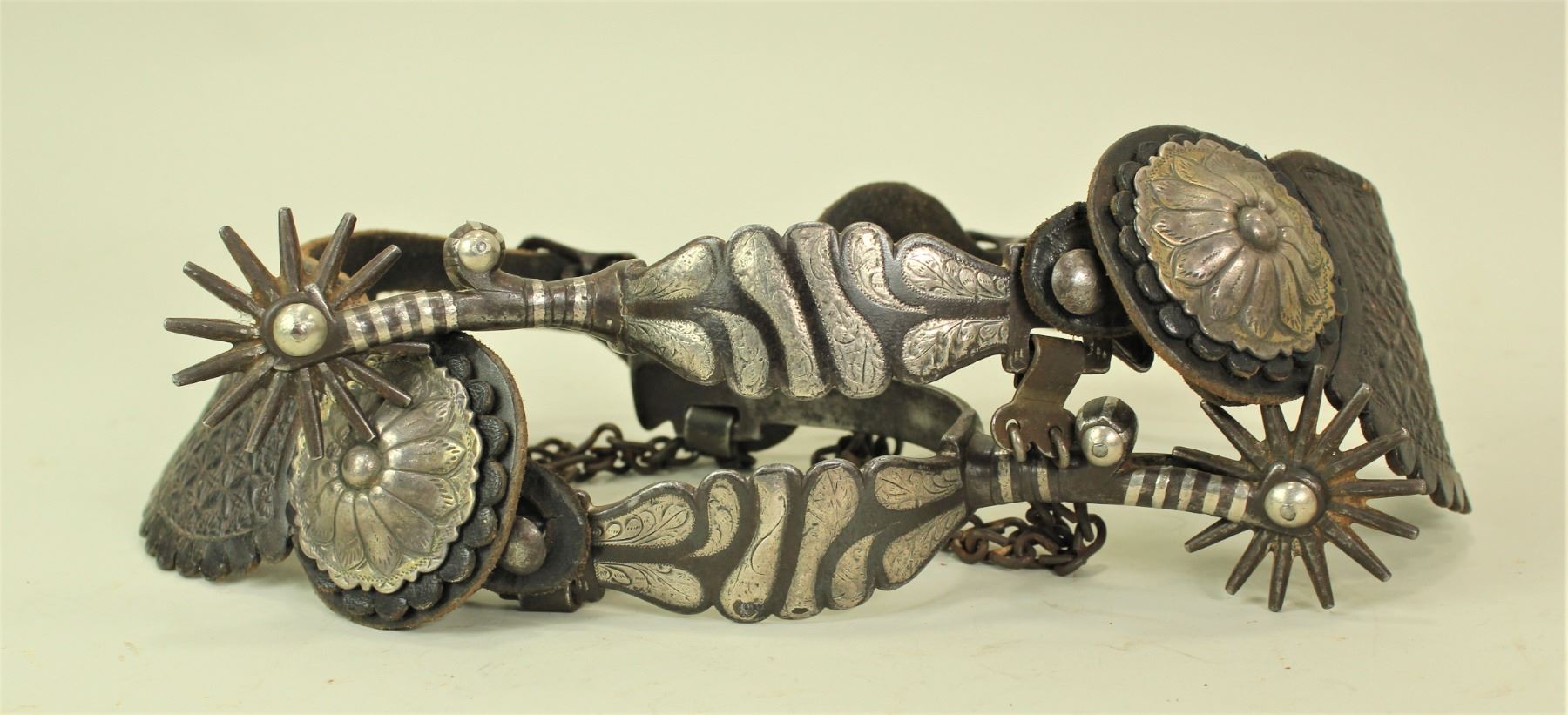 A very rare and early pair of large single mounted spurs with elongated silver striped shanks, large rowels, deeply chased iron offsides, great straps and highly desired inside heelband spelled out maker's marks.