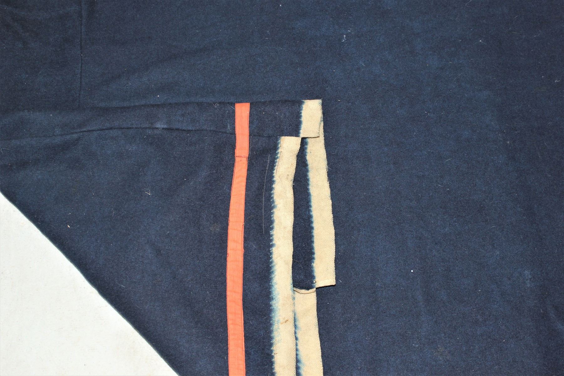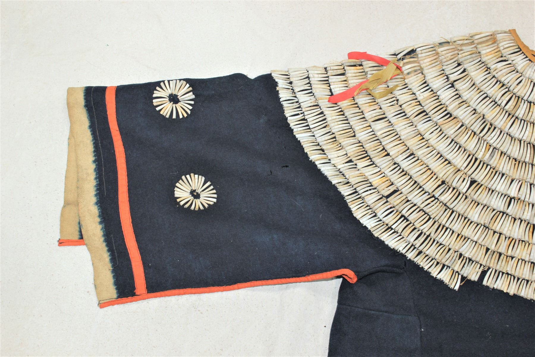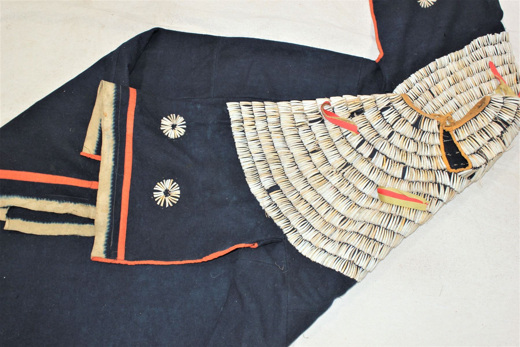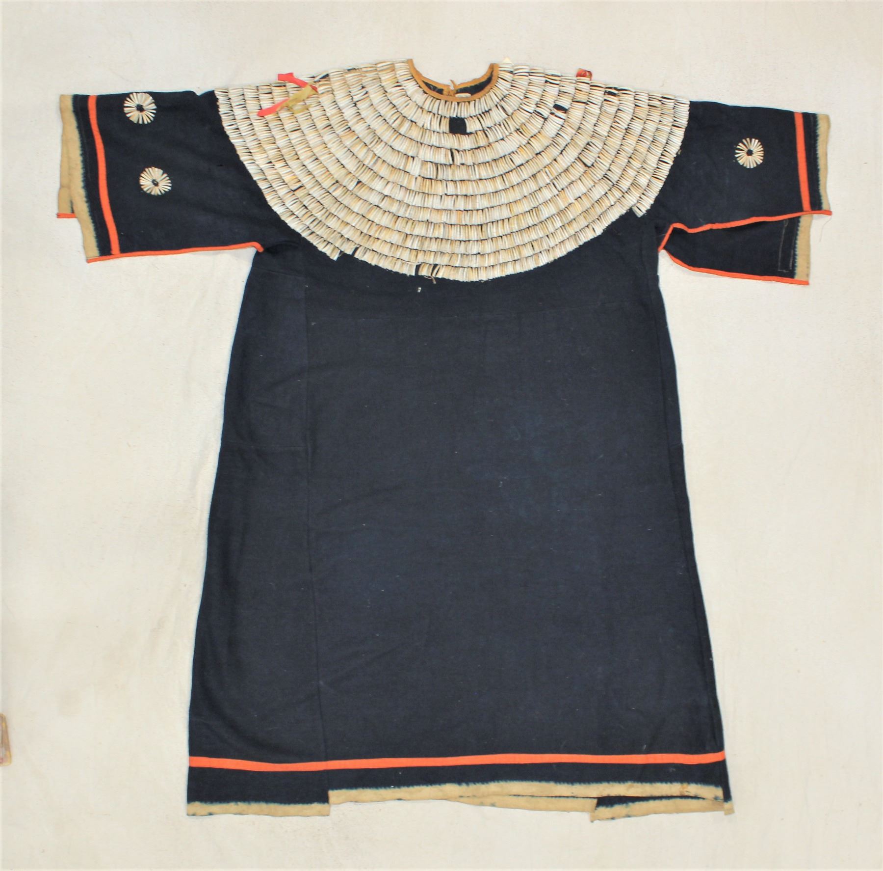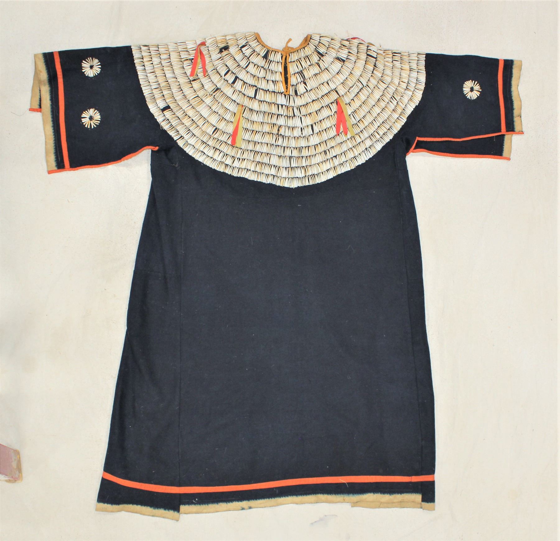 An eye-dazzling very early woman's size, large, trade cloth dress with great edges, and accented by incredible yoke fully styled with dentalium shells. In very nice condition.