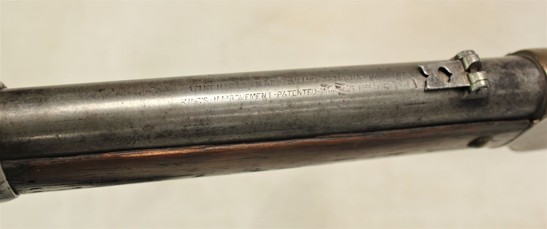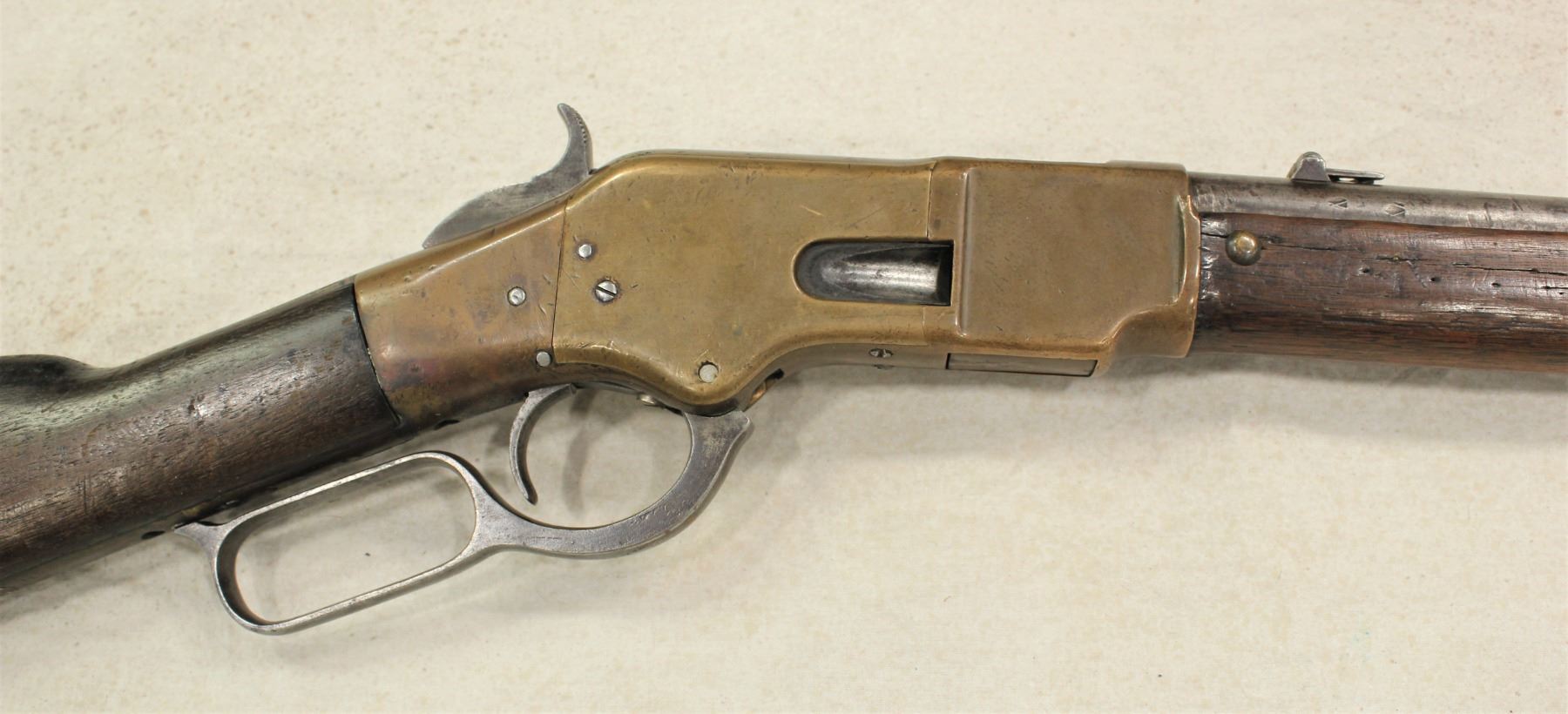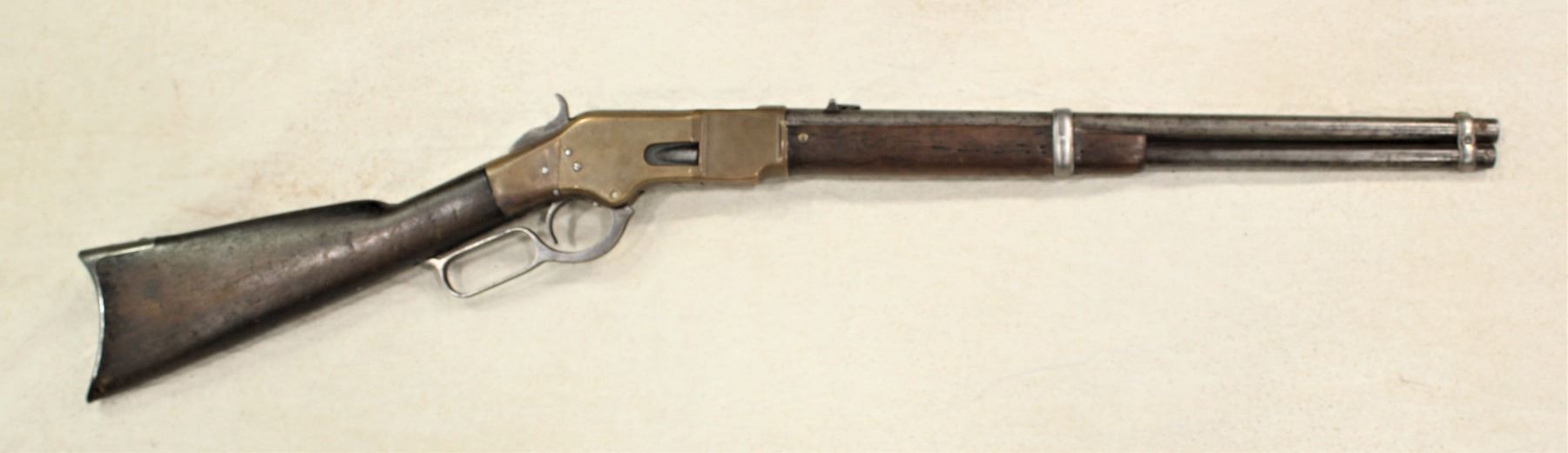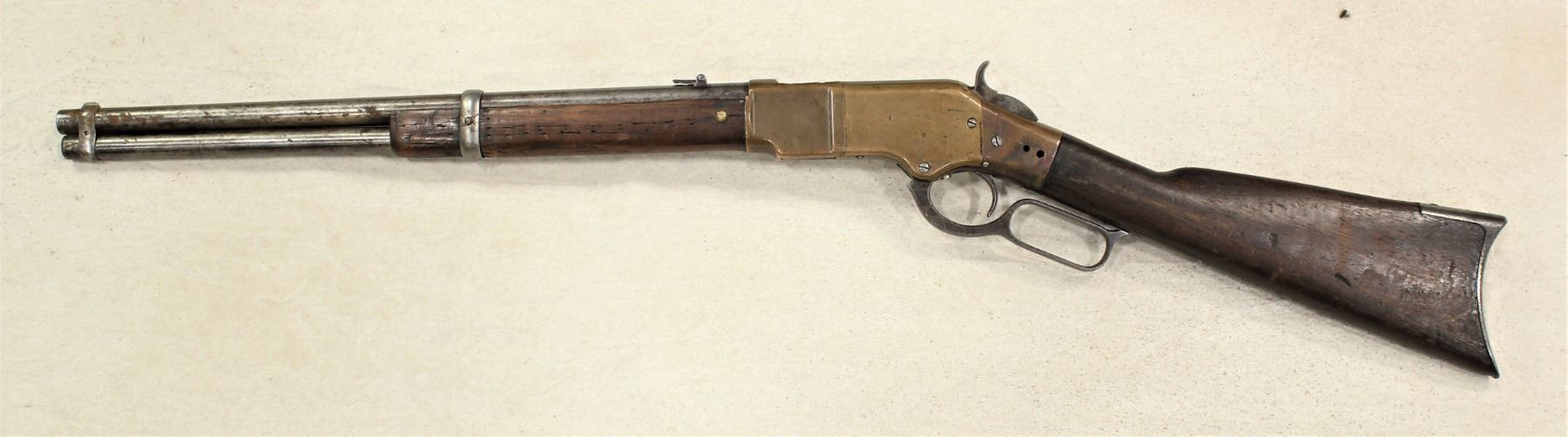 An Indian used 1866 carbine that has spent its life in northern Montana, in 44-40 caliber, this attractive carbine shows a beautifully patinaed brass receiver, crescent butt, removed saddle ring, repaired lower tang, and brass tacked forend, in good mechanical condition with repairs and evidence of missing tacks throughout the forend.