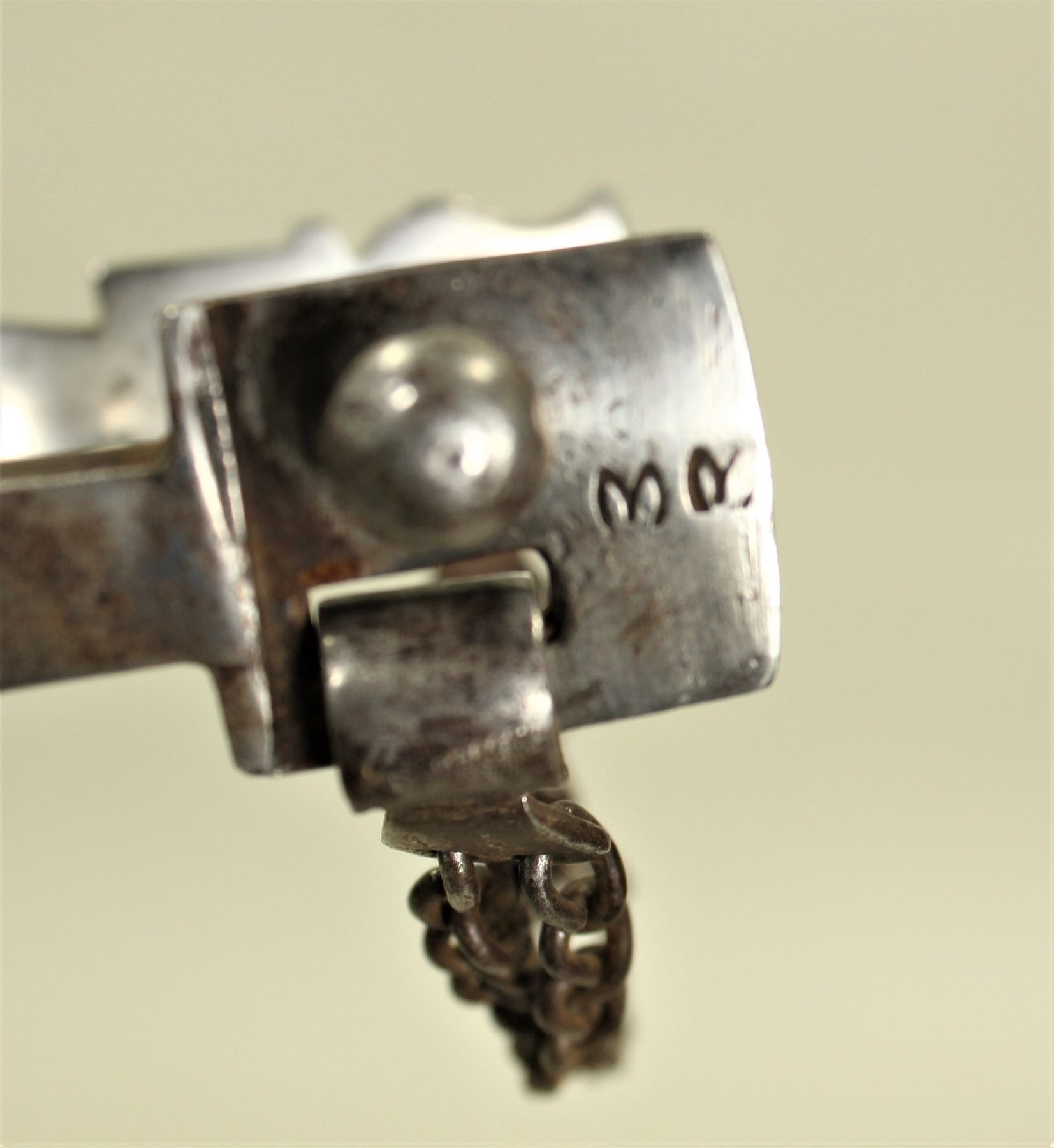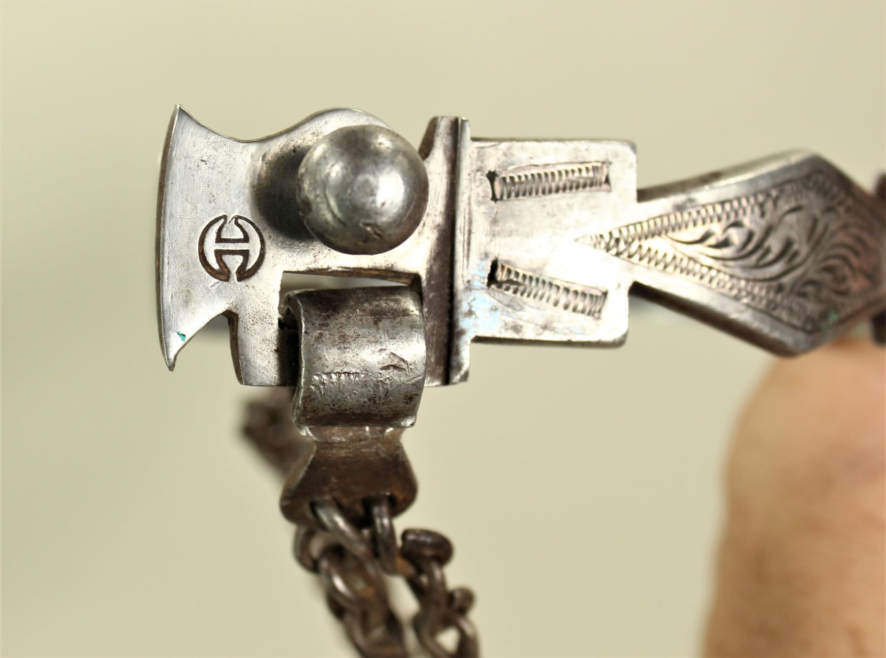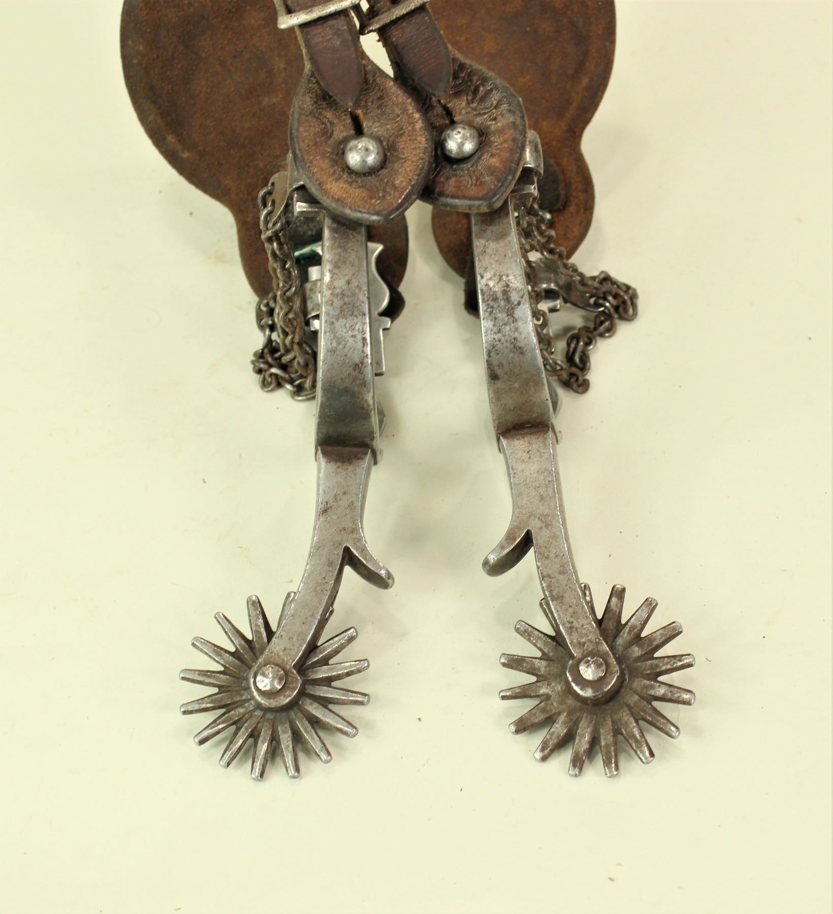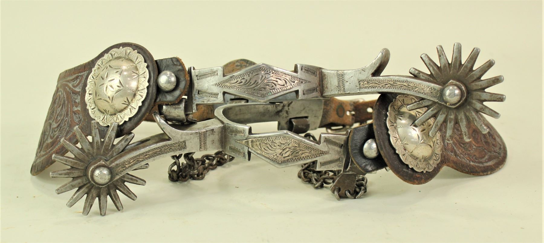 Very attractive pair of single inlaid spurs with iconic Hamley pattern, showing beautiful engraving and condition, finished with a great pair of flower tooled straps, and both bowed "H" and squash "M" marks.