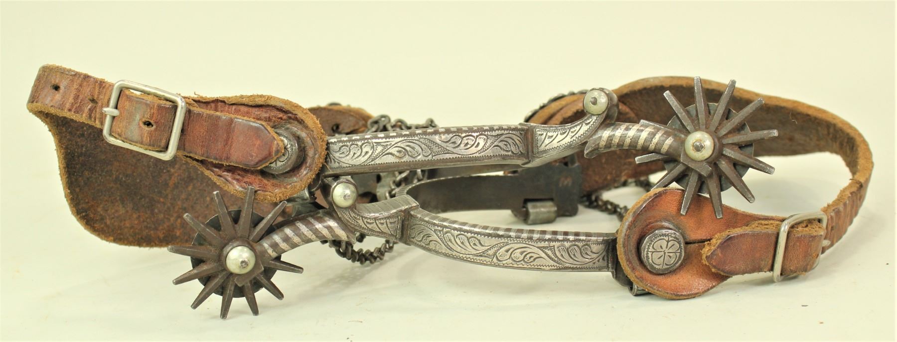 An exceptional pair of dazzling double mounted spurs, with finely detail engraved silver on one side and inlaid Greek key pattern on the other, accented by fabulous candy striped shanks, silver rowel covers, inlaid strap buttons, original straps and squash "M" maker's marks.
