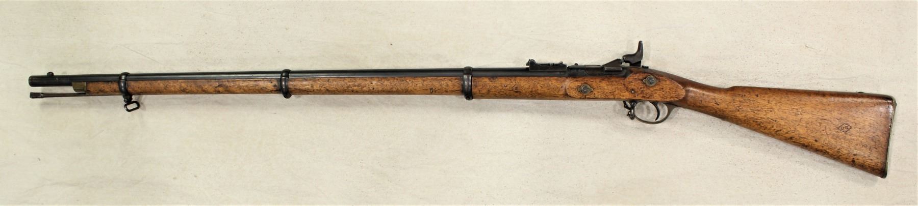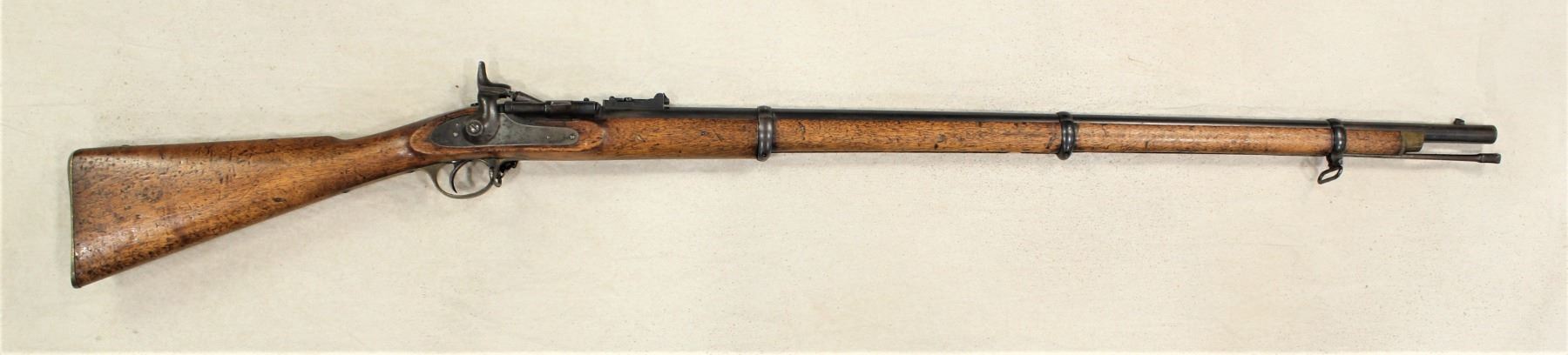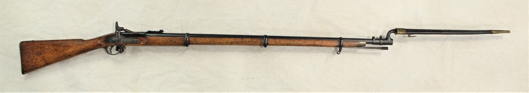 1863 dated lock with Enfield markings. Full length military lock with 3 barrel bands and “DC” cartouche in stock. Excellent bright rifled bore with blue finish on barrel. Triangular socket bayonet with leather scabbard. CONDITION, Very fine with excellent bore and properly operating lock. Full sized solid stocks with crisp markings.