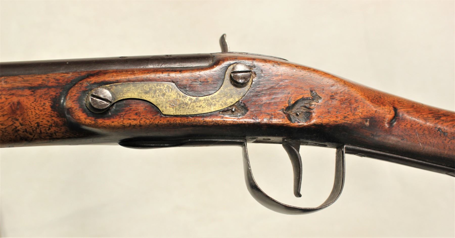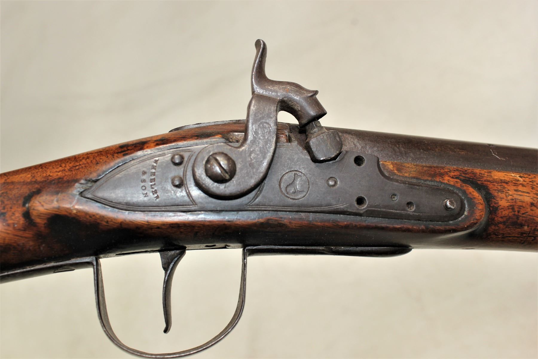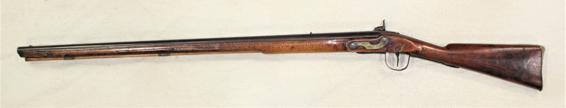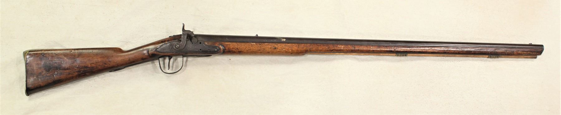 A conversion trade rifle, percussion from flintlock. 69 caliber arched lock marked “WHEELER & SON” 37 inch tapered round barrel with blade front sight and fixed rear sight. Full stock with brass butt plate and iron trigger guard. 2 brass wiping rod guides. Circa 1850. Good overall condition with pleasant brown patina. Lock functions properly. Wood stock is fine.