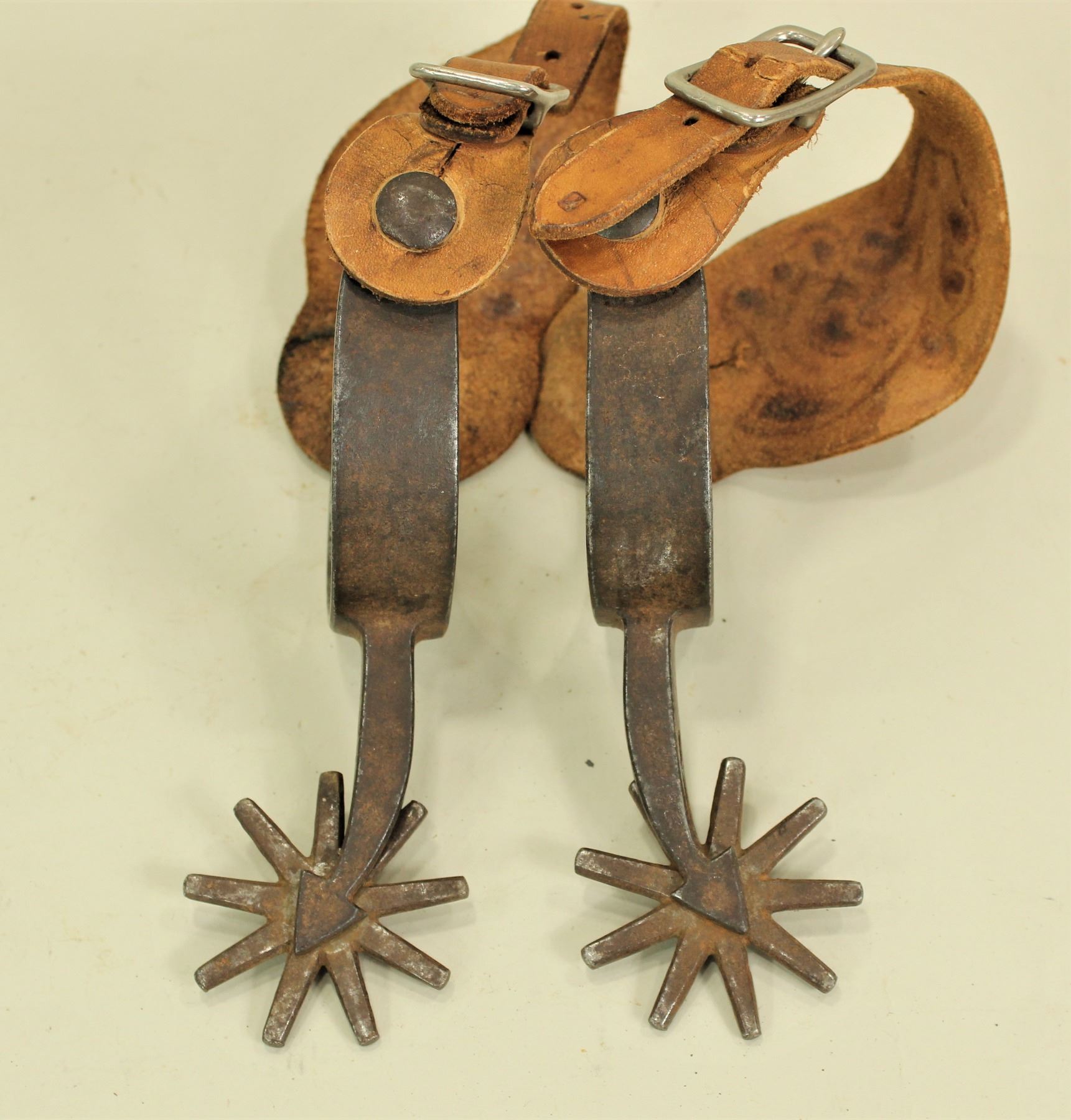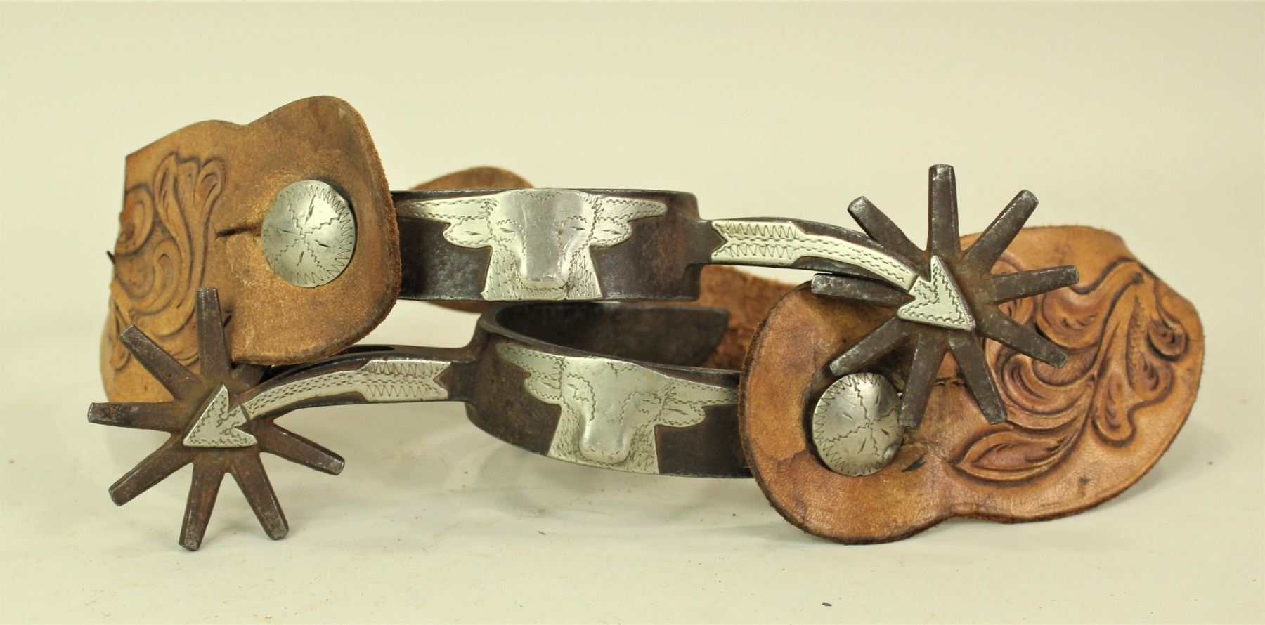 Fantastic pair of early bull head spurs, single mounted with great heads and large rowels, Showing out of the closet condition and nice inside heelband marks.