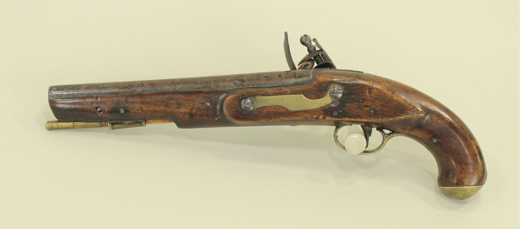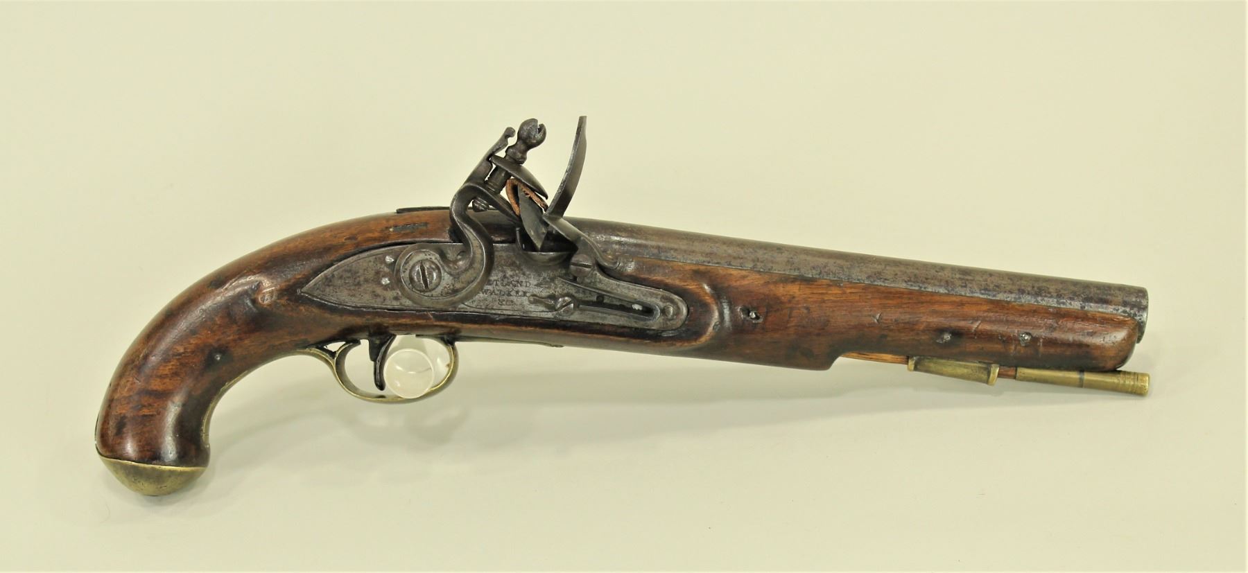 65 caliber smoothbore round barrel flintlock with 9-1/4” barrel. Lock marked “KETLAND WALKER & CO” with London proofs. One piece wood stocks with brass furniture and single rod guide missing loading rod. CONDITION, Good with full sized wood stocks and pleasant plum patina finish. Lock operates properly.