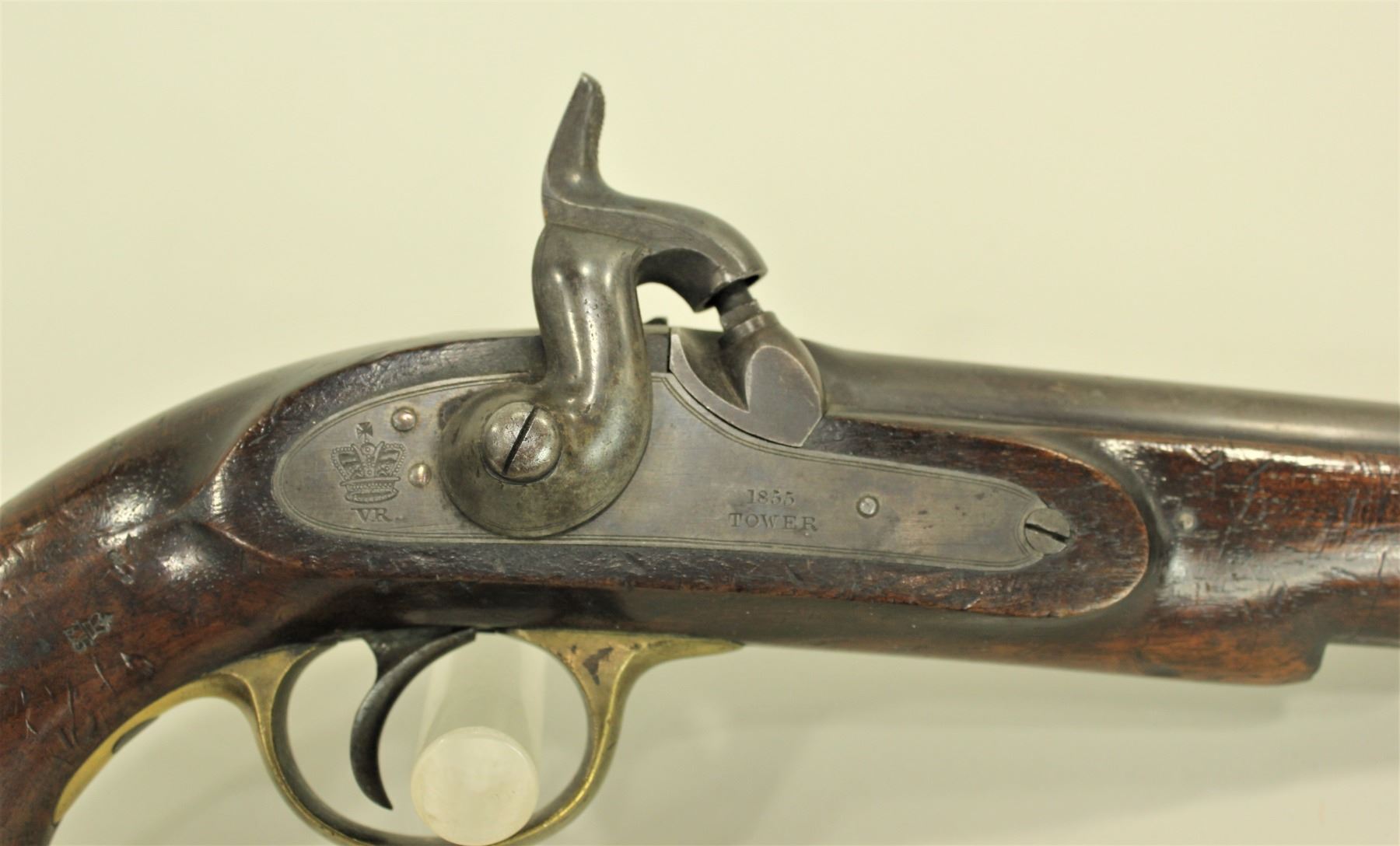 .58 caliber rifled round barrel with bridled loading rod. Case colored lock dated 1855 and marked “TOWER” with “VR” Royal cipher. One piece oil finished walnut stock with brass fittings and lanyard swivel. CONDITION. Very fine with excellent wood and fine rifled bore. Action operates properly.