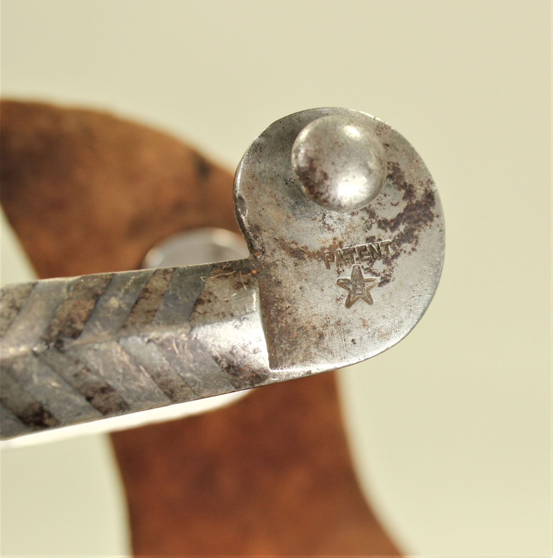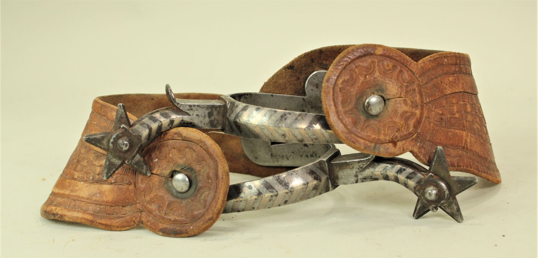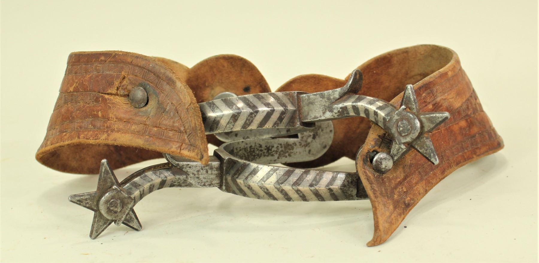 Good looking pair of large double mounted chevron pattern spurs with great maker's marks, untouched condition and original straps.