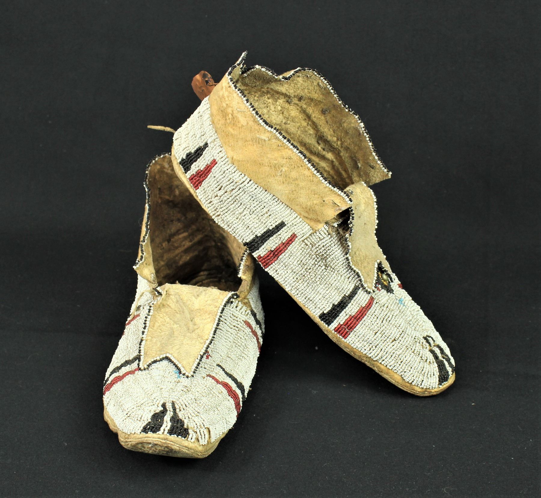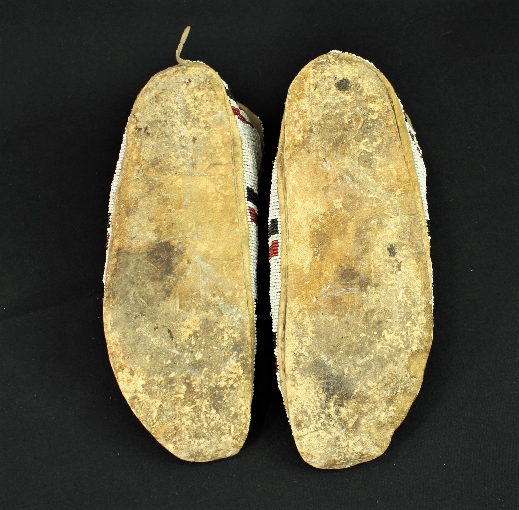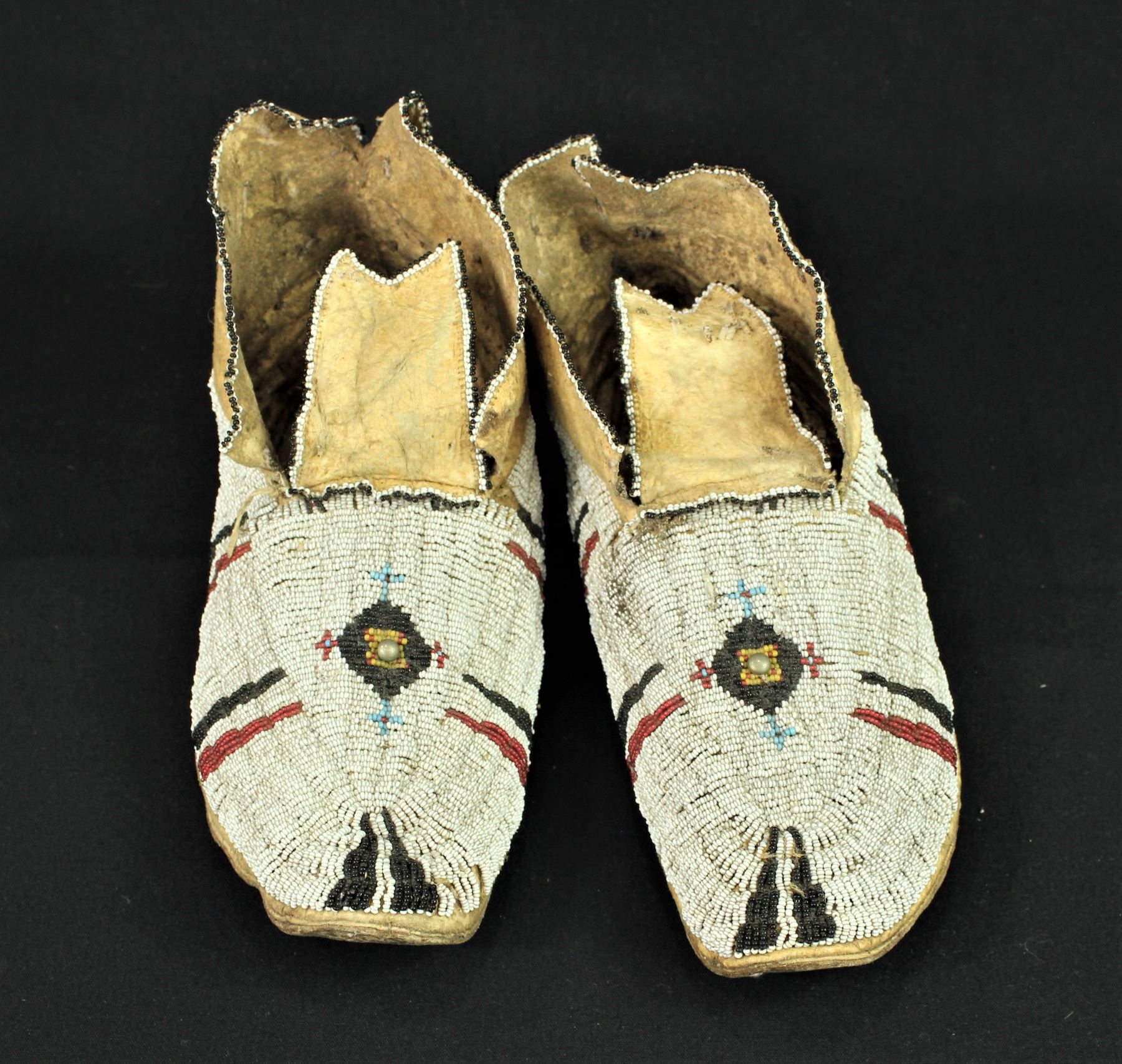 A unique pair of man's size, extensively beaded Comanche style moccasins with beaded tongues, styled beadwork that centers around a metal stud medallion and finished with parfleche soles. In very nice condition.