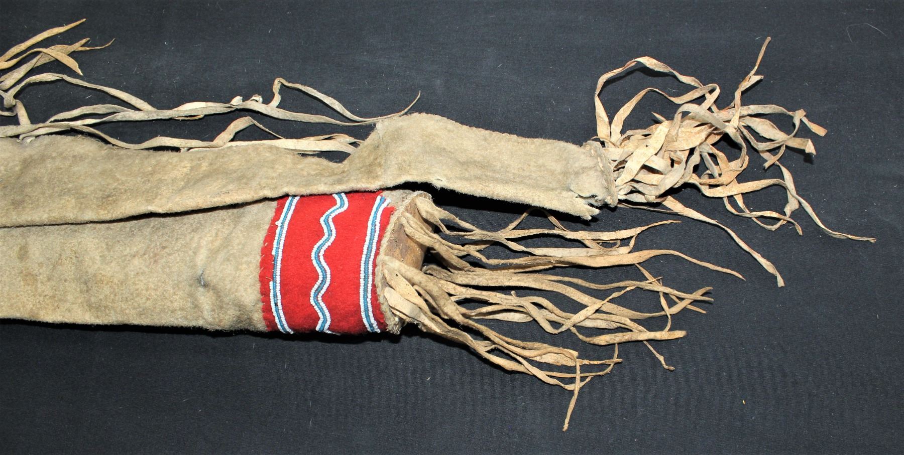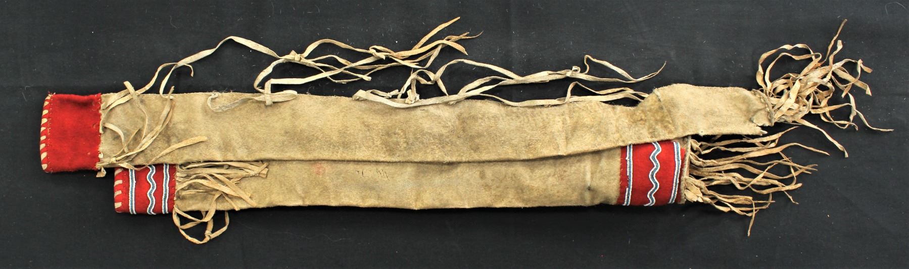 A beautifully authentic untouched 19th Century quiver and bow case, having wonderful fringe, and trimmed in beaded early trade cloth. Measuring 35" in length.