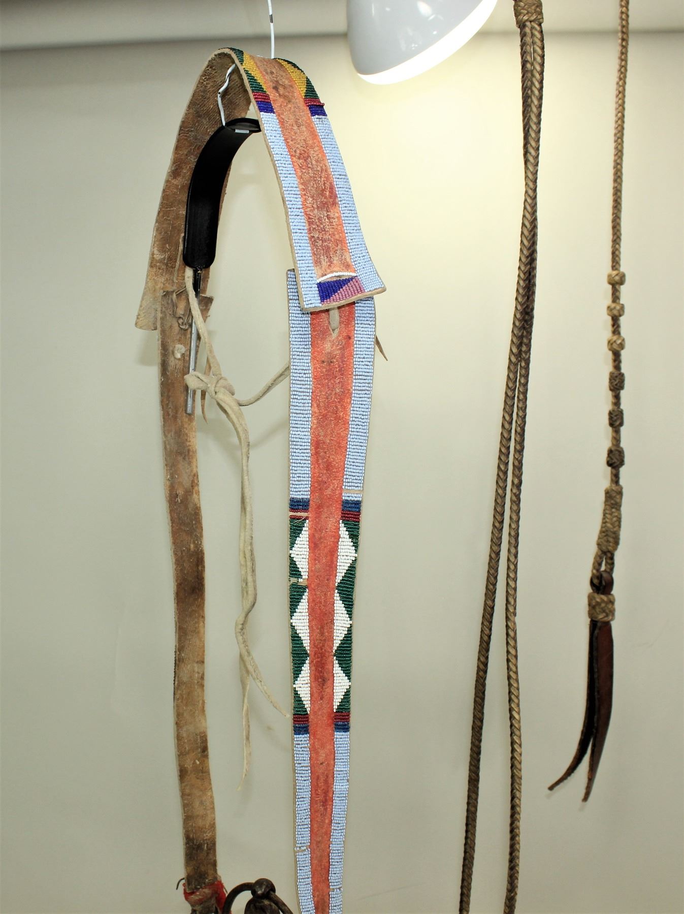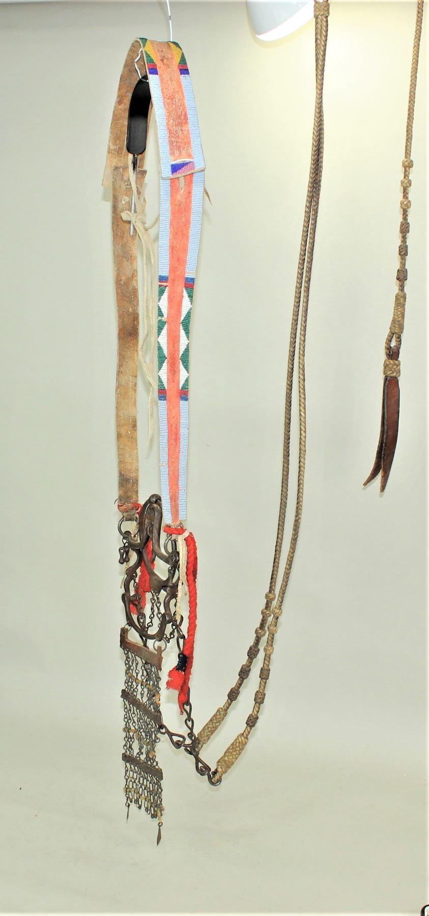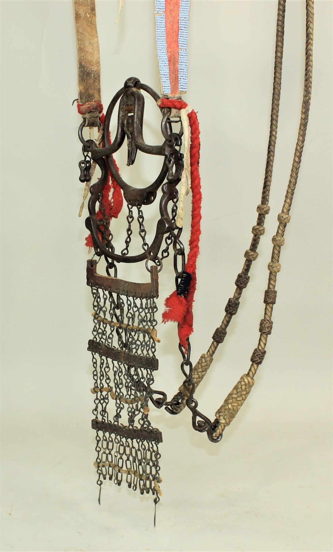 A colorful eye popping bridle with incredible beadwork done on red ocre colored hide, highlighted by an amazing Mexican style iron ring bit with elongated chain lip bar drops, and finished with braided rawhide romel reins.