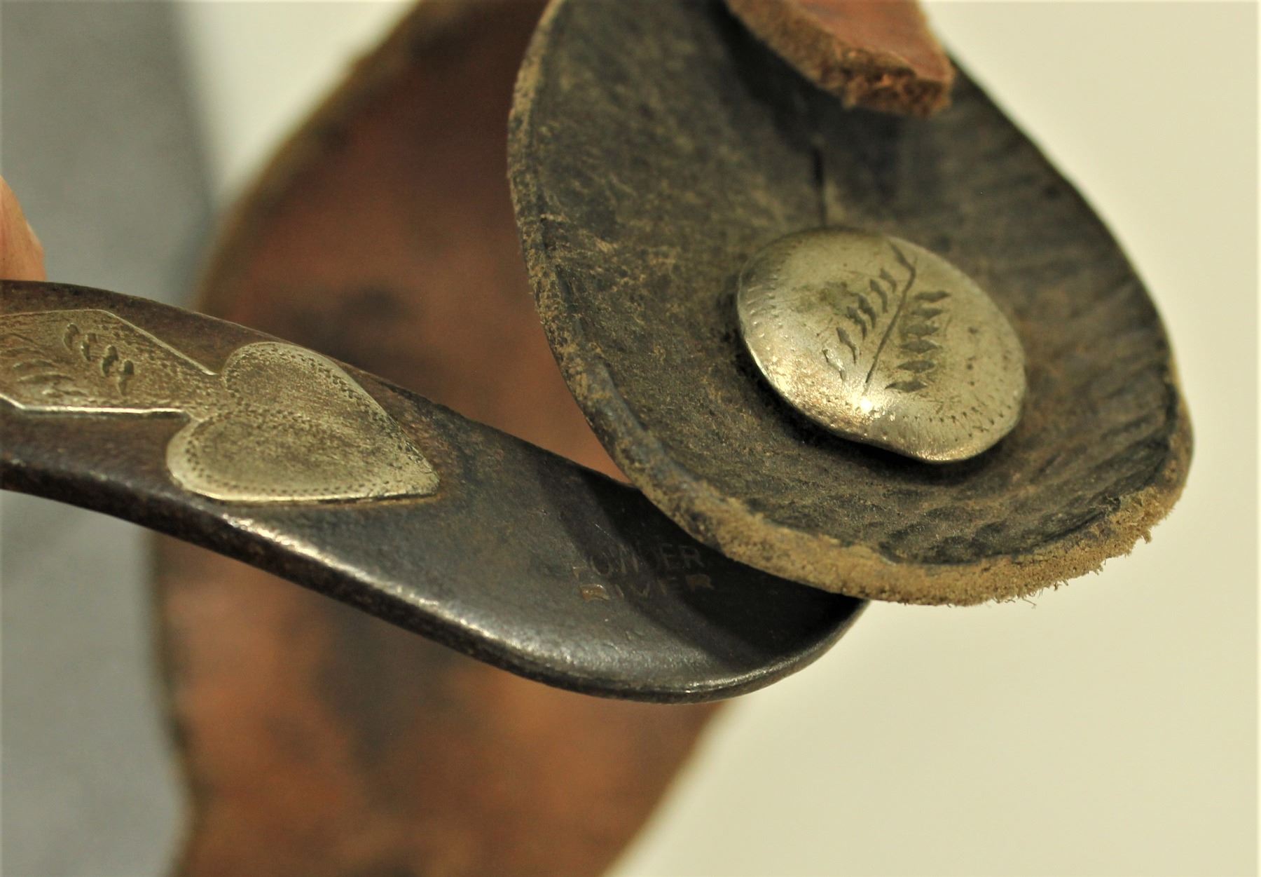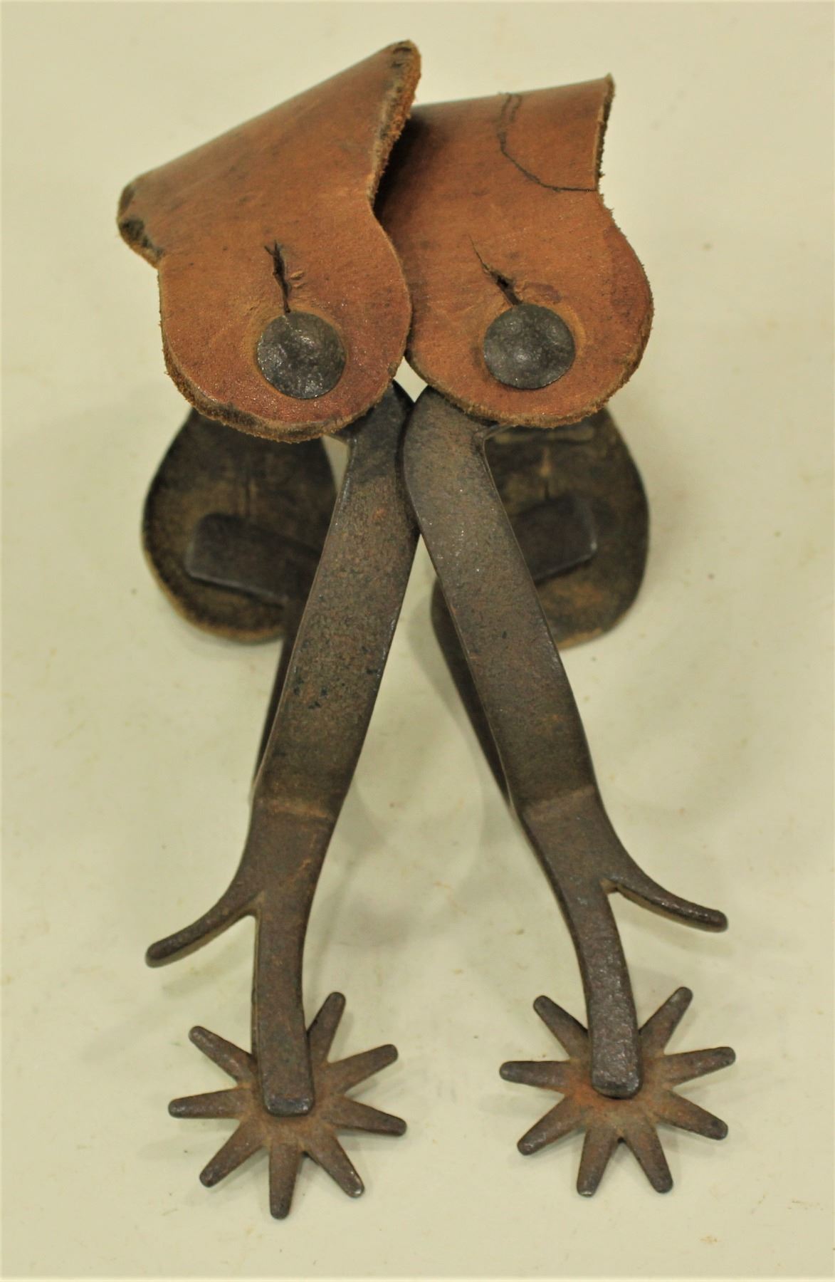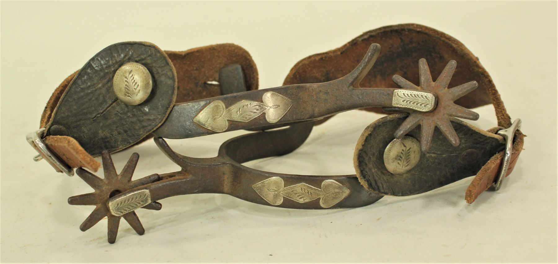 A classic pair of single mounted spurs with attractive silver work and great chap guards.