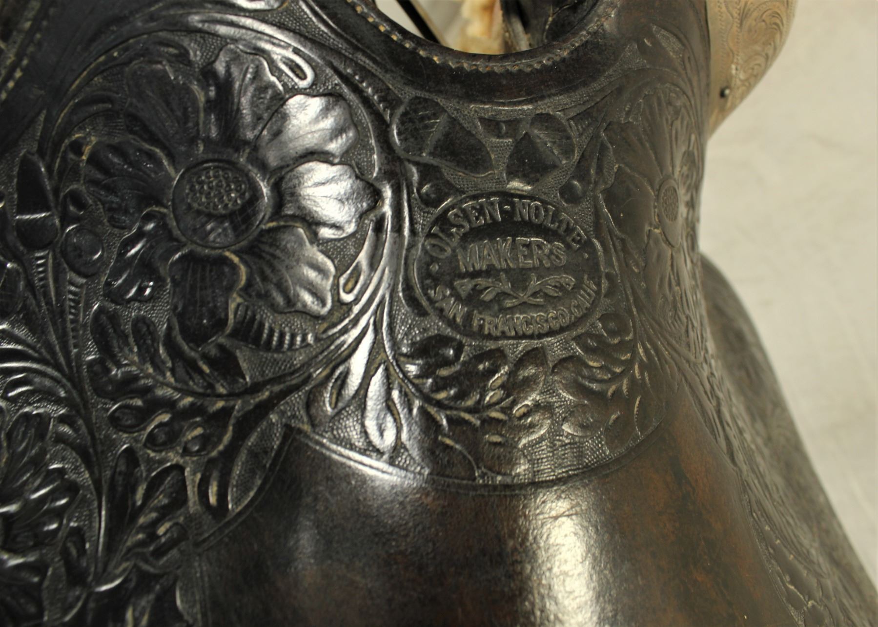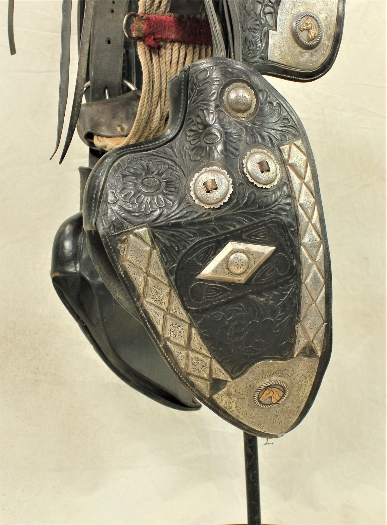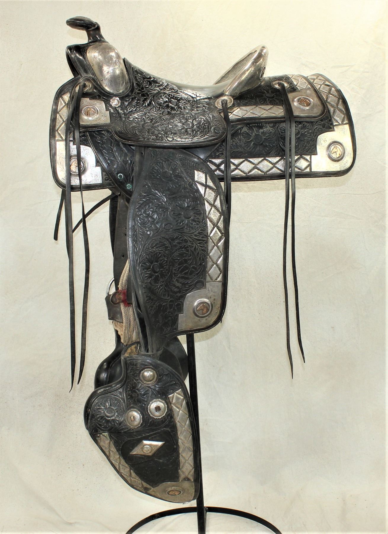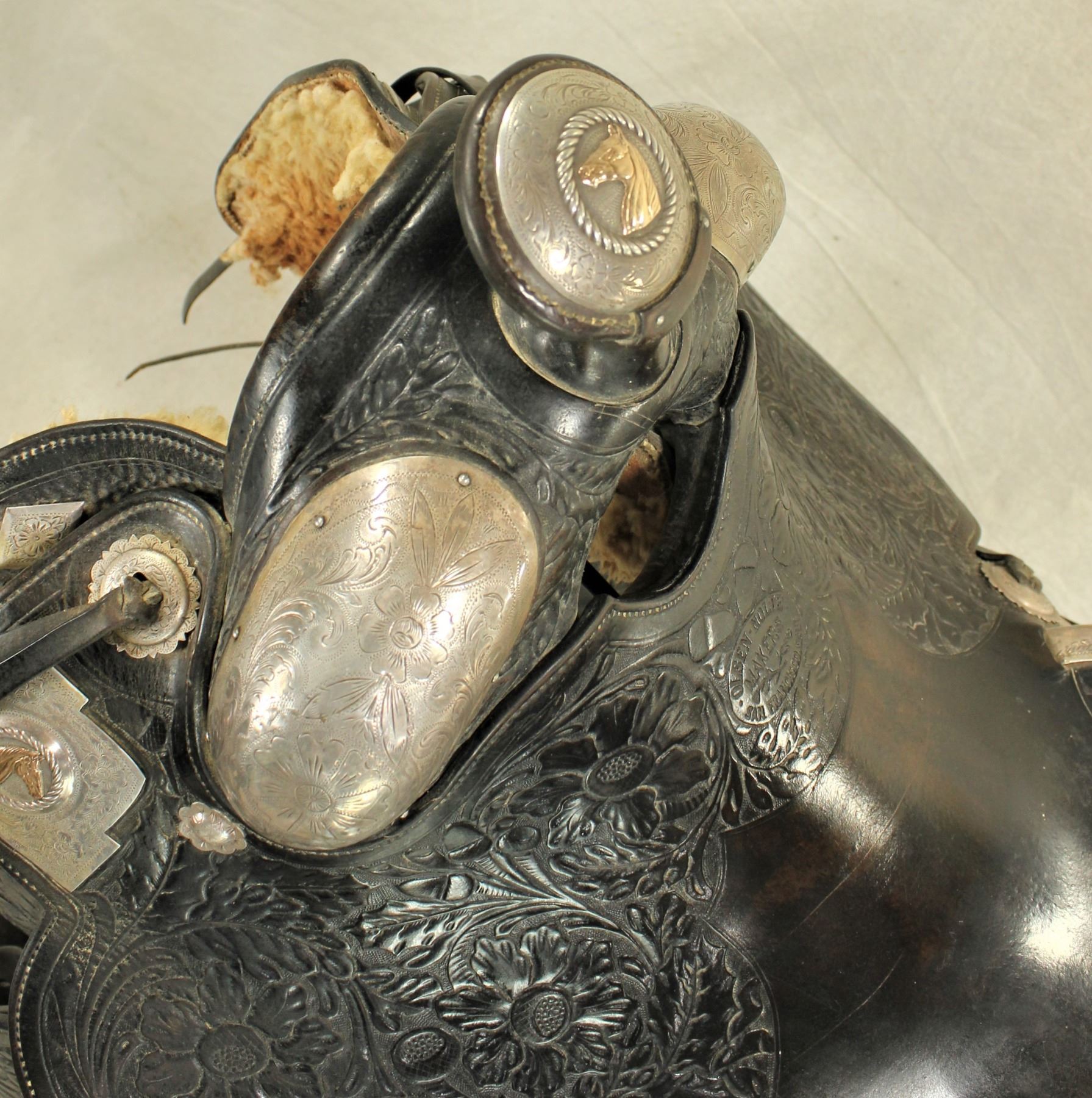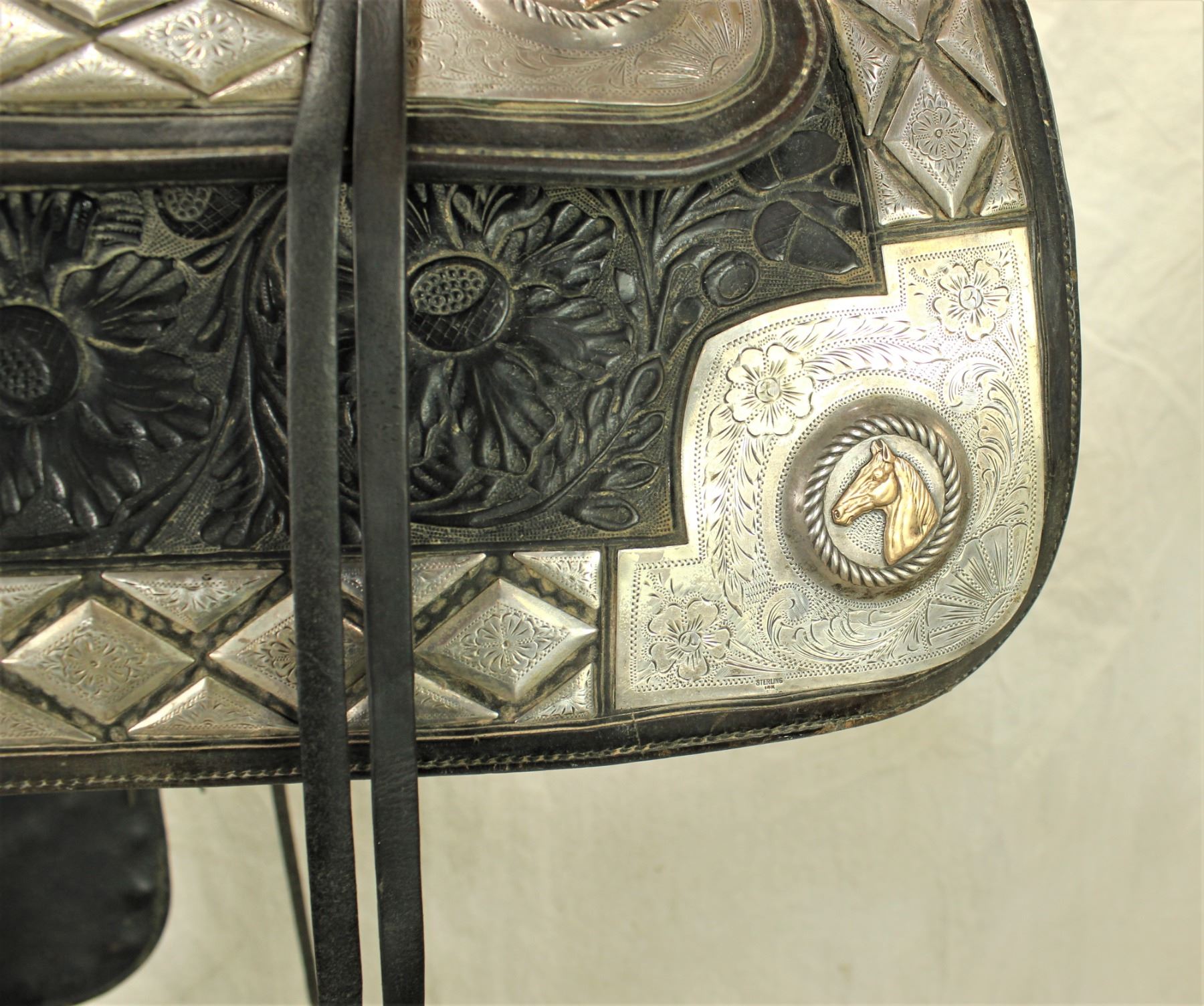 Showing a great profile and presence, this silver mounted parade saddle displays large corner plates with gold horseheads tied together by silver diamonds throughout the whole perimeter, with a silver bound cantle and swells, and topped off with 20" long tapaderos, and seat measuring 15 1/2".