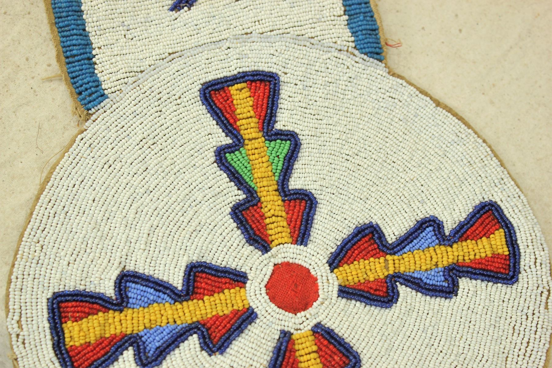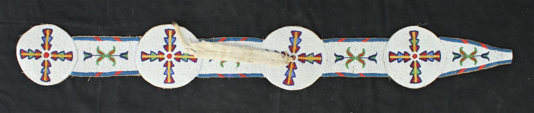 An extraordinarily large Northern Plains beaded blanket strip with geometric and floral designs beaded throughout over four large medallions, topped off with a white weasel hide embellishing it. In great condition with bright color.