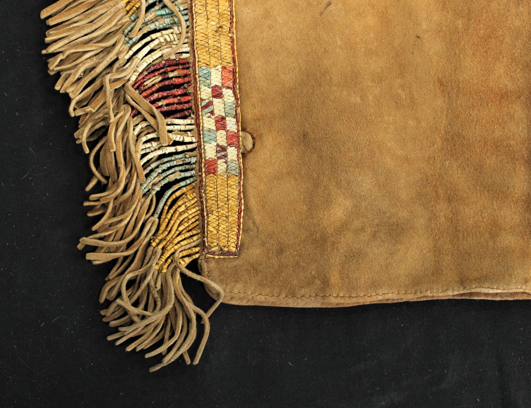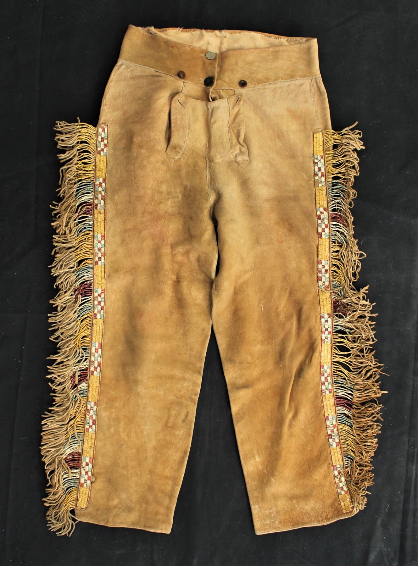 A pair of leather pants, beautifully edged with an artistically quilled panel along with finely quilled fringe running the full length of each leg. Displaying wonderful condition, age, and patina.