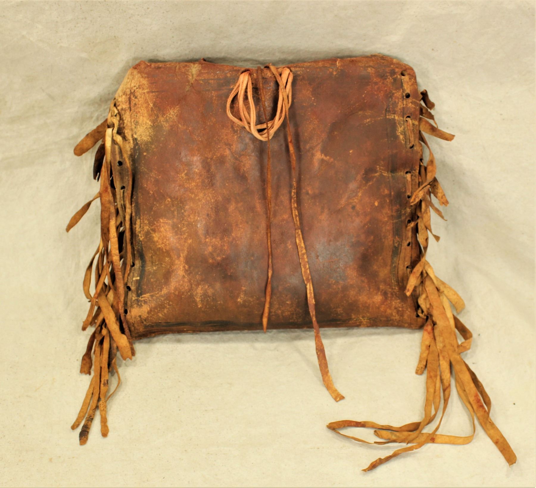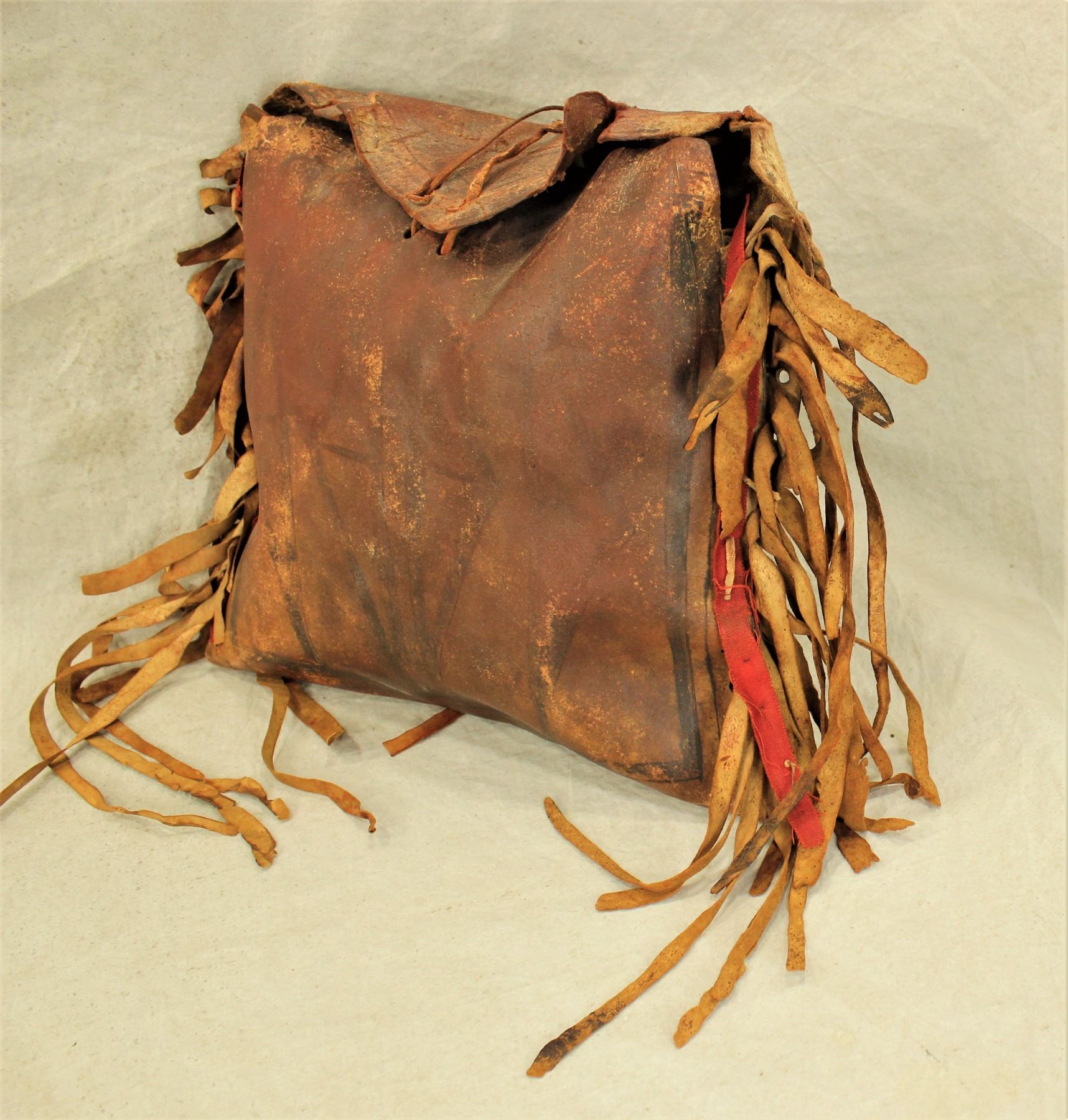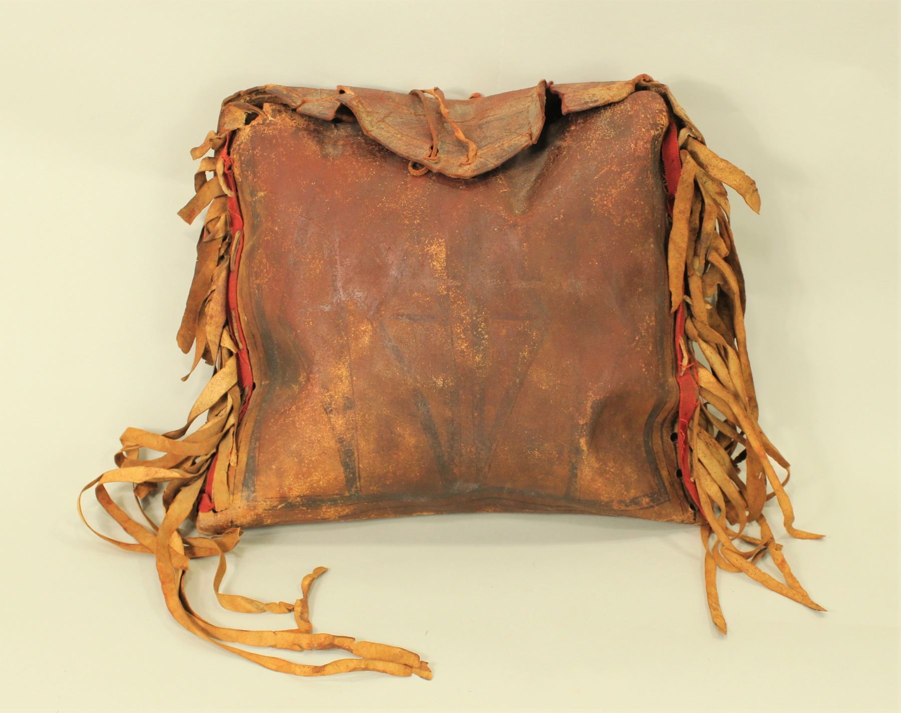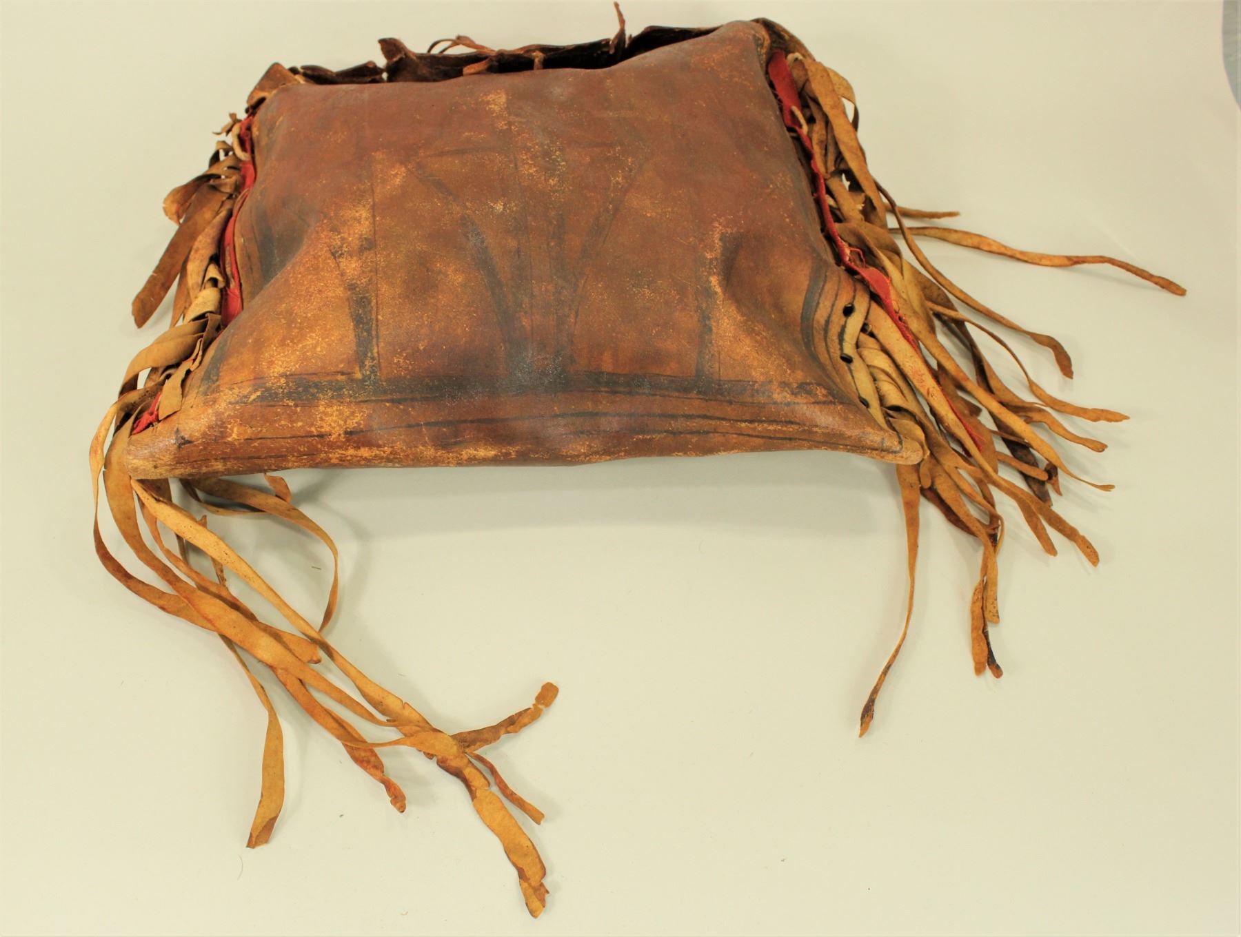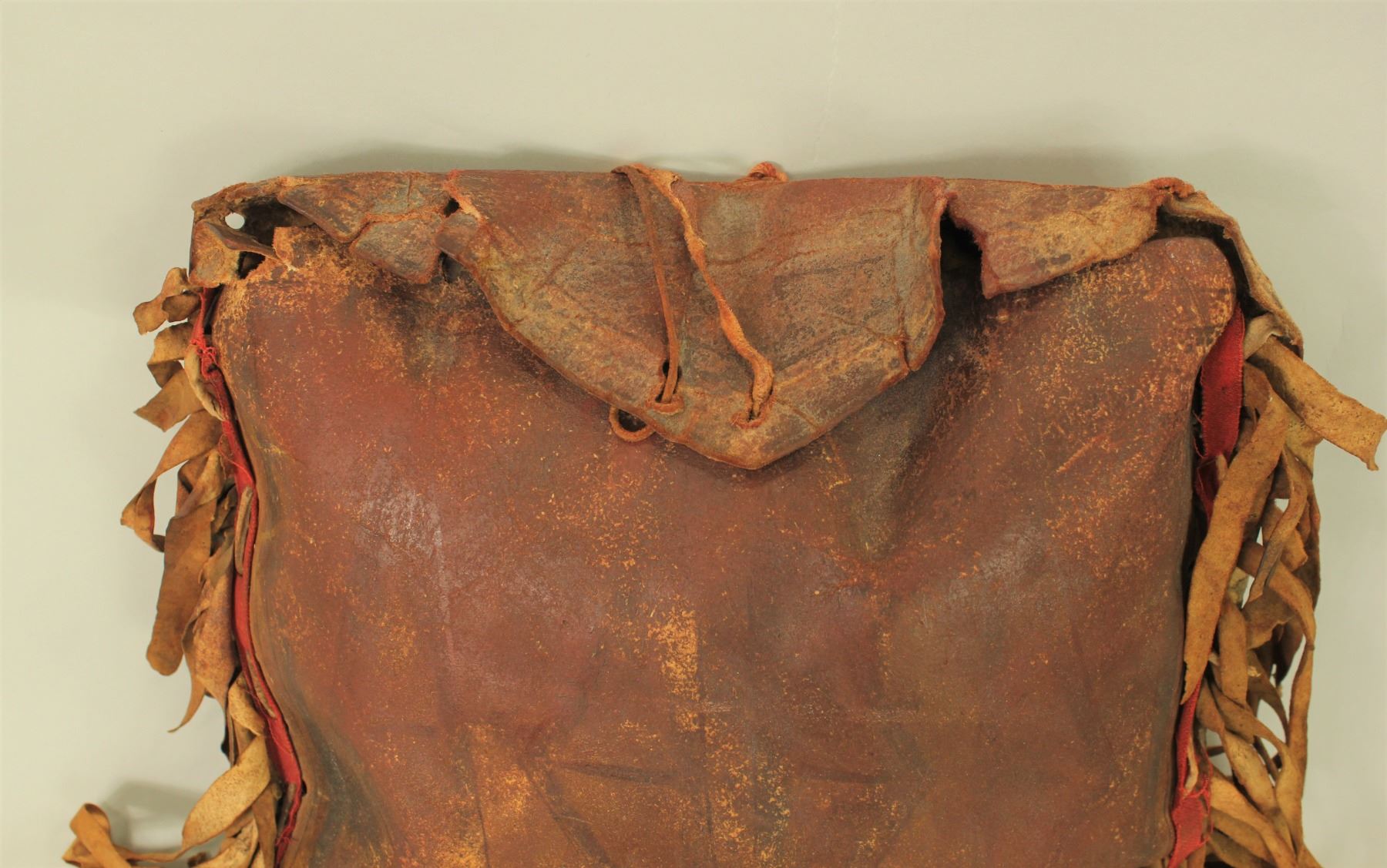 An interesting richly colored parfleche, possible styled bag with geometric design stenciled throughout, and adorned by trade cloth and long -fringed sides, with measurements of 13" x 12".