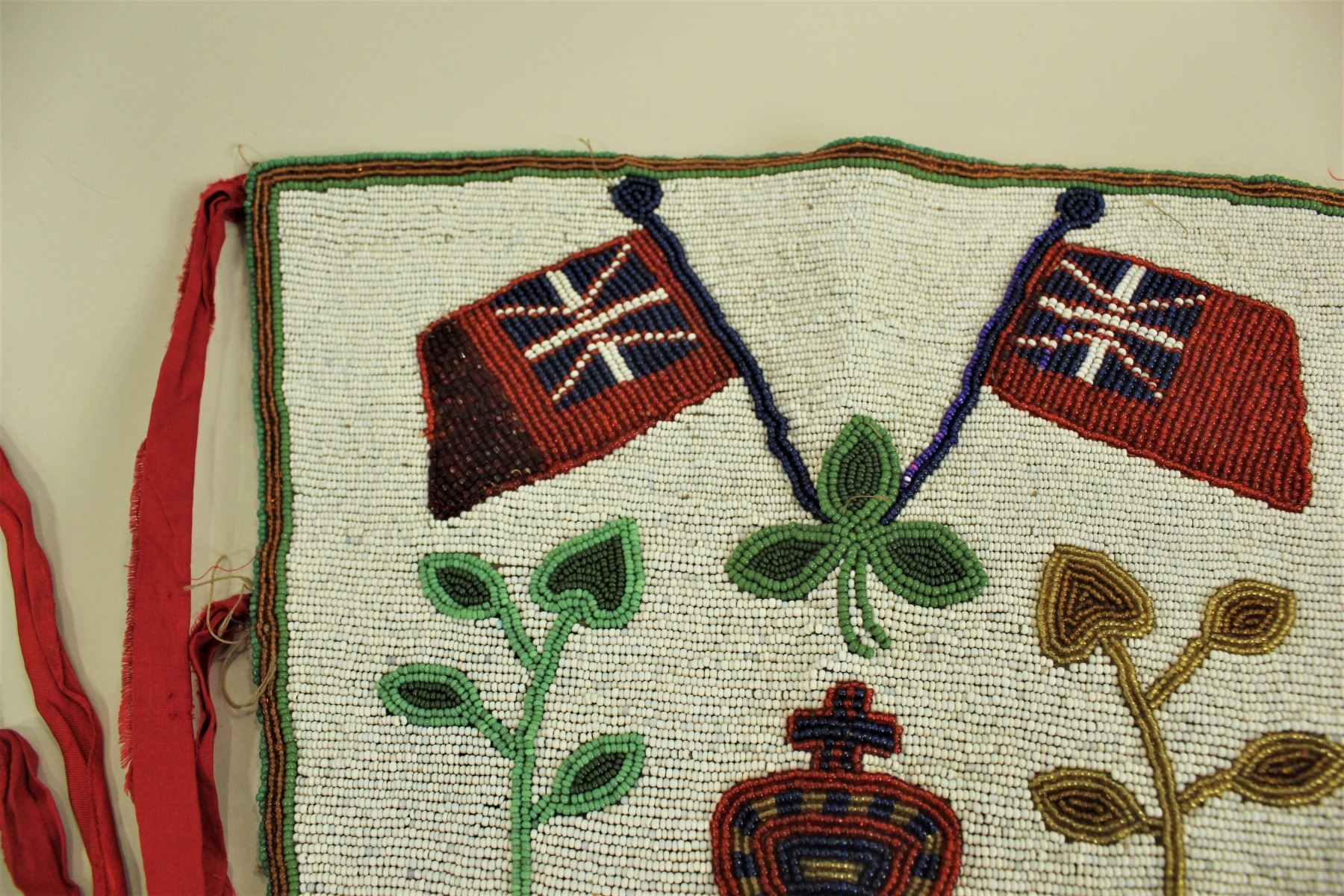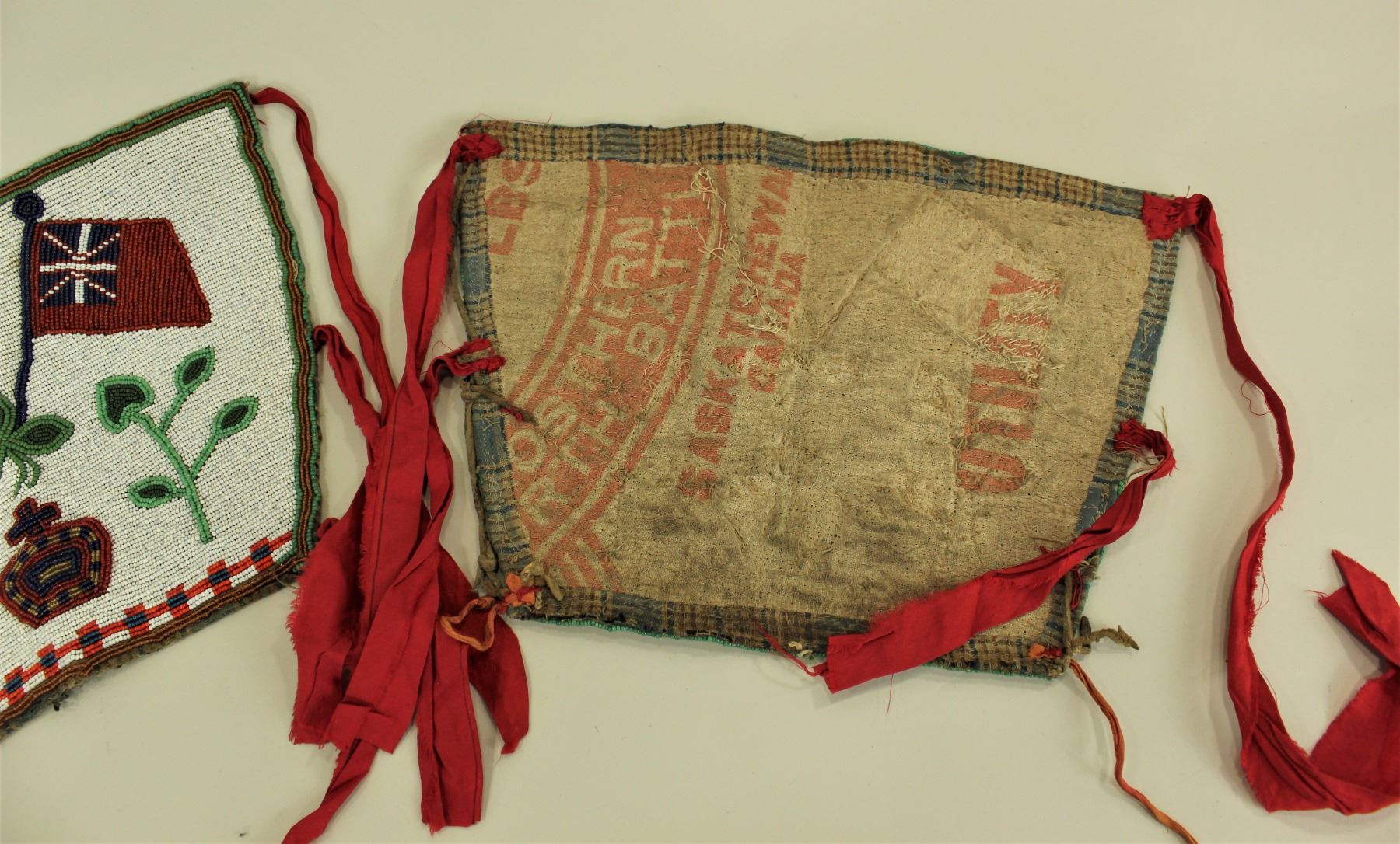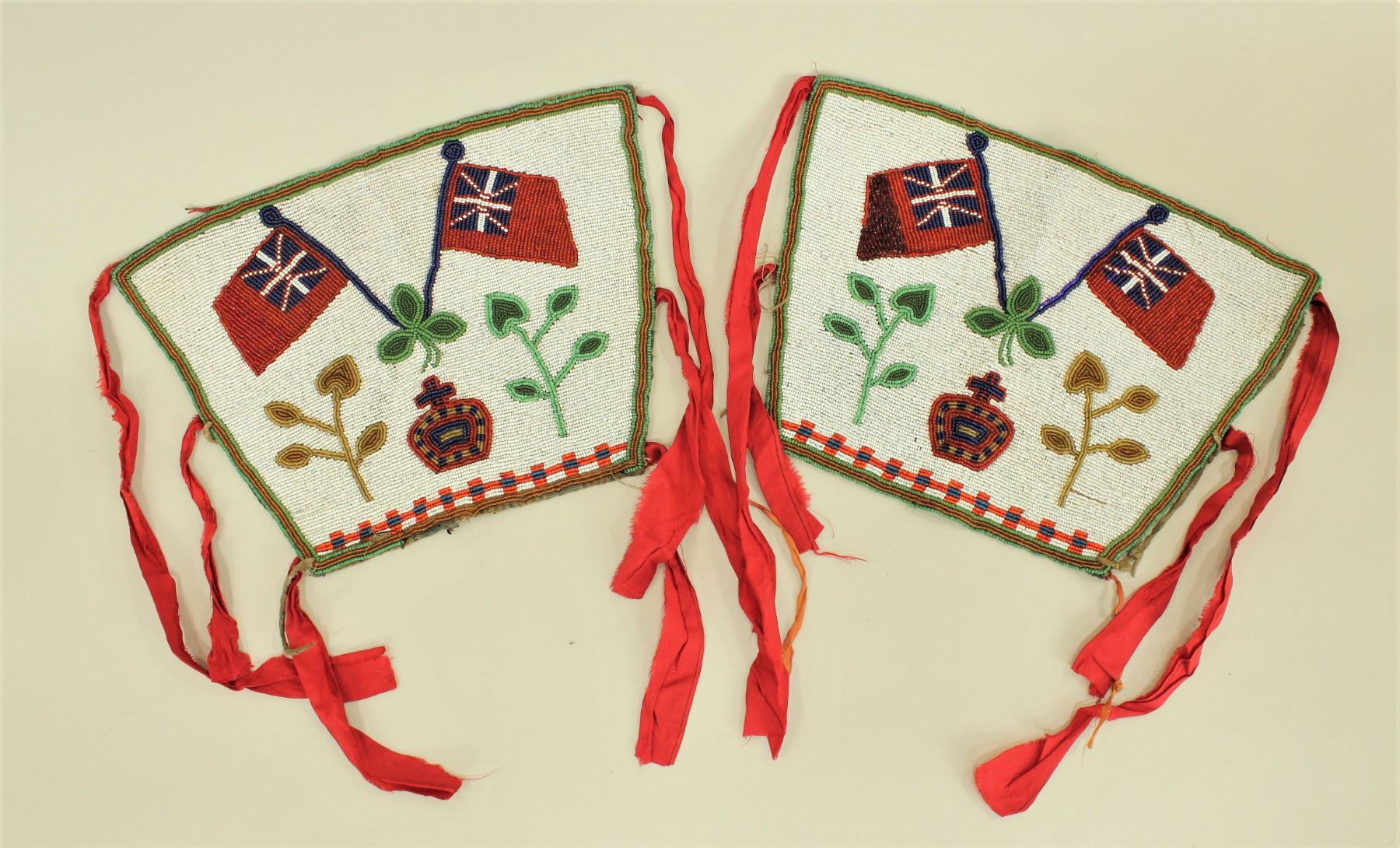 An out of the ordinary item, a pair of Blackfoot Indian beaded leggings made for a Canadian Mounted Soldier with British flags beaded onto a white background with ribbon ties.
