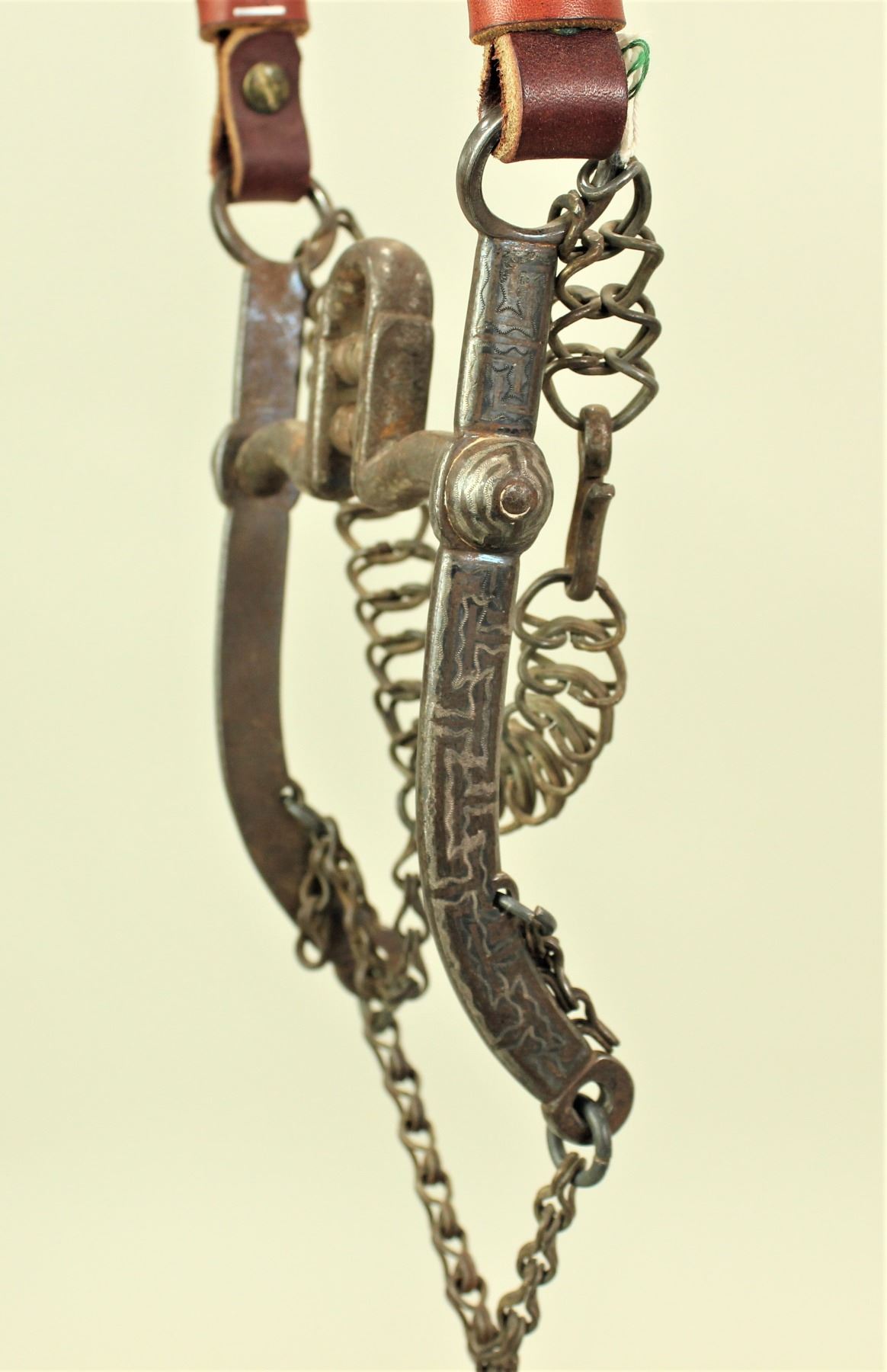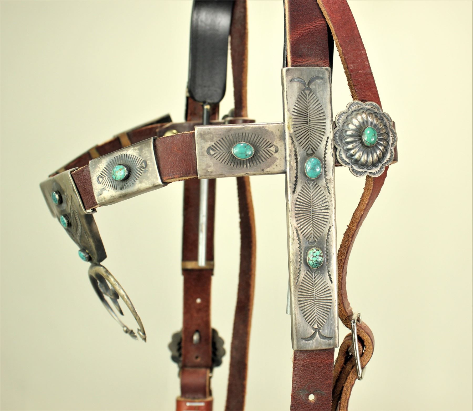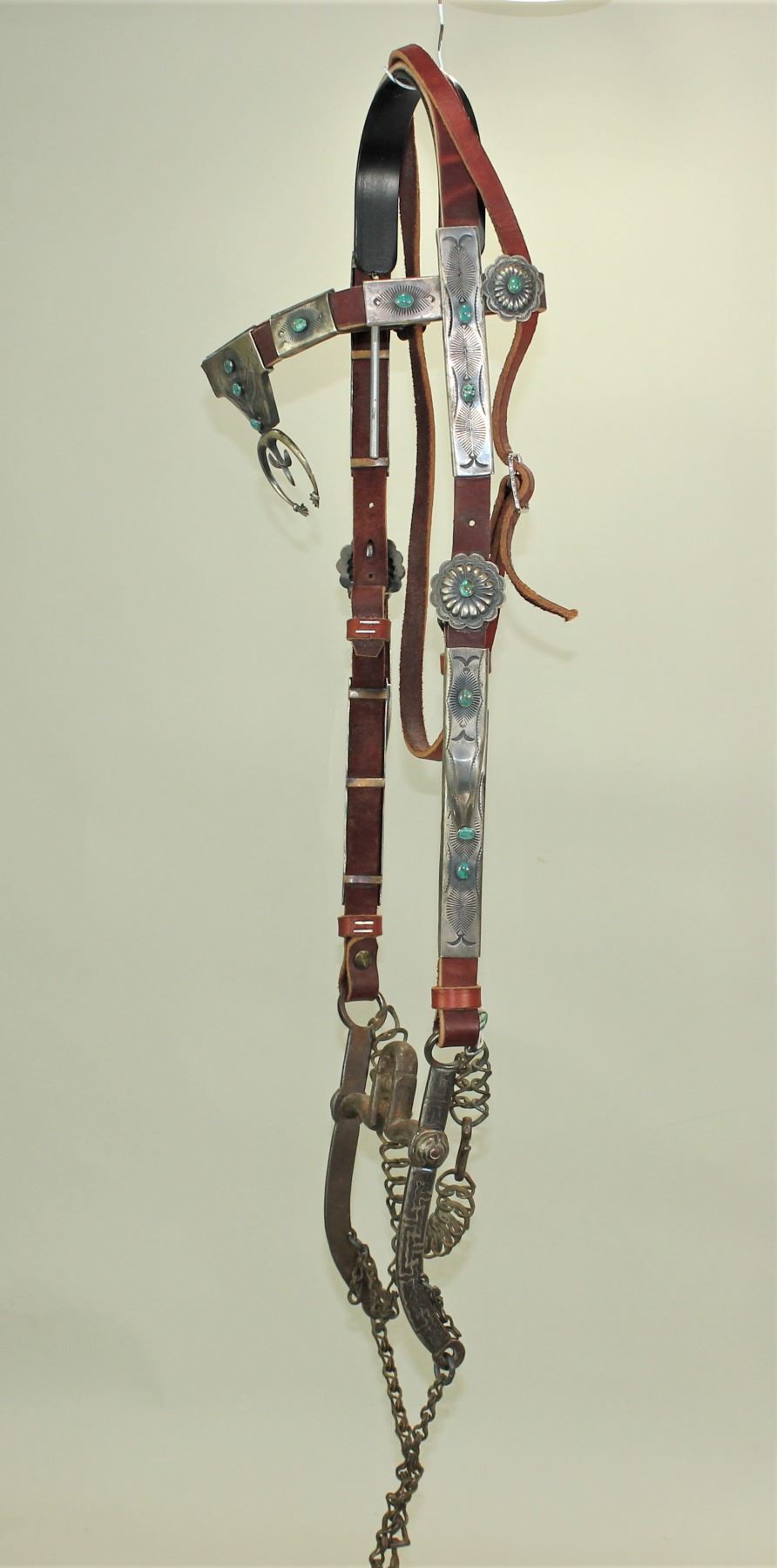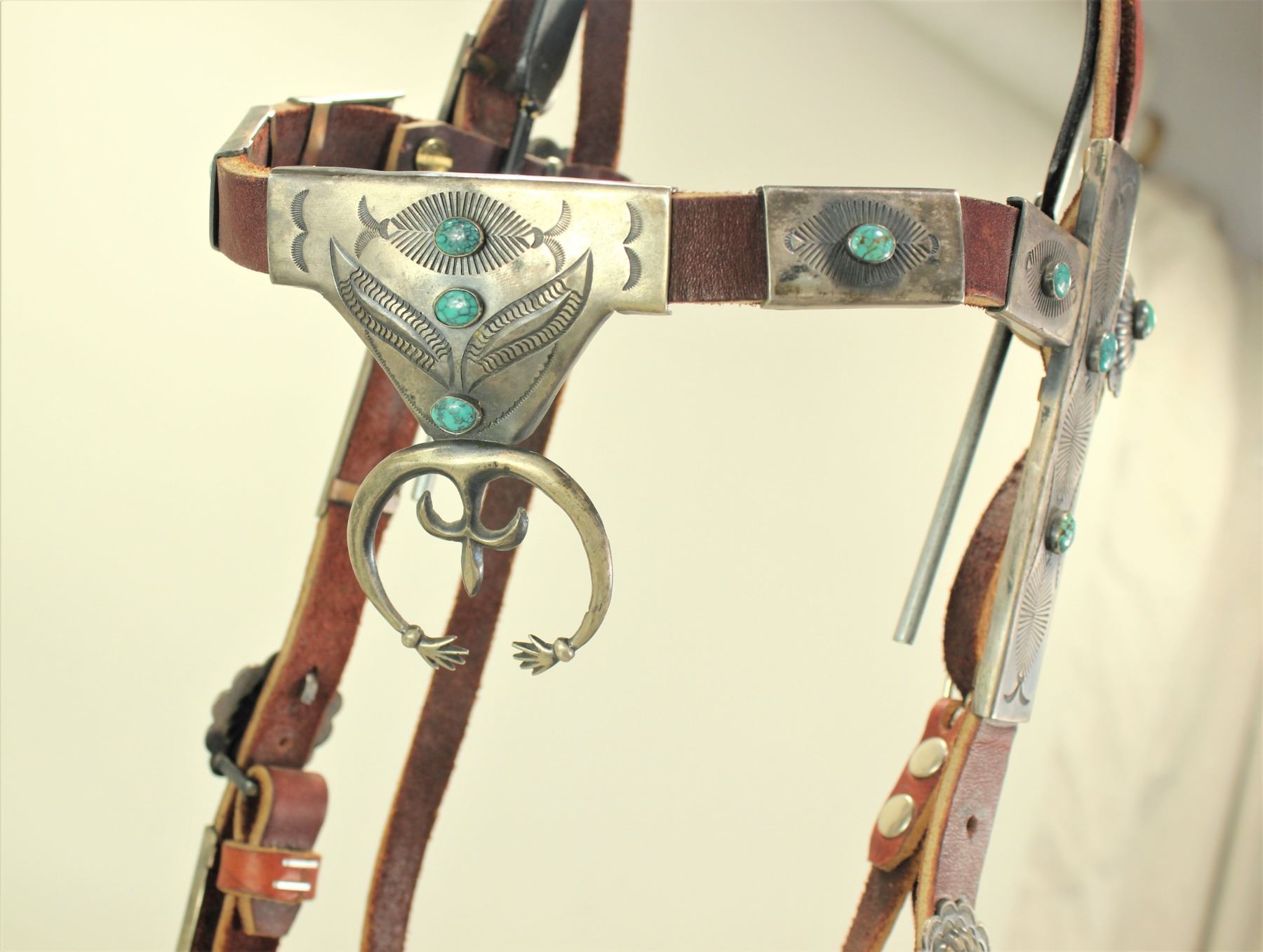 A bridle using nice vintage Navajo crafted silver with contemporary leather, and finished with a vintage silver inlaid bit, in excellent condition.