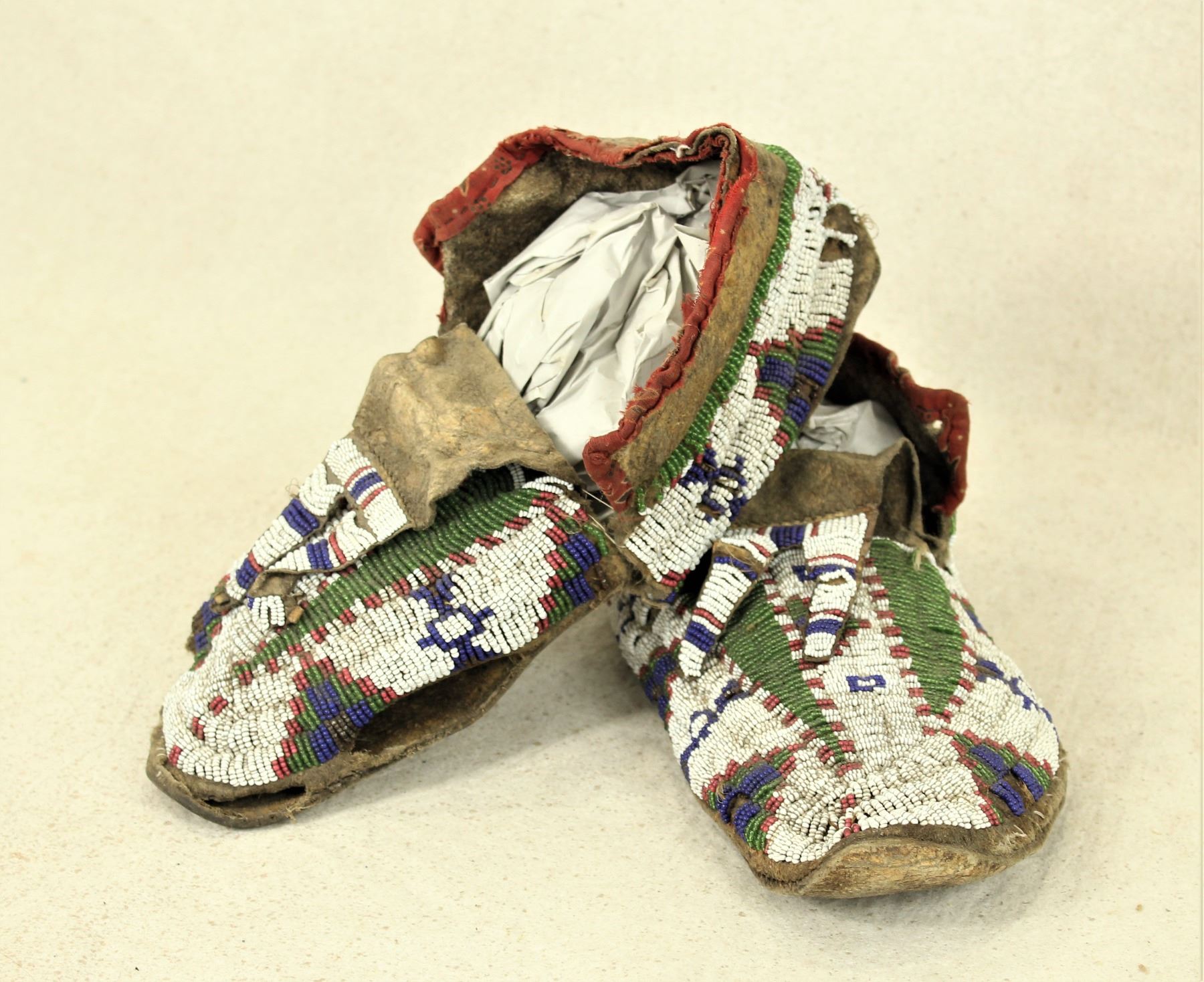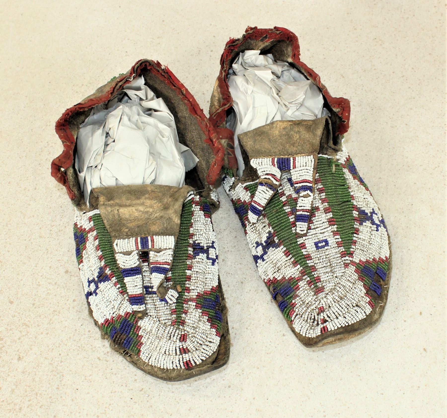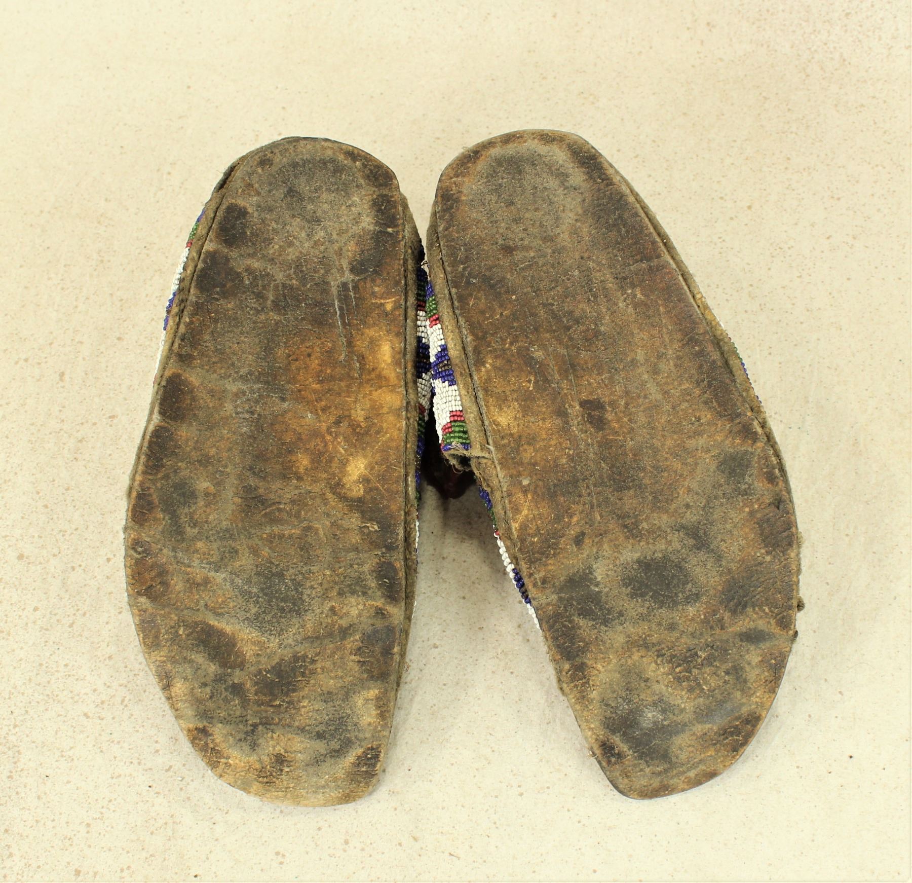 Desirable pair of men's size Northern Plains moccasins, fully beaded with an apple green buffalo track pattern, highlighted by a border of cobalt blue and white beads. A very attractive pattern, showing good condition with a separated sole and heavy wear in places.