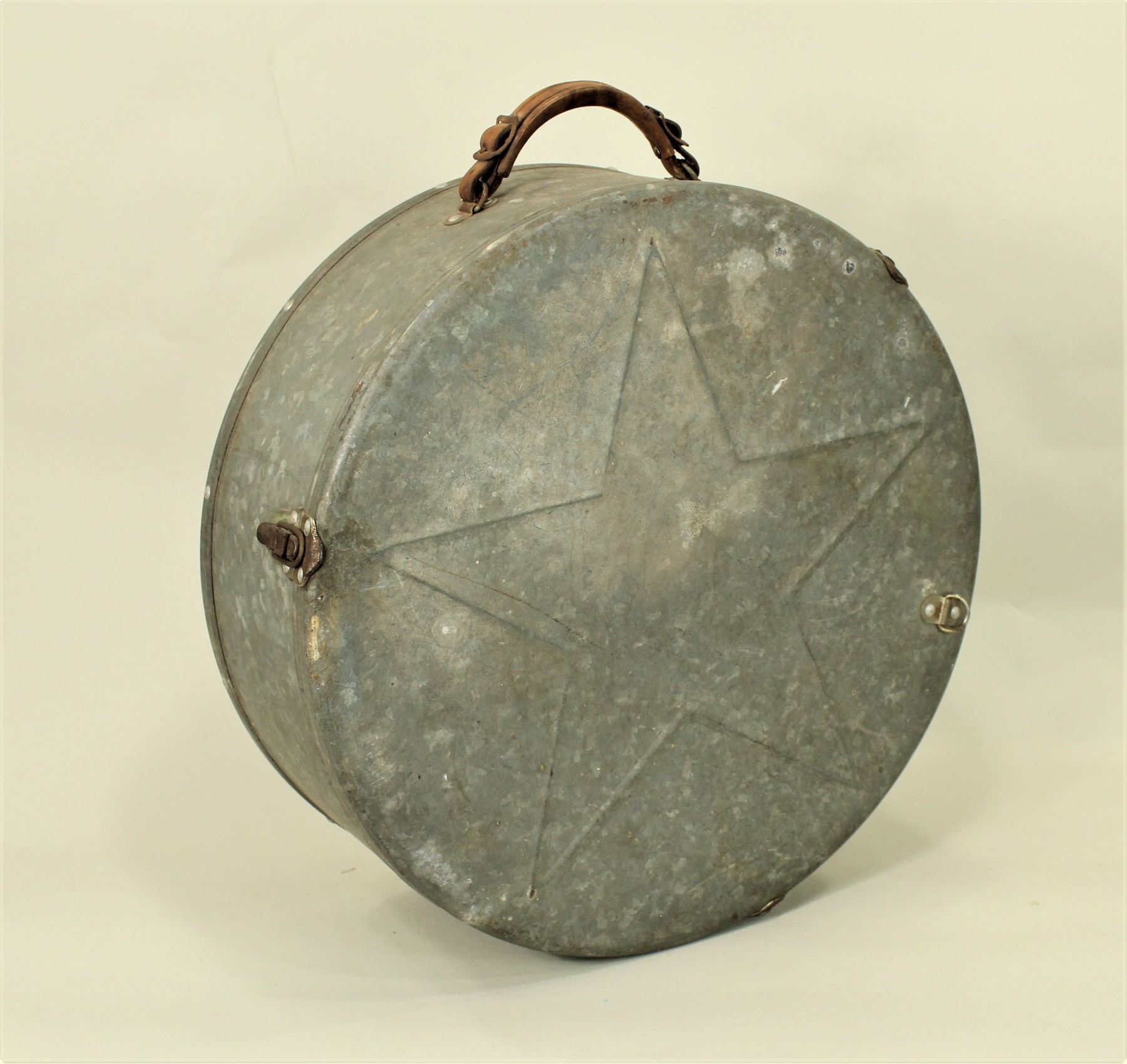 A 1940's style cowboy's rope can, made for storing and traveling with one of a cowboy's most important working tools. Made of galvanized tin and styled with a large star on each side. And a leather carrying handle. Measuring 20" in diameter.