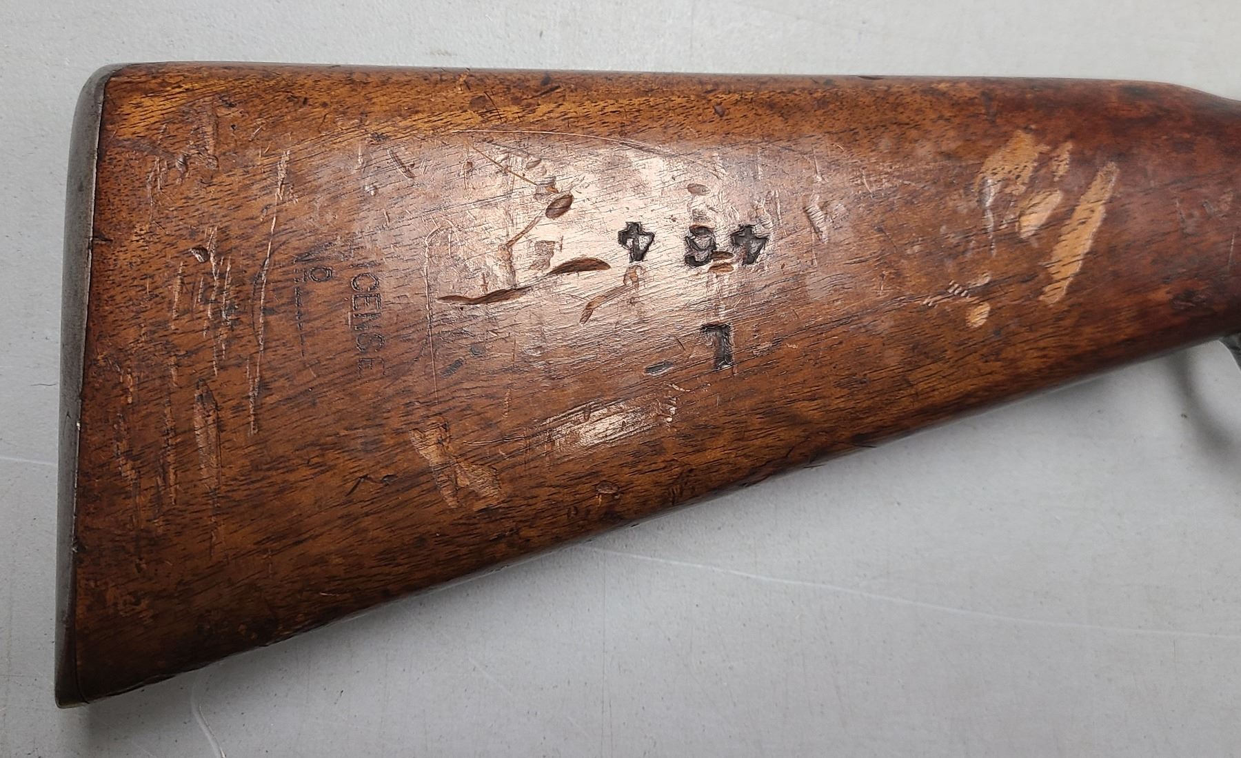 proof marks on both sides. One side of the action has two proof marks at the front.