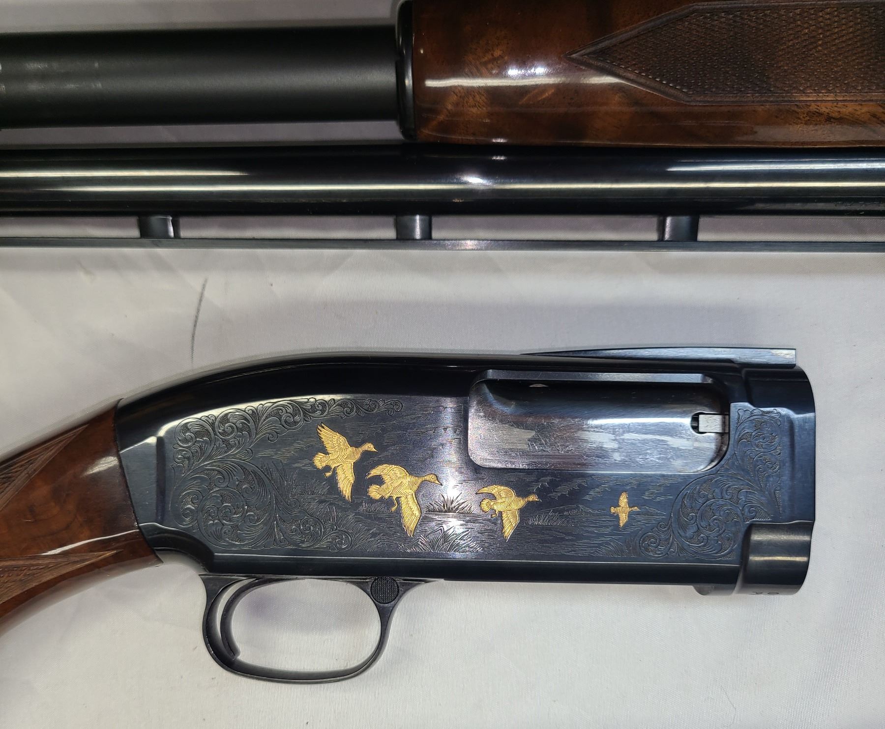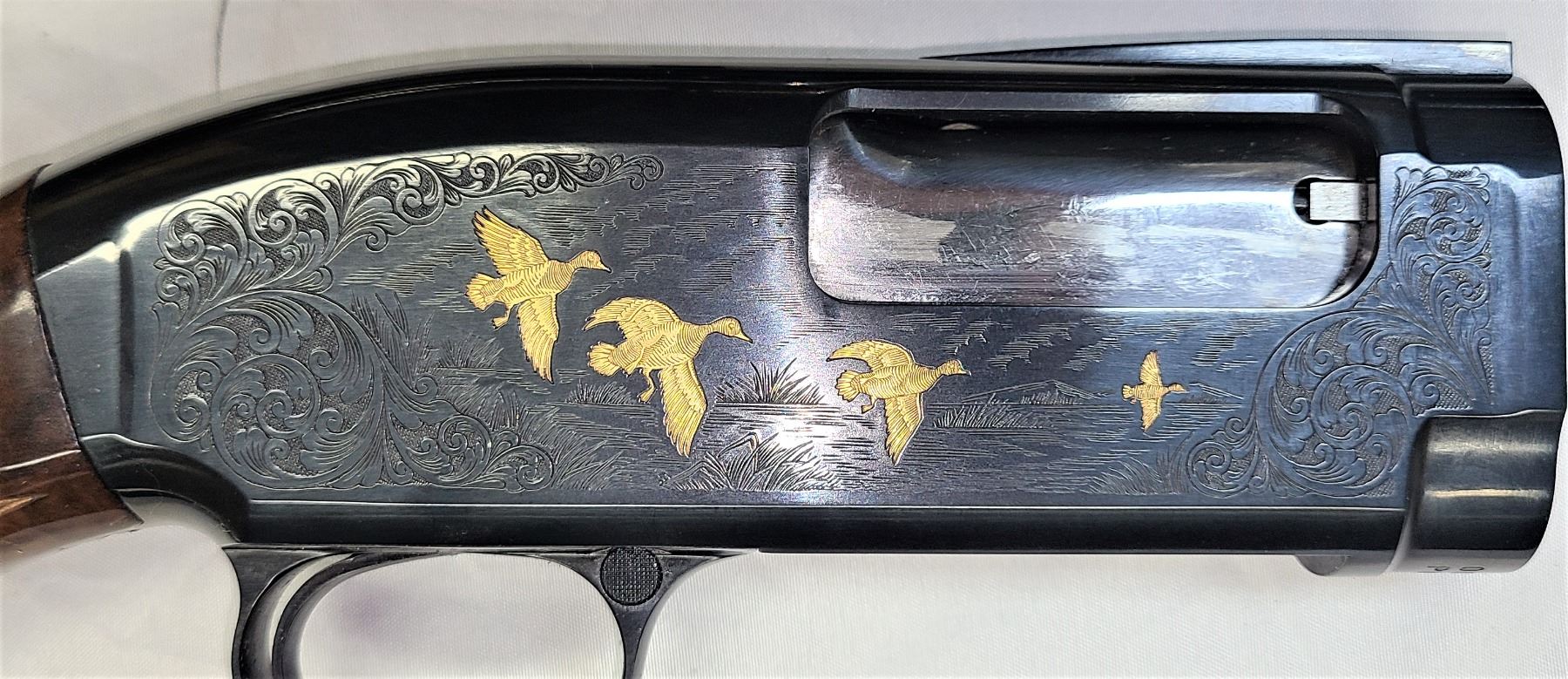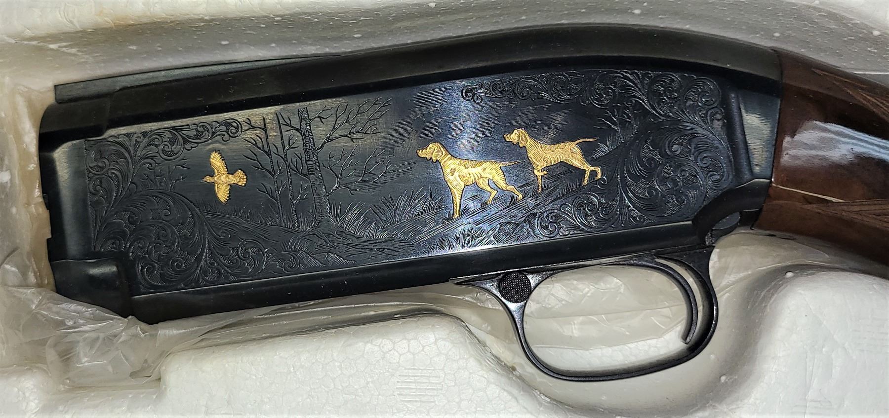 and the handsomely engraved receiver with gold birds and dogs finished in a high