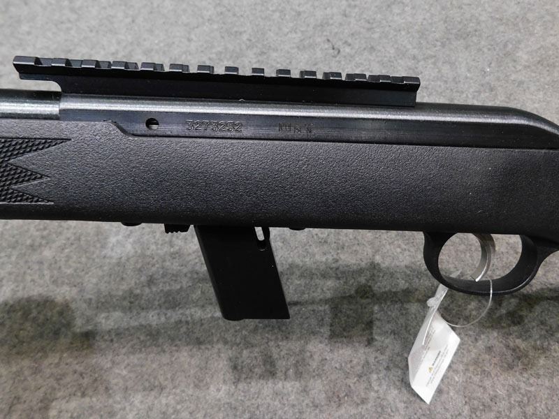 rail; and a checkered synthetic stock and black matte finish.