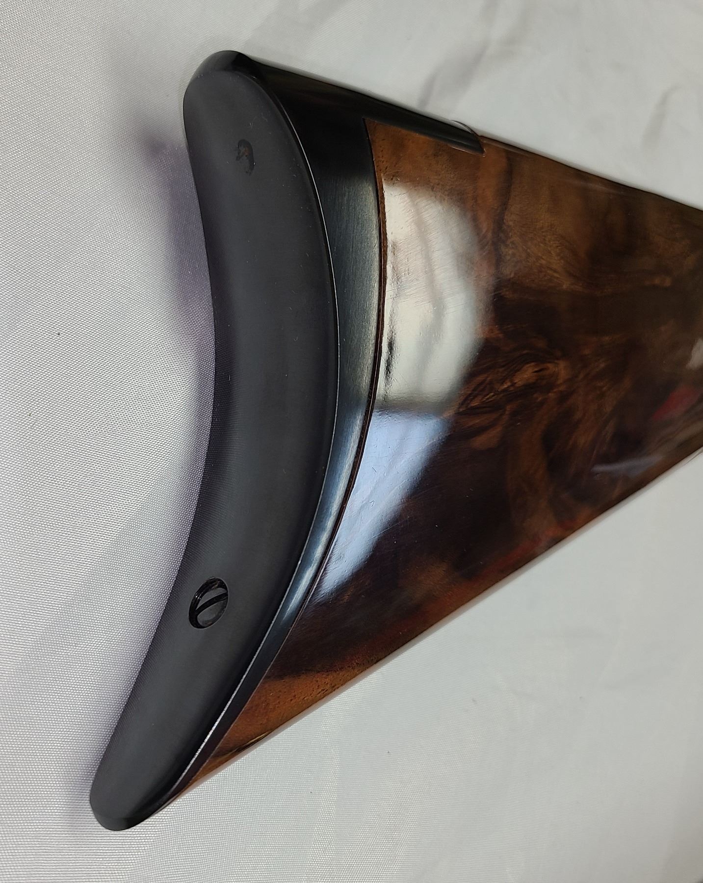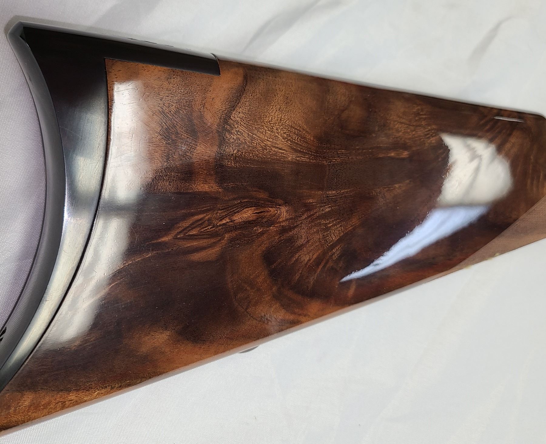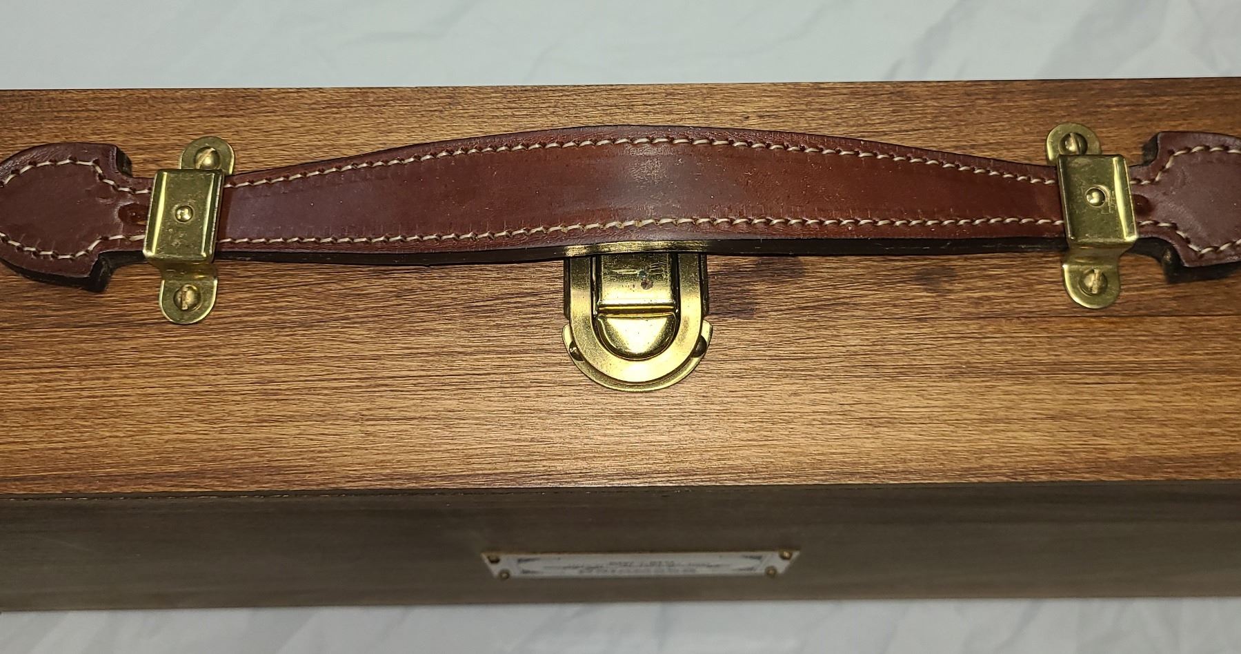 The stock is of gorgeous figured walnut. Comes cased together in a wooden case