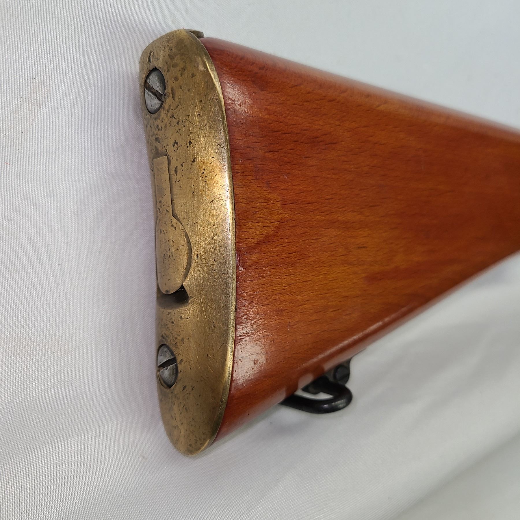 Has 24" long barrel. Brass plate and nice Ladder type sights.