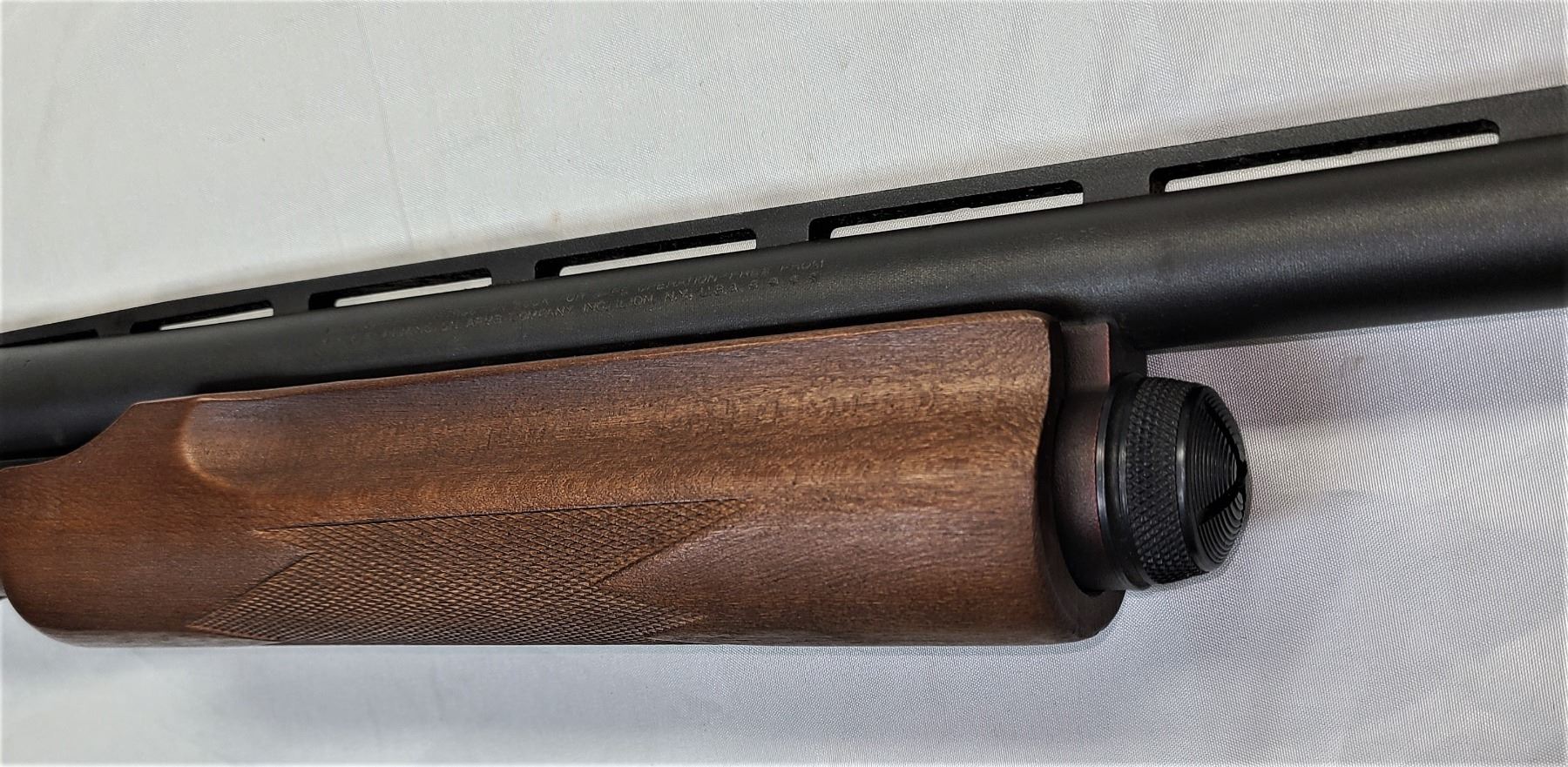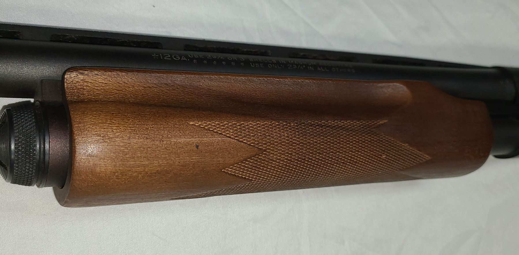 12 ga. x 3 in., 706 mm vented rib barrel, parkerized finish, checkered walnut slide