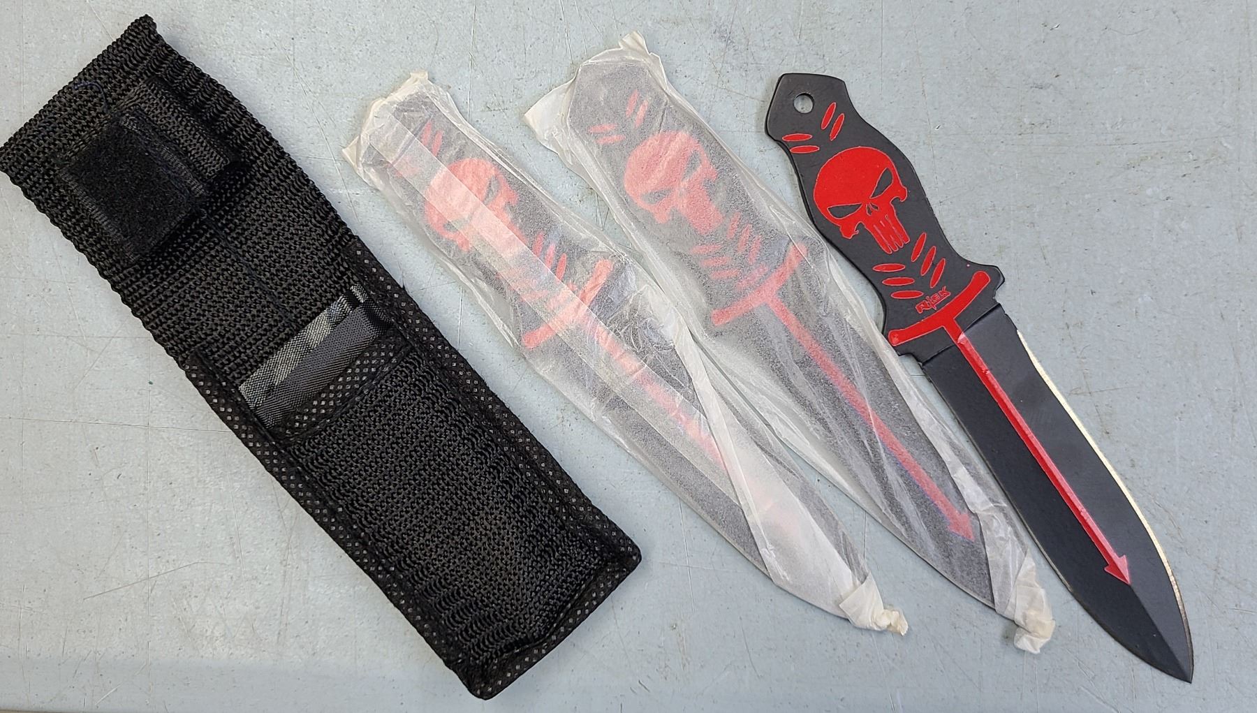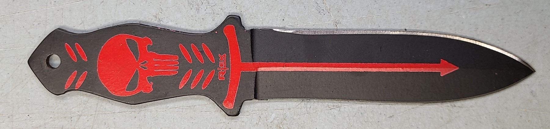Black blades with Punisher style Skull on one side in red.
