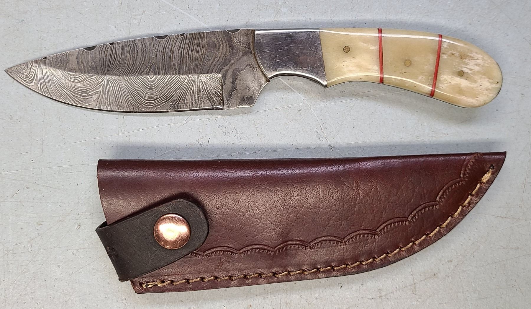 Damascus Blade Hand Made Knife with Bone Handle in Leather Sheath - NEW