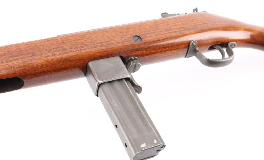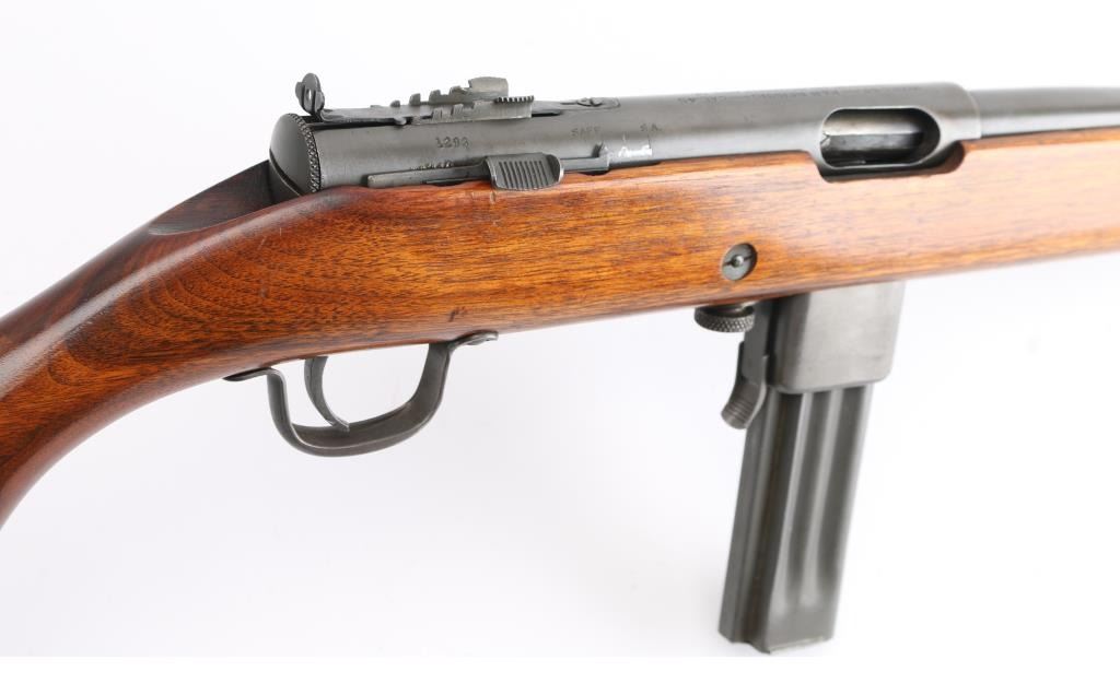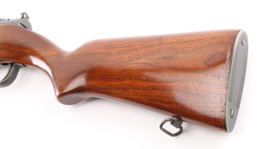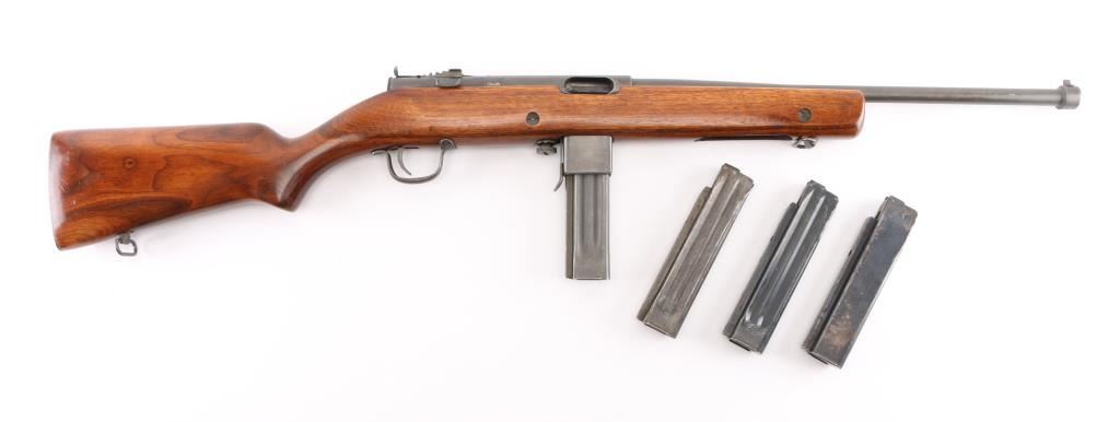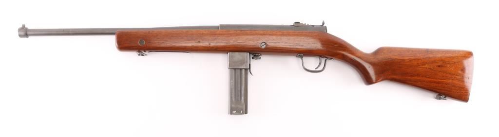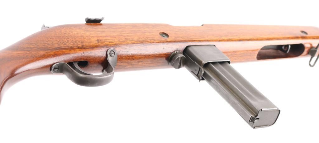 A semi-automatic version of the Model 50 Submachine Gun, the Model 60 was produced in limited quantities (approximately 3,248) between 1944 and 1946 for Police Use. Blade front and elevation adjustable peep rear sights, the 3-line model and address markings atop the receiver, and the "SAFE S.A." selector markings on the right side. Smooth pistol grip stock with a ribbed steel buttplate. Barrel marked "PH". !8" barrel, parkerized finish, blowback action from a closed bolt position. Charged via a port in the underside of the forearm. One piece walnut stock, sling swivels, steel buttplate. Bore is excellent/bright, action is smooth/tight, wood is very good+ with minor scratches, finish is about 97% with some minor scratches/rubs. These carbines rarely come up for sale, especially in this condition. Comes with (4) original H&R Reising M50 submachine gun 20-rd magazines, two blued, & 2 parkerized. These mags sell for $150.00 to $400.00 each. NRA Condition-Very Good+. C&R Firearm.