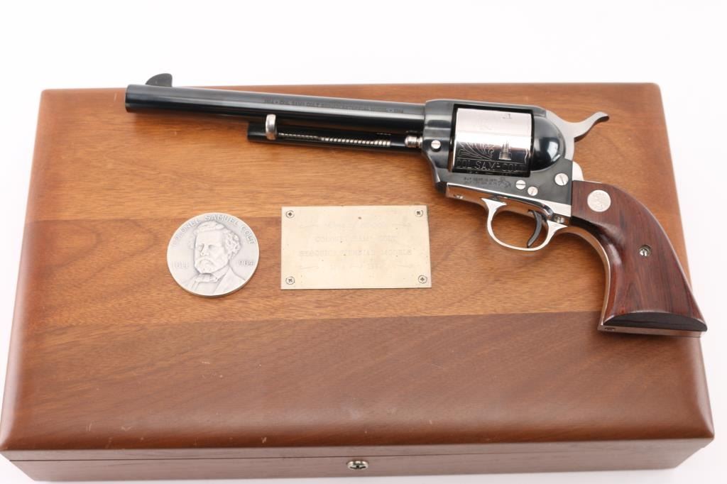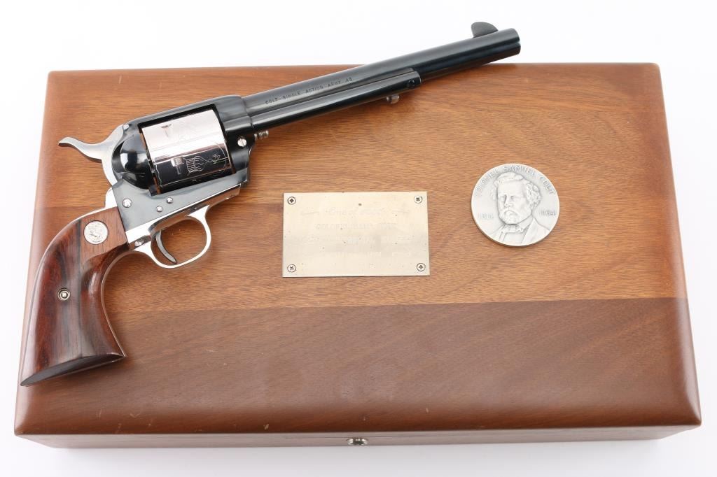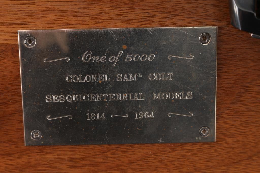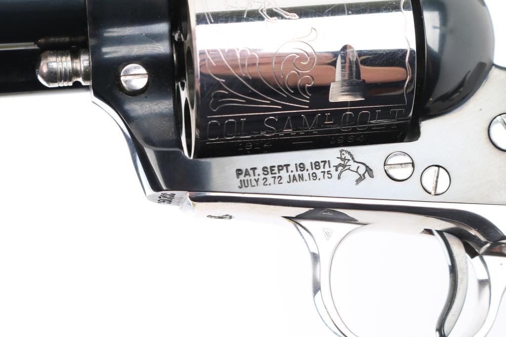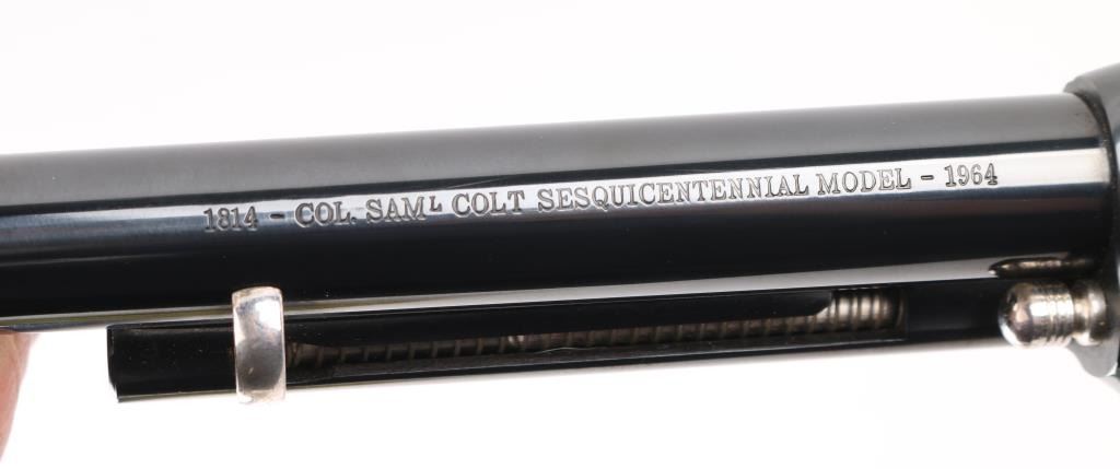 Colt SAA 1814 - Col Sam L Colt Sesquicentennial Model - 1964 .45LC This STUNNING LIMITED EDITION Colt revolver is a tribute to 150th Anniversary of Sam Colt's birth. Manufactured in 1964, there were only 5000 of these revolvers produced. This revolver sports a 7-1/2" barrel , engraved un-fluted cylinder, engravings are scenes of the Rampant Colt - the Colt Patterson Revolver - The Colt Factory Dome, and smooth Rosewood grips with silver Rampant Colt medallions. Finishes are Colt's Royal Blue on the frame - barrel - ejector rod housing - hammer and trigger while the rest of the parts are SILVER-PLATED. It has a barrel roll mark of "1814 - Col. Sam L Colt Sesquicentennial Model - 1964". Includes a very nice wooden display box, Colonel Samuel Colt pewter token/medal, 12 silver plated fired rounds with wood block, Colt letter from Colt president Paul Benke, an instruction brochure, a book titled "The Arms Collection of Colonel Colt" by R. L. Wilson, no key.. Revolver appears unfired. NRA Condition-Perfect. C&R Firearm.
