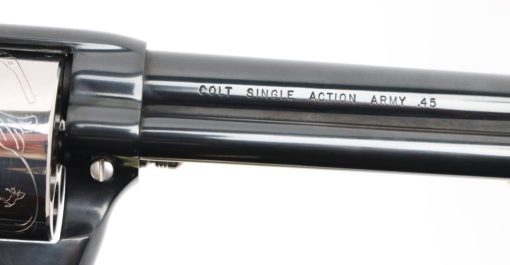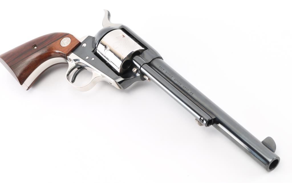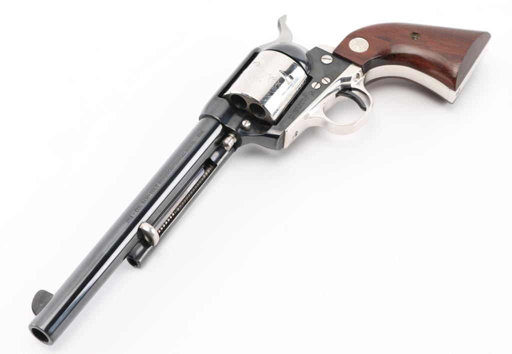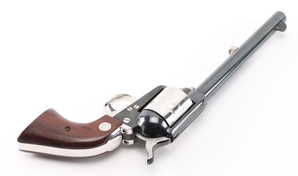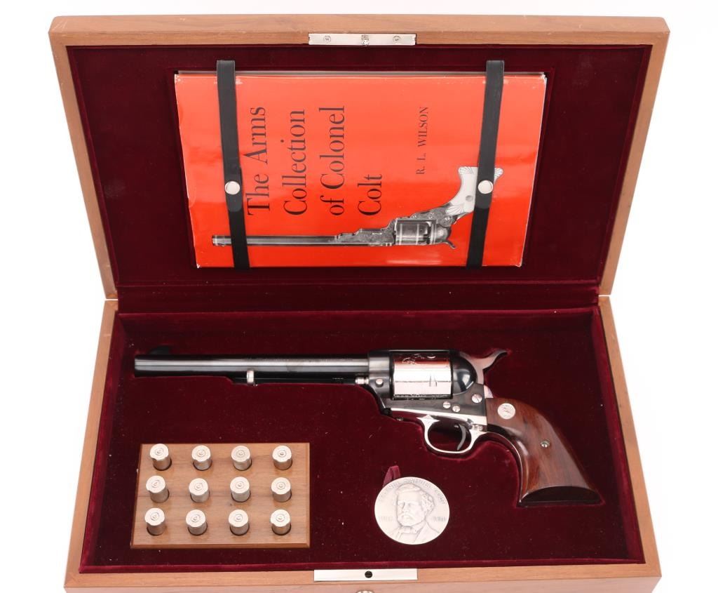 Colt SAA 1814 - Col Sam L Colt Sesquicentennial Model - 1964 .45LC This STUNNING LIMITED EDITION Colt revolver is a tribute to 150th Anniversary of Sam Colt's birth. Manufactured in 1964, there were only 5000 of these revolvers produced. This revolver sports a 7-1/2" barrel , engraved un-fluted cylinder, engravings are scenes of the Rampant Colt - the Colt Patterson Revolver - The Colt Factory Dome, and smooth Rosewood grips with silver Rampant Colt medallions. Finishes are Colt's Royal Blue on the frame - barrel - ejector rod housing - hammer and trigger while the rest of the parts are SILVER-PLATED. It has a barrel roll mark of "1814 - Col. Sam L Colt Sesquicentennial Model - 1964". Includes a very nice wooden display box, Colonel Samuel Colt pewter token/medal, 12 silver plated fired rounds with wood block, Colt letter from Colt president Paul Benke, an instruction brochure, a book titled "The Arms Collection of Colonel Colt" by R. L. Wilson, no key.. Revolver appears unfired. NRA Condition-Perfect. C&R Firearm.