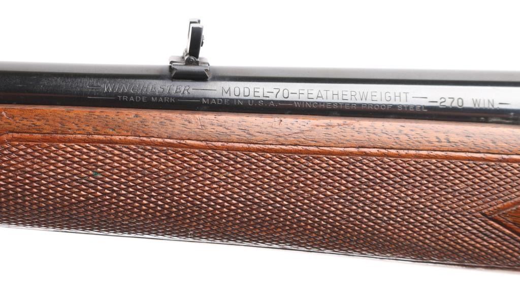 SN: 386841.Bolt-Action. Model 70 "Featherweight" Pre-64, manufactured in 1955. 22" round, tapered barrel with ramped, hooded, post/bead front and flip u-notch, "white triangle" rear sights. Mauser style action. Anodized matte-black receiver, drilled/tapped for optics, . Blued barrel, and trigger assembly, 3-position manual safety, hinged floorplate, Checkered high comb pistol grip stock with sling swivels. Checkered aluminum butt plate. Wood is very good with minor scratches. Bore appears excellent/bright. Action is smooth/tight. Markings are crisp/clear. Winchester proofs on receiver/barrel. Blued barrel is 99% with very minor scratches. Bolt marked ".270 FWT" (Featherweight) A very nice pre-64 Model 70 in a very desirable caliber. NRA Condition-Very Good. C&R Firearm.