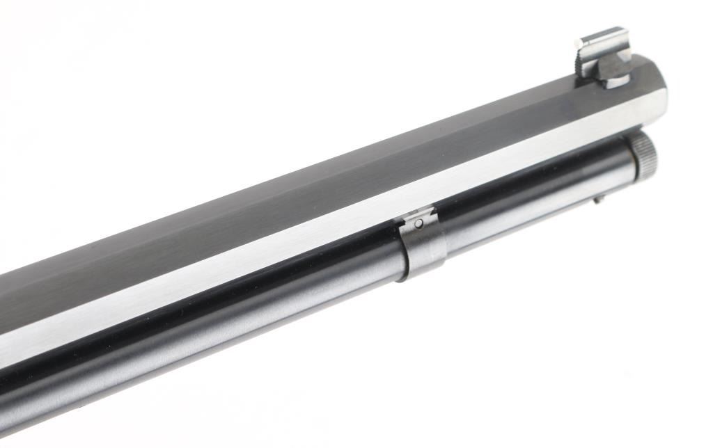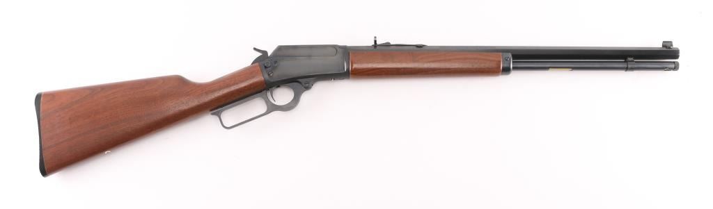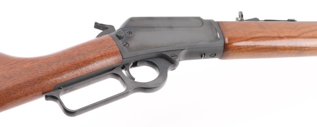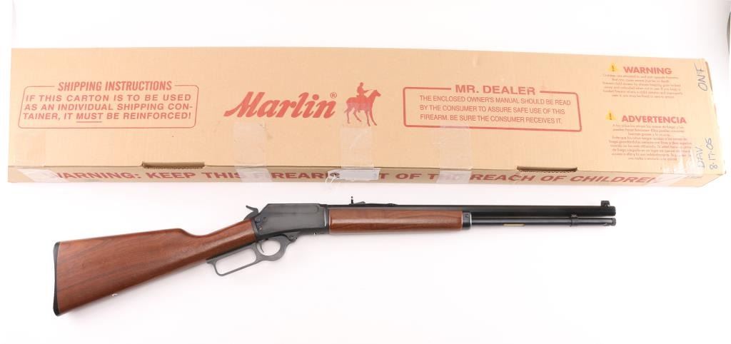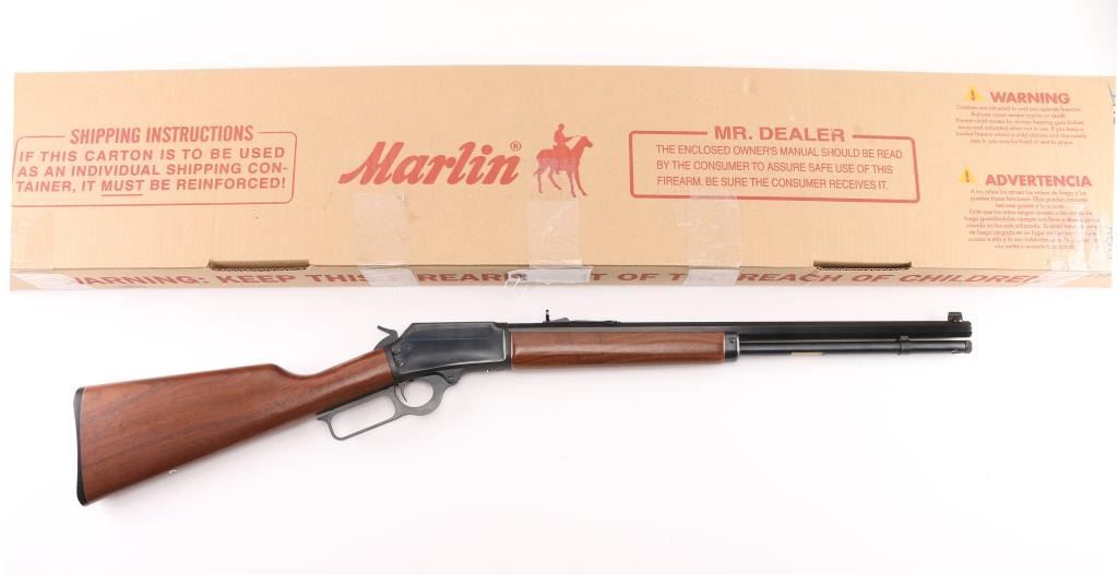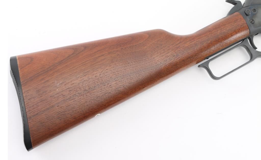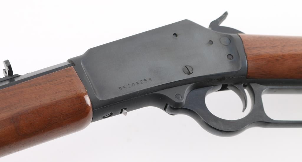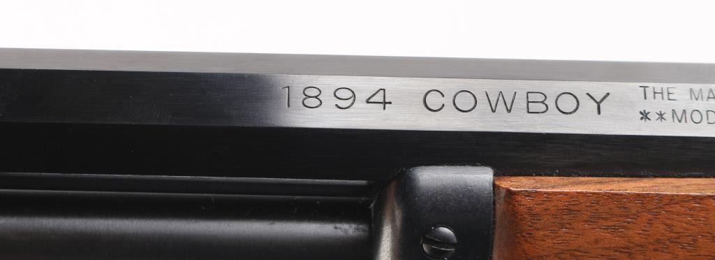 SN: 95203258. "1894 Cowboy' "JM" marked barrel. Lever action rifle features blued finish, 20" octagon barrel, blade front sight with white bead, buckhorn rear sporting sight, full length magazine tube held to barrel with a screw (no bands), pushbutton cross bolt safety. Two piece black walnut stocks are smooth, straight wrist, with a checkered black plastic Marlin buttplate. Bore is pristine. Retains 99% blue with handling marks. Wood is excellent. Like new condition. Comes in the original Marlin cardboard box numbered to gun, with manual. Condition is NRA Excellent. Modern Firearm.