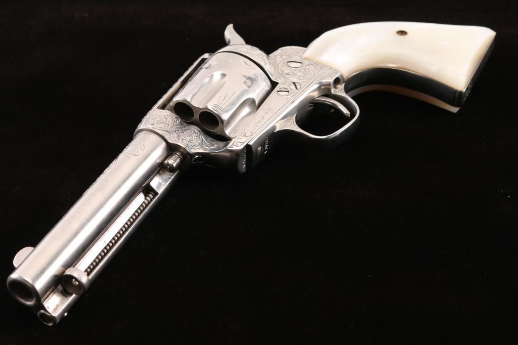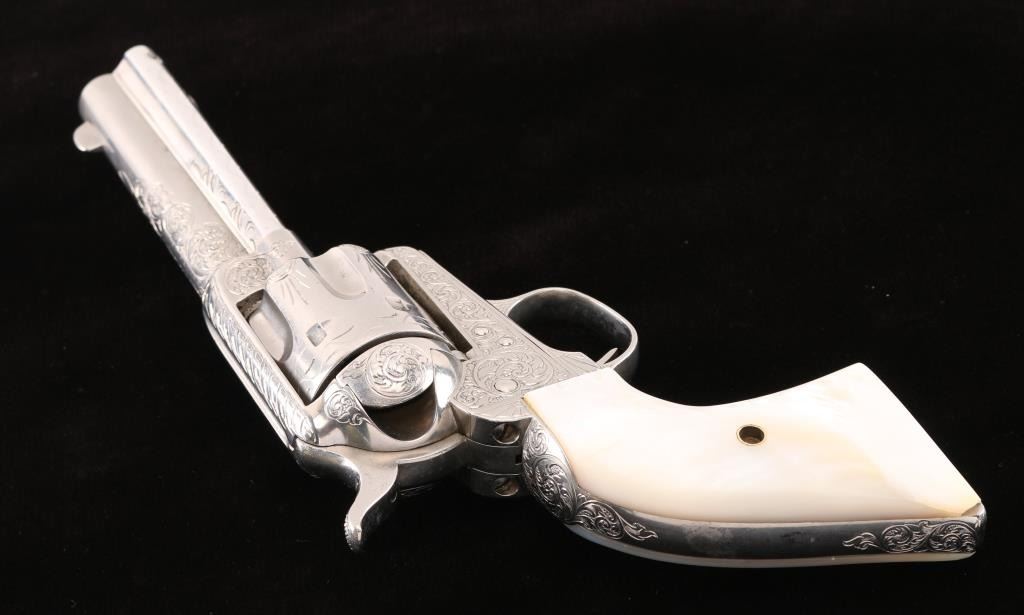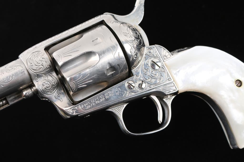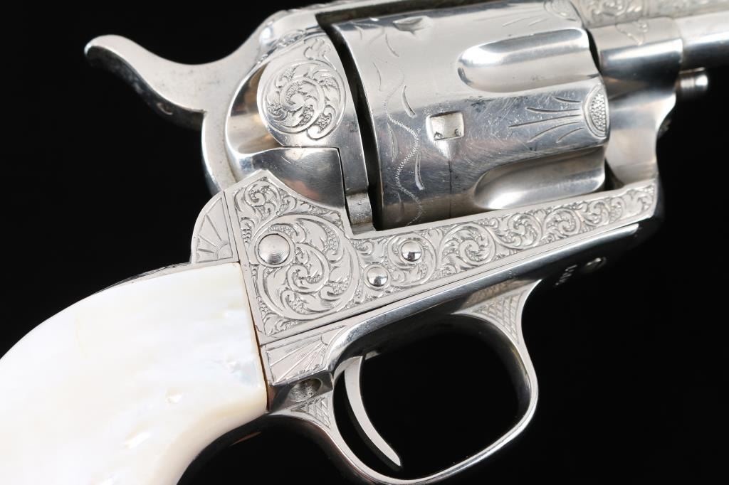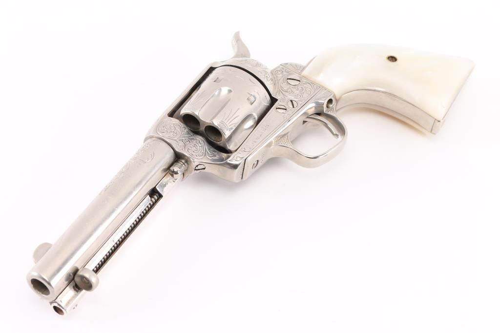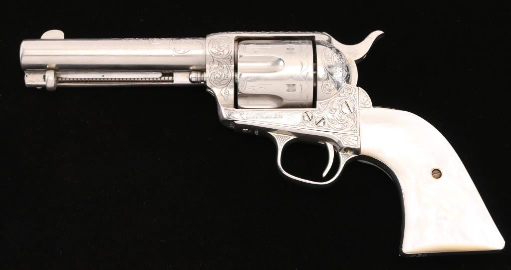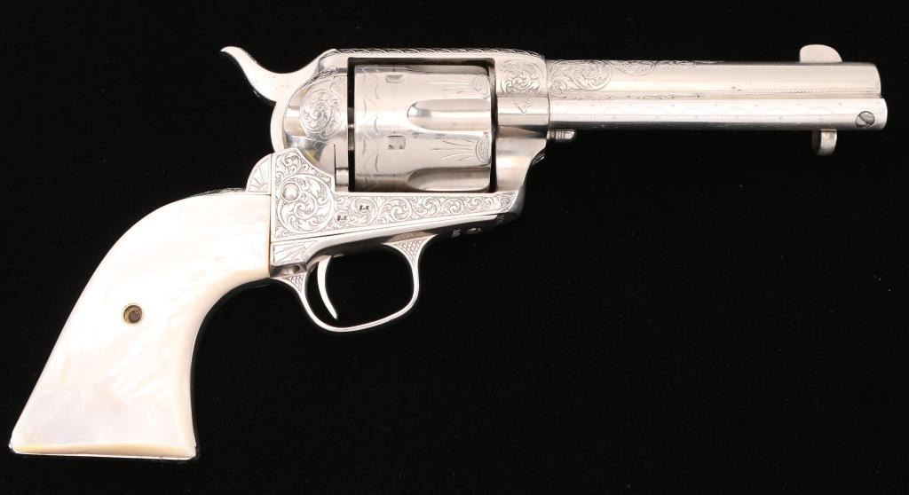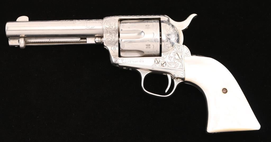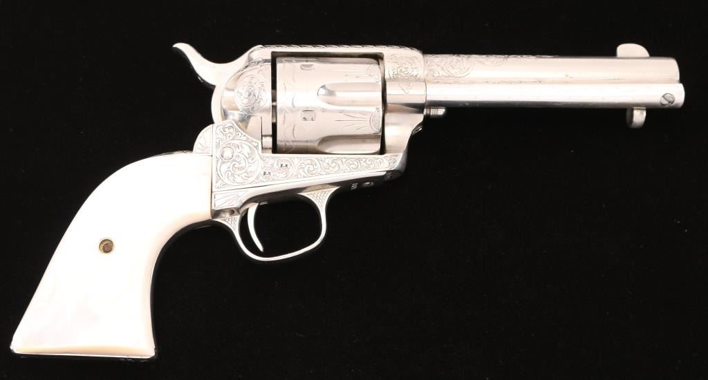 Antique Colt SAA chambered in .44-40. Manufactured 1892. 4 3/4" barrel with 2-line address. Serial number matched on frame, cylinder, triggerguard, and backstrap. Patent dates and "Rampant Colt" on left frame. Assembly number "526" on loading gate. "Colt Frontier Six Shooter" on left barrel. Mother of pearl grips, donut ejector rod head. Revolver has an old re-nickel finish, and is scroll engraved. Engraving is post factory and probably done at the time of engraving. Really nice job . The finish is about 94% with minor scratches, and a rub on the back strap, bore has rifling with scattered pin-prick pitting, action is crisp/tight. Markings are crisp/clear except address which is a little feint. Pearl grips are a good fit, with both having small chips out the lower rear panels. NRA Condition-Good/Re-Finished. Antique Firearm.