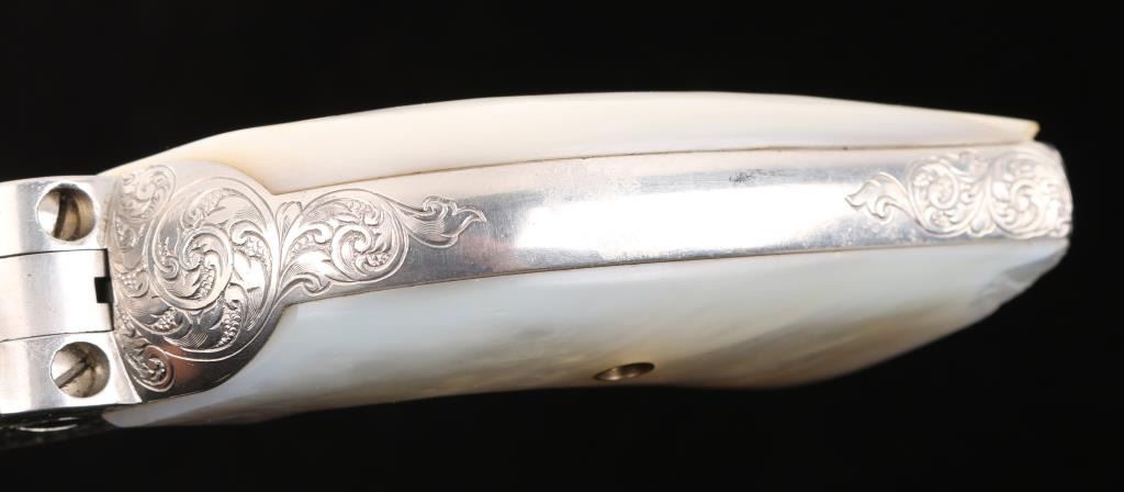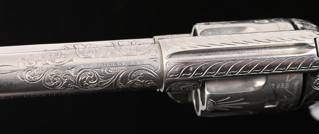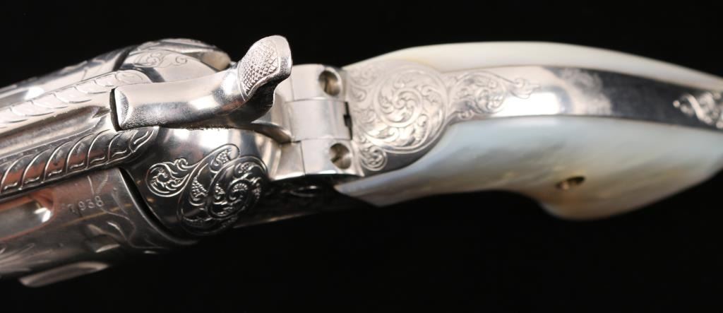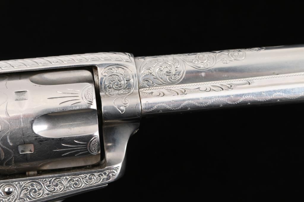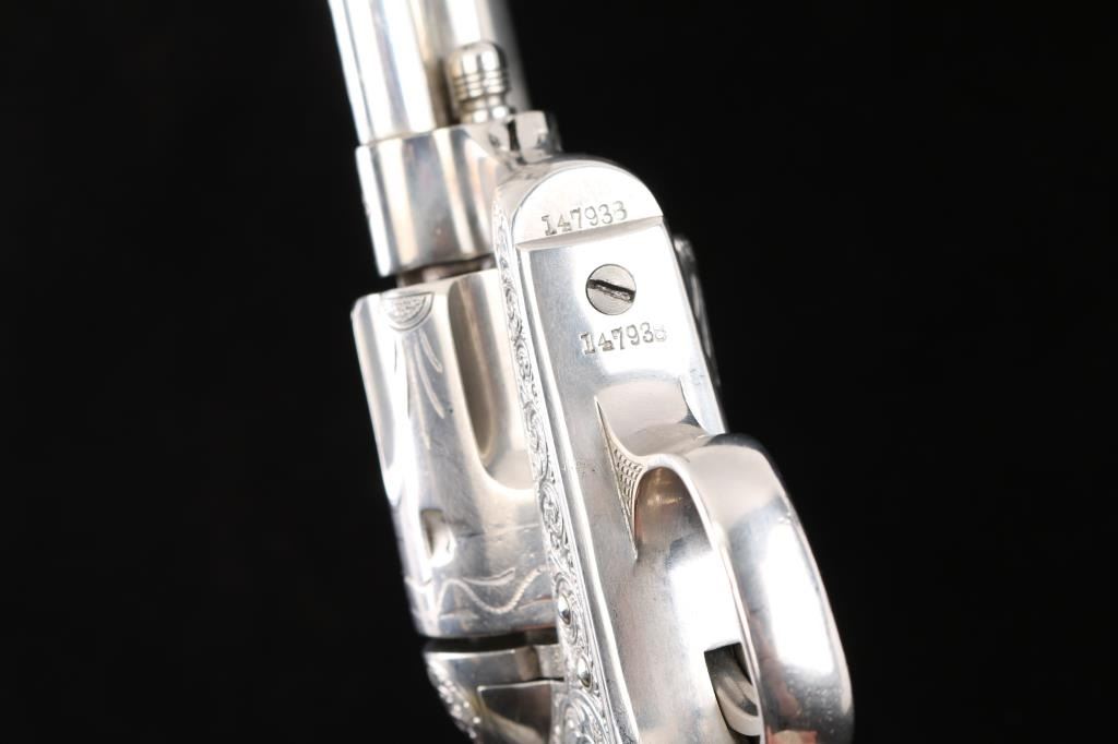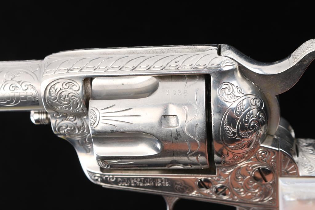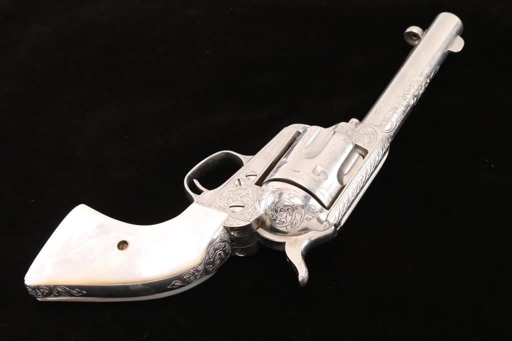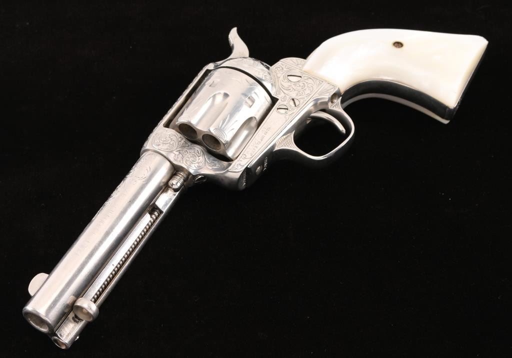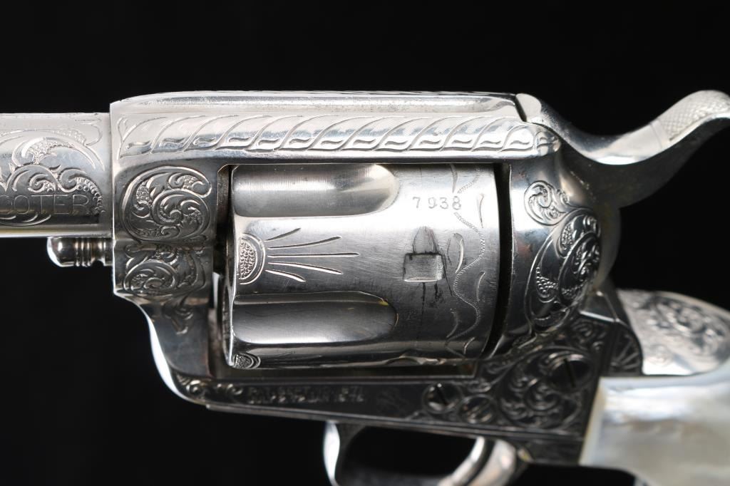 Antique Colt SAA chambered in .44-40. Manufactured 1892. 4 3/4" barrel with 2-line address. Serial number matched on frame, cylinder, triggerguard, and backstrap. Patent dates and "Rampant Colt" on left frame. Assembly number "526" on loading gate. "Colt Frontier Six Shooter" on left barrel. Mother of pearl grips, donut ejector rod head. Revolver has an old re-nickel finish, and is scroll engraved. Engraving is post factory and probably done at the time of engraving. Really nice job . The finish is about 94% with minor scratches, and a rub on the back strap, bore has rifling with scattered pin-prick pitting, action is crisp/tight. Markings are crisp/clear except address which is a little feint. Pearl grips are a good fit, with both having small chips out the lower rear panels. NRA Condition-Good/Re-Finished. Antique Firearm.