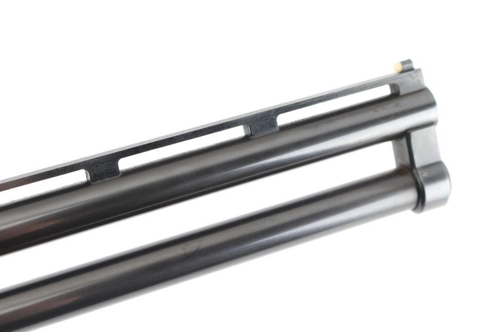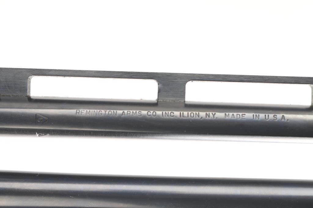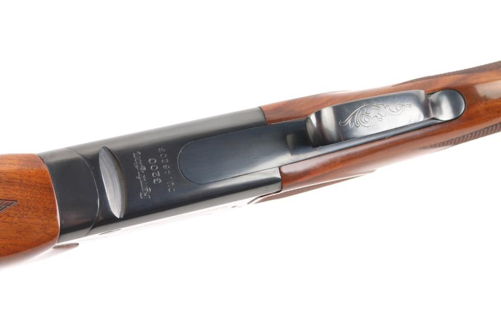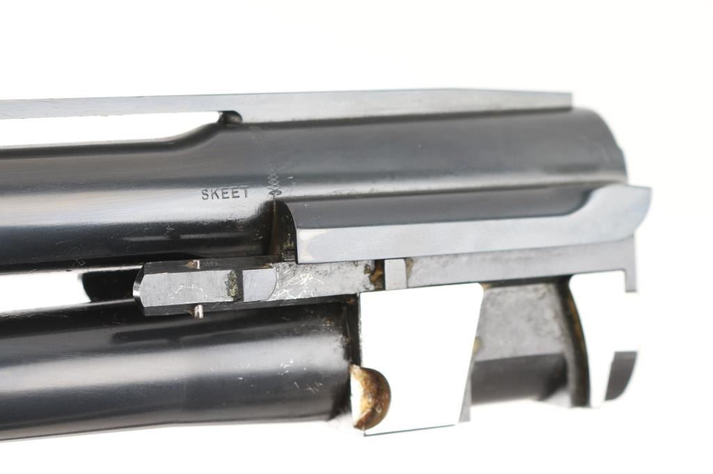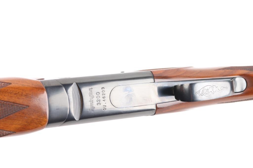 SN: OU46203. Cased Remington 3200 Competition Skeet Over/Under Shotgun Four Barrel Set with Case. SN: OU.46203.(1982) The receiver is marked "COMPETITION" on either side. Mounted on a nicely figured multi-point checkered walnut forearm and pistol grip stock with vented black rubber recoil pad. (The bottom of the grip is scuffed) Safety/barrel selector on tang. The included four 27 1/2 inch barrels with front white bead, & silver mid bead have matching serial numbers, are choked skeet/skeet with the 12, 20 and 28 ga (28 Ga. barrel on the gun) barrels having 2 3/4 inch chambers and the .410 bore has 2 1/2 inch chambers. Barrel and stock measurements, skeet/skeet chokes, 1 1/2 inch drop at comb, 2 3/16 inch drop at heel, and 14 inch length of pull. Includes a brown leather takedown case that houses the gun and barrels. Excellent, like new, retaining 99% original blue, and sharp stock checkering. Mechanically excellent. All the bores are pristine. The case is also excellent, NRA Condition. Excellent Like new. Modern Firearm.