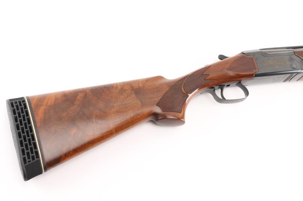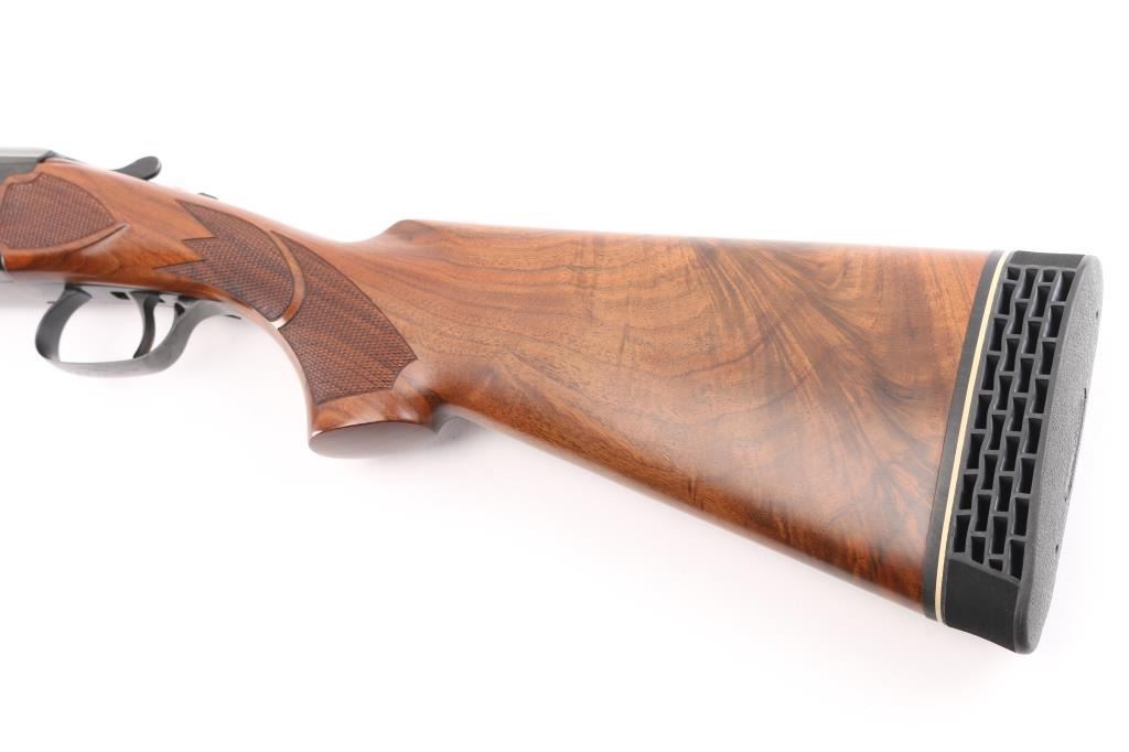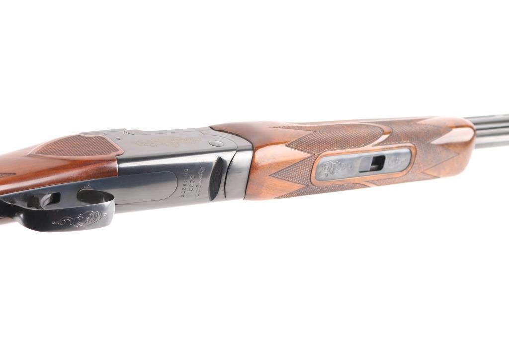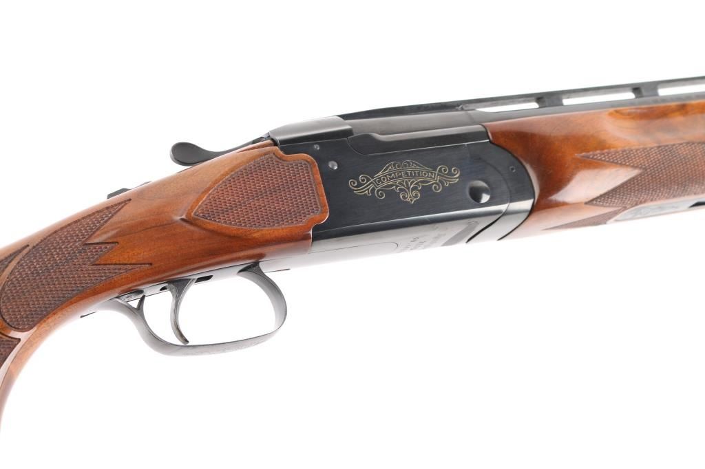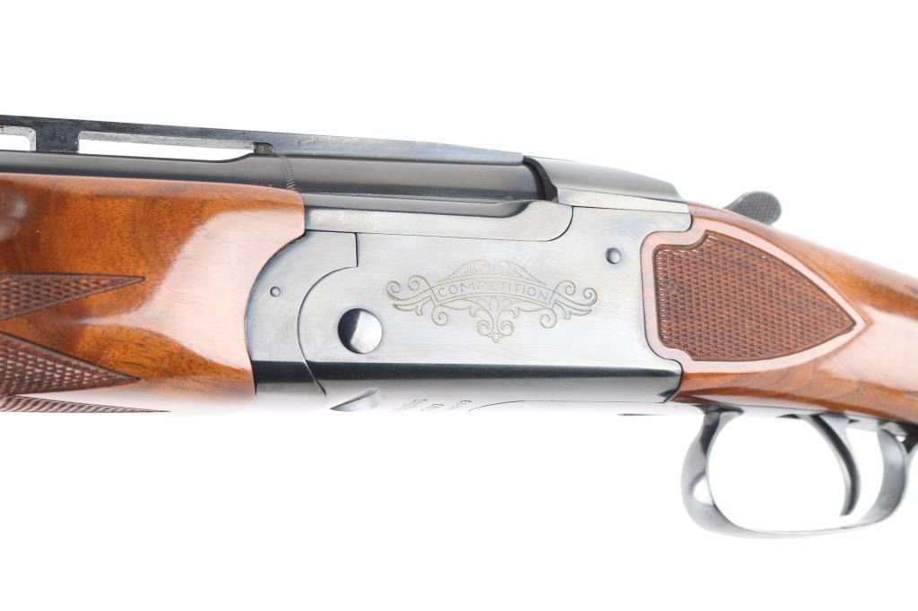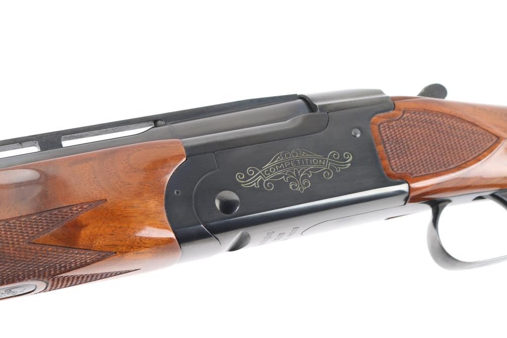 SN: OU46203. Cased Remington 3200 Competition Skeet Over/Under Shotgun Four Barrel Set with Case. SN: OU.46203.(1982) The receiver is marked "COMPETITION" on either side. Mounted on a nicely figured multi-point checkered walnut forearm and pistol grip stock with vented black rubber recoil pad. (The bottom of the grip is scuffed) Safety/barrel selector on tang. The included four 27 1/2 inch barrels with front white bead, & silver mid bead have matching serial numbers, are choked skeet/skeet with the 12, 20 and 28 ga (28 Ga. barrel on the gun) barrels having 2 3/4 inch chambers and the .410 bore has 2 1/2 inch chambers. Barrel and stock measurements, skeet/skeet chokes, 1 1/2 inch drop at comb, 2 3/16 inch drop at heel, and 14 inch length of pull. Includes a brown leather takedown case that houses the gun and barrels. Excellent, like new, retaining 99% original blue, and sharp stock checkering. Mechanically excellent. All the bores are pristine. The case is also excellent, NRA Condition. Excellent Like new. Modern Firearm.