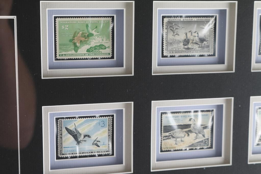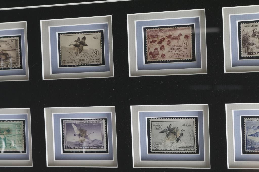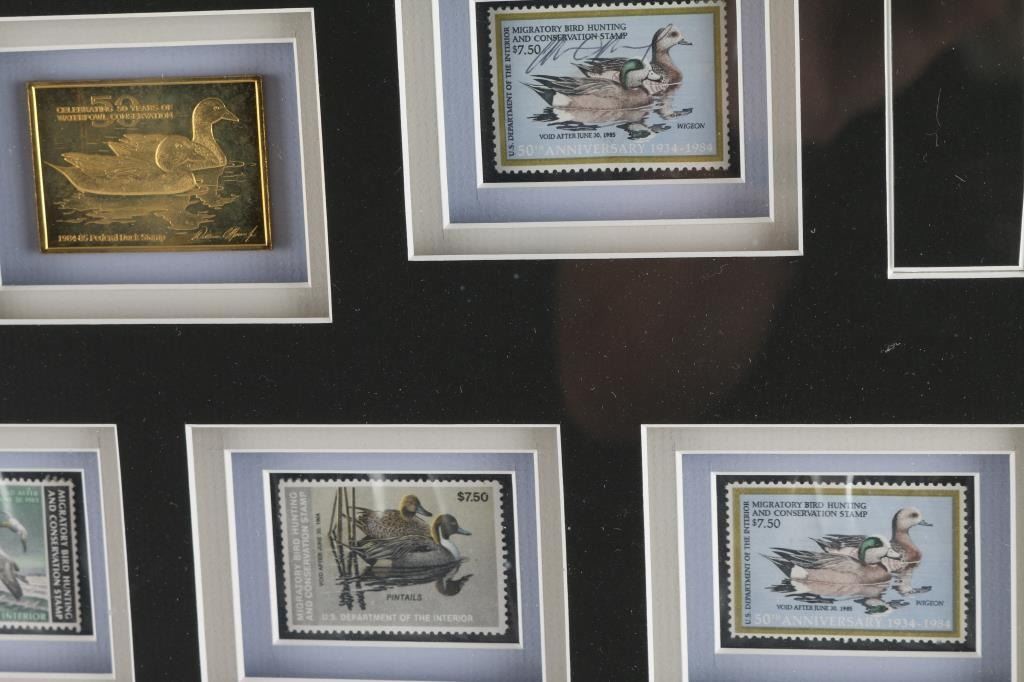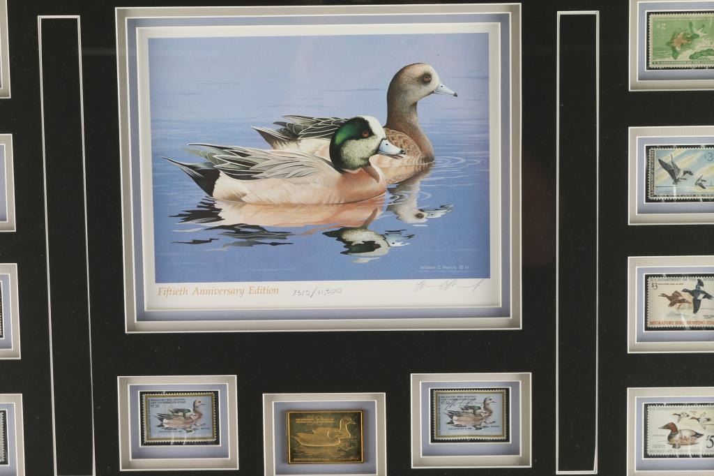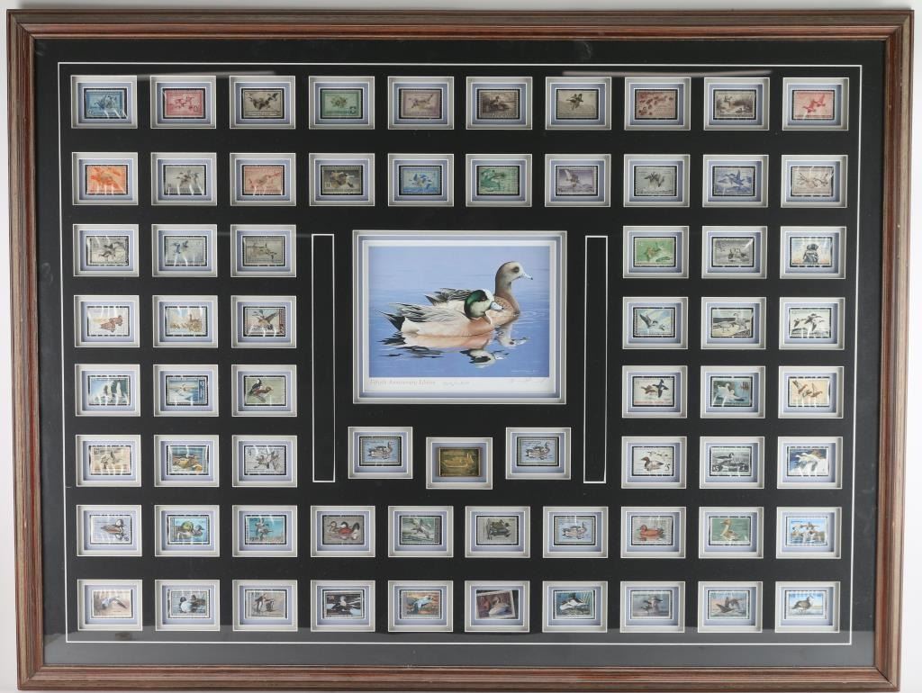 This is the 50th anniversary duck stamp collection. The center has a print of two ducks by William C. Morris, signed by Morris on the lower right hand side and reads "Fiftieth Anniversary Edition 7315/11,500" on the lower left side. The collection includes 64 U.S. Department of the Interior duck stamps starting with the 1st stamp (1934) and ending with 1999 issue. 27 of the stamps are signed, the remainder are not. There is also a gold 50th anniversary stamp in the center with the likeness of the William C. Morris print with William C. Morris' signature. Mounted in a nicely sculptured oak frame, 44 1/2" by 33", with a Plexiglas front and paper backing.