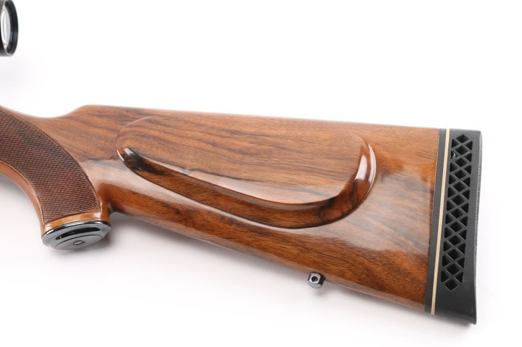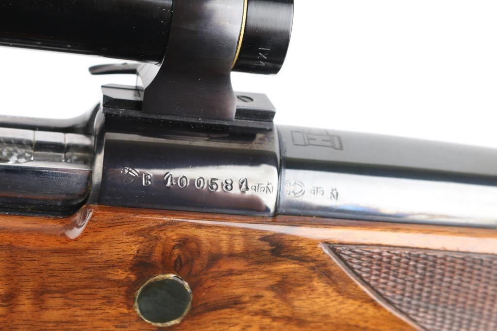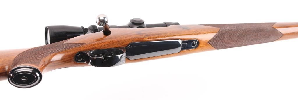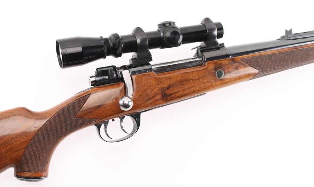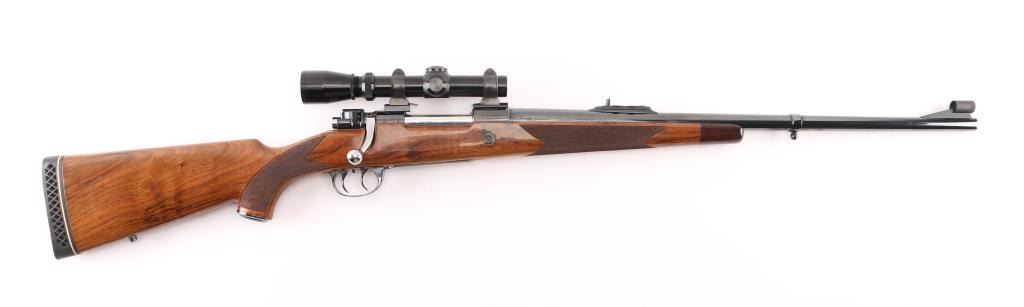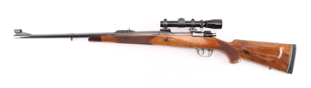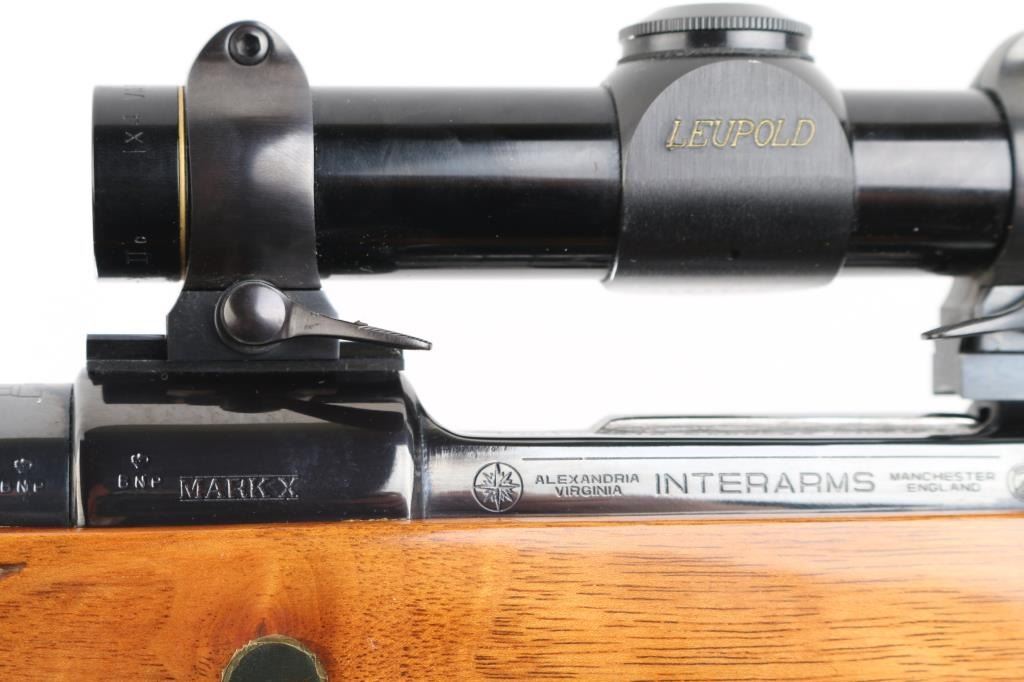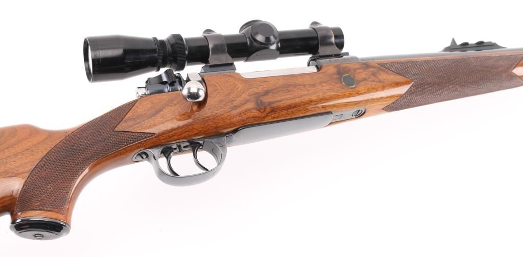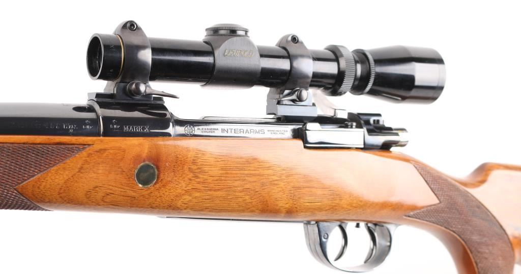 SN: B100581 Quality bolt action sporting rifle chambered in .458 Winchester. Build in Manchester, England by Whitworth Rifle Company using a Yugoslavian Zastava mauser action and imported by Interarms of Alexandria, Virginia. Features a lustrous blued finish, 24” round tapered barrel, ramped & hooded post/bead front sight, double drop leaf express sight marked for 200 & 300 yards, Leupold 1x4 Vari-X IIc scope mounted with Lon Paul custom bases/rings, turned down/swept back bolt handle, finely jeweled bolt, low-swing two-position bolt mounted safety, 3 round internal box magazine with hinged floorplate, Lon Paul custom double set adjustable trigger, sling swivel studs, front one banded, and semi-pistol grip walnut shoulder stock with point checkering, contrasting forend tip, blue steel grip cap, shadow line pancake cheekpiece, black rubber recoil pad & 14” LOP. Rifle retains approximately 99%+ of its original blued finish showing little to no wear. Action is mechanically sound, the bore is pristine, the optics are sharp and the walnut stock is excellent. Condition is NRA Excellent. Modern Firearm.