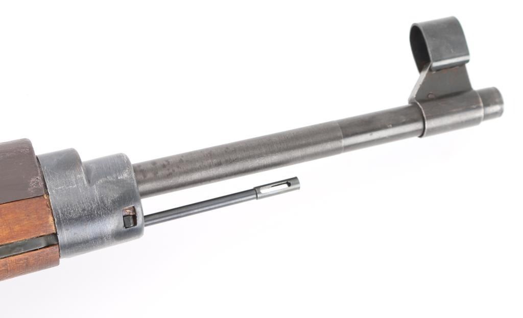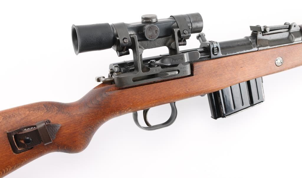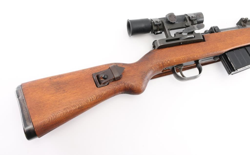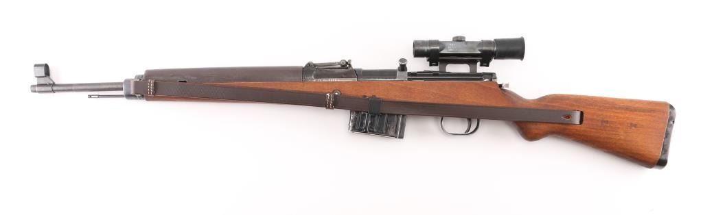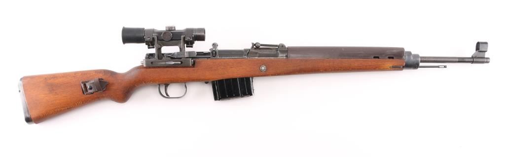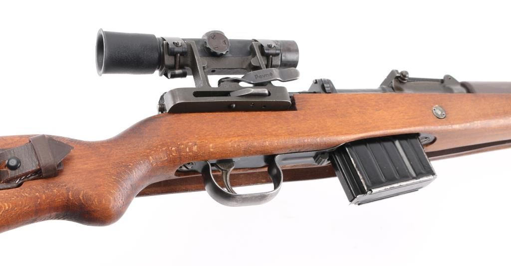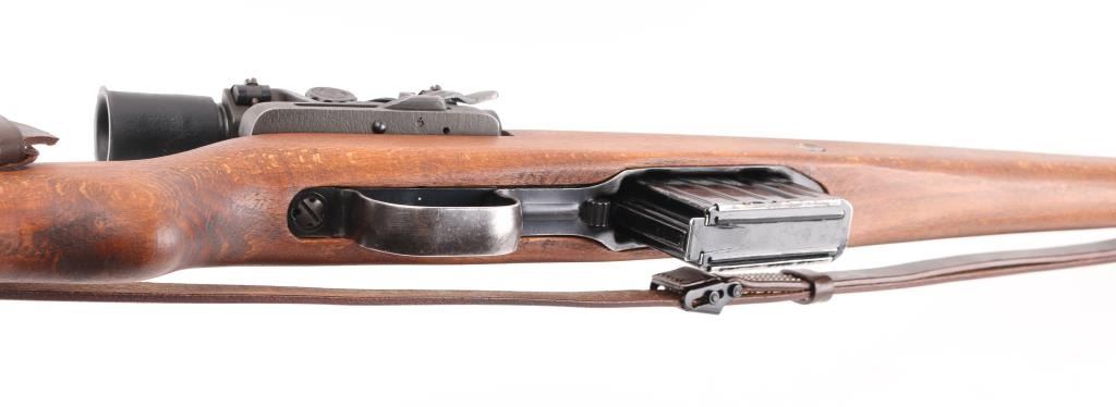 Semi-Automatic. German Military WW2 issued Rifle. 10-rd detachable box magazine. Gas-operated short-stroke piston, flapper locking. 21.5" threaded barrel with serrated ramp/blade front, and tangent rear sights. Produced 1943-45 with a total of 402,713 made. Rough machined receiver/bolt carrier with bolt hold-open lever. Left receiver stamped "G43, ac 45"3253a". Eagle/swastika proof present, mismatched number on bolt carrier. Fitted with a post-war Czech. scope mount marked E7 48 with Czech Lion. Locking lever stamped "Pevne" on the outside, and "Volne" on the backside. Correct mid-war ZF4 scope, the only scope used exclusively with G43's,and K43's. Left side of scope is stamped "K43 79394 ddx" in 3 lines followed by a blue triangle. "ddx" is for maker Voiglander und Sohn, Braunschweig. (Walther used the ddx's) with Czech rubber eye piece attached. Clear half-line optics. Bore appears very good/bright, strong rifling. Blue/gray metal finish is very good. with some minor scratches/rubs. Reproduction blonde wood is very good with two Eagle/359 waffenamts stamps, (Walther). Steel, cupped buttplate with serrated door containing some spare parts, recoil spring guide, bolt housing retainer, Cleaning rod present. Repro cross-hatched K98 sling attached. Comes with correct 10-rd magazine stamped "aye" "G43", waffenamt. NRA Condition-Very Good. C&R firearm.