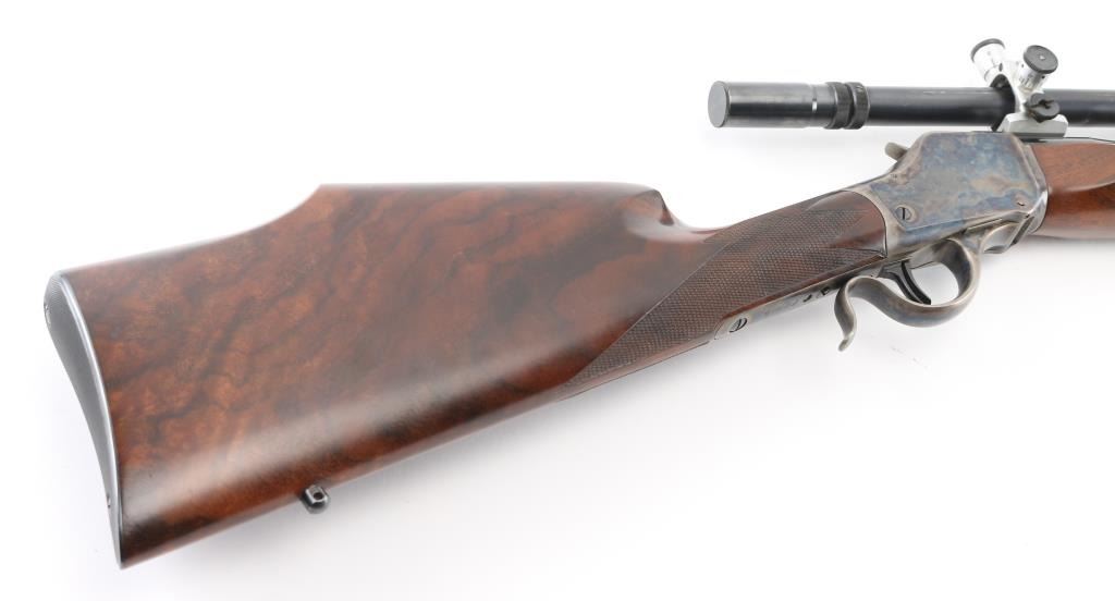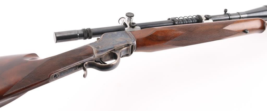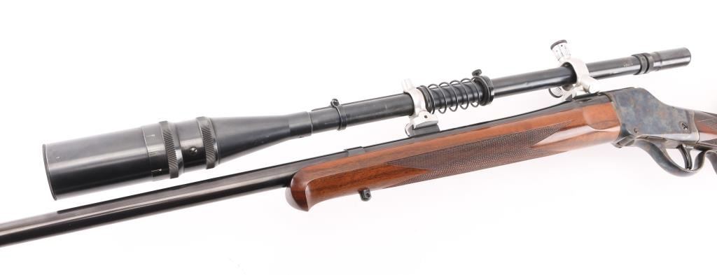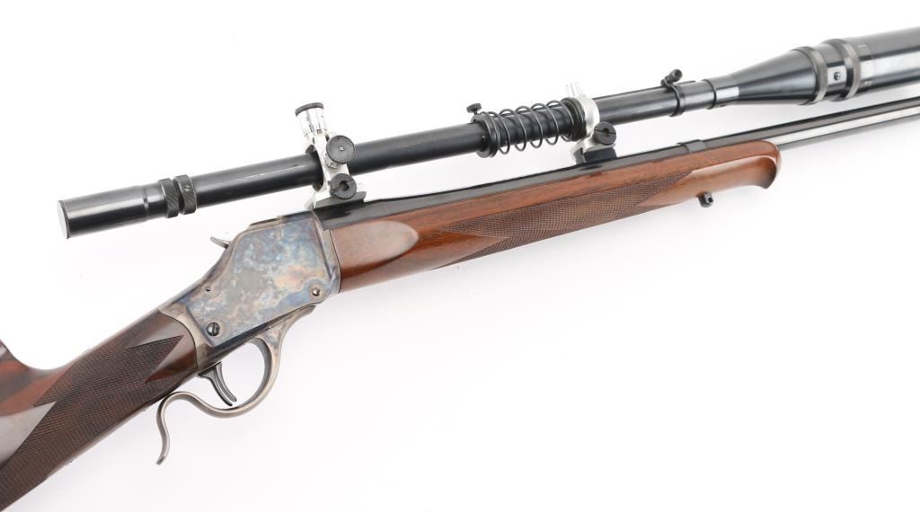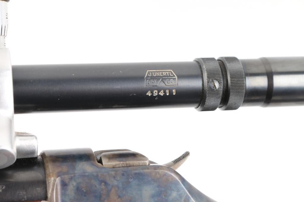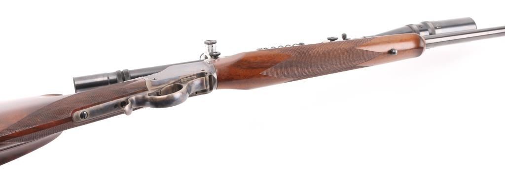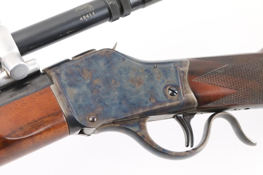 Lon Paul Custom Winchester M1885 'High Wall' re-barreled in 219 Donaldson Wasp. Manufactured in 1914. It features custom stocks and action by Lon Paul, close couple double set trigger, single-shot falling block action, 27 1/4" round tapered barrel with no provisions for sights. case-hardened frame & triggerguard/lever. Beautiful American walnut highly figured stock , schnabel forend with fine point checkering, butt stock has checkered wrist, high comb, shadow line cheek piece for right-handed shooting, and a checkered steel 'Neidner' butt plate. Sling swivel studs. Mounted with a vintage J. Unertl 16 power scope with recoil spring, standard crosshairs, and steel screw-on lens caps. Mounted with Unertl 7/8" aluminum target rings, fully windage & elevation adjustable. Clear optics. Bore is pristine, action is smooth, locks up tight., blue & case hardening are excellent, stocks are excellent with sharp checkering. Comes with approx. 50 rounds of reloads. NRA Condition-Excellent as Re-Finished, C&R Firearm,
