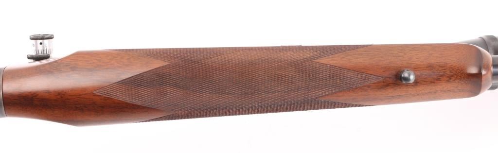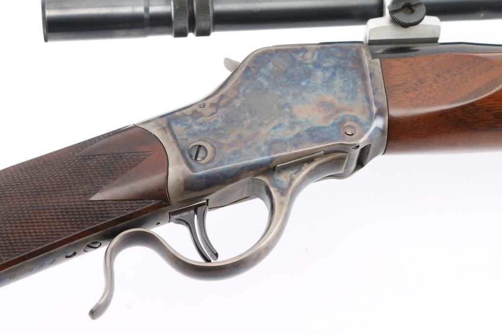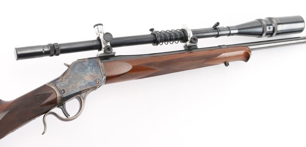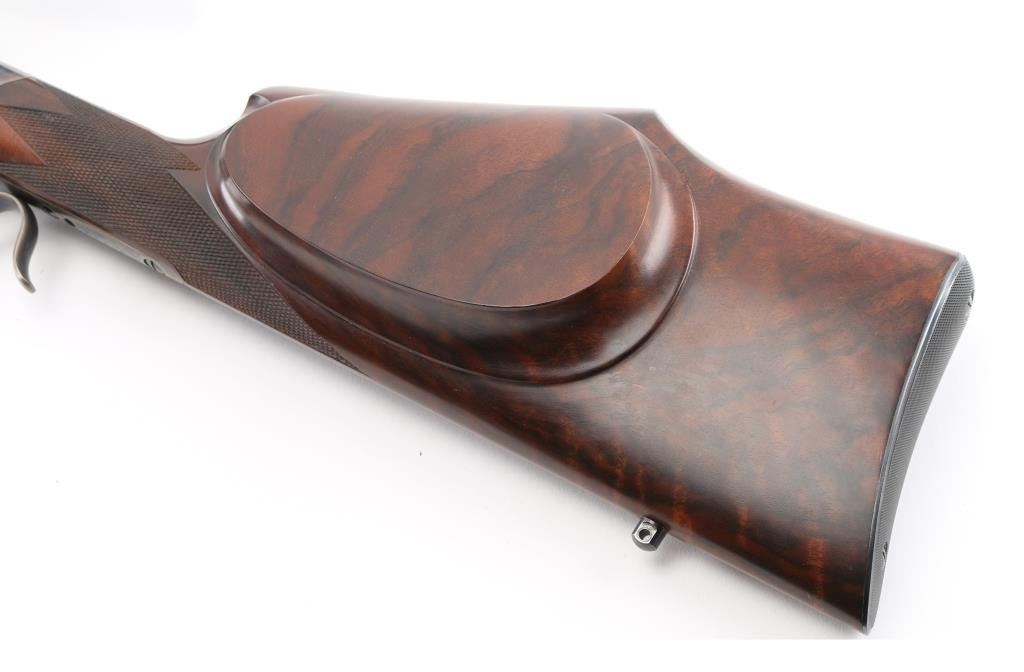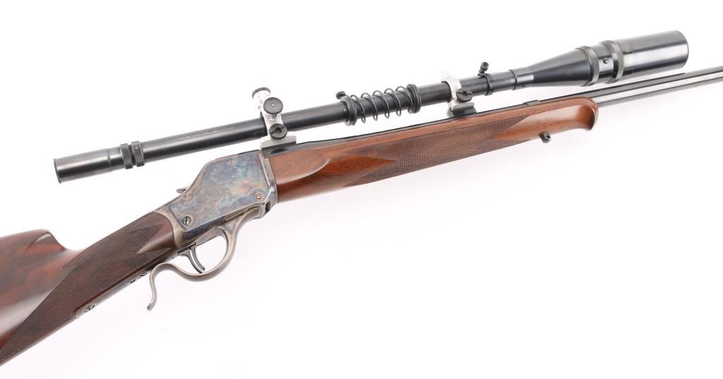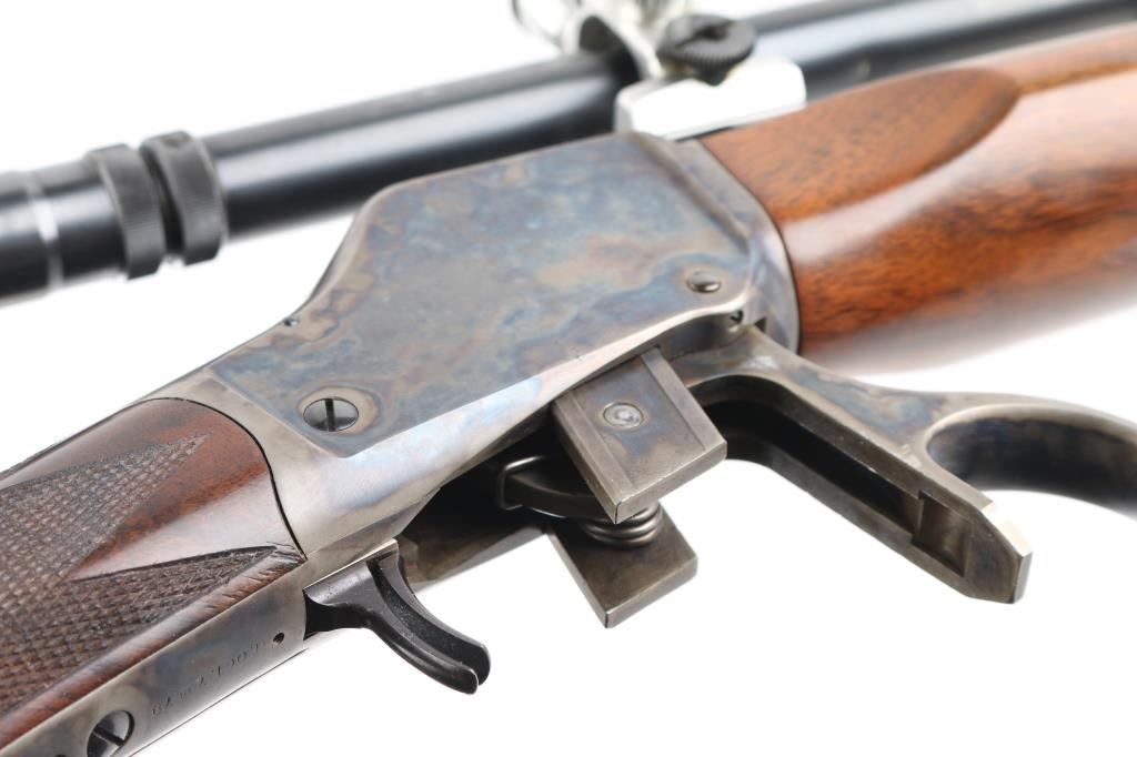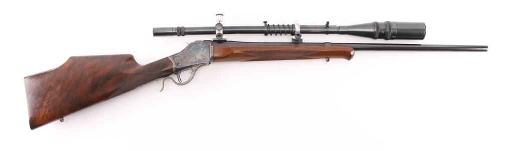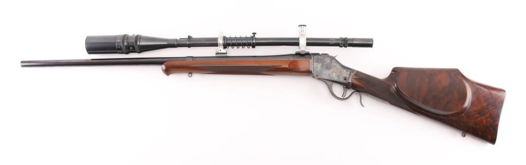 Lon Paul Custom Winchester M1885 'High Wall' re-barreled in 219 Donaldson Wasp. Manufactured in 1914. It features custom stocks and action by Lon Paul, close couple double set trigger, single-shot falling block action, 27 1/4" round tapered barrel with no provisions for sights. case-hardened frame & triggerguard/lever. Beautiful American walnut highly figured stock , schnabel forend with fine point checkering, butt stock has checkered wrist, high comb, shadow line cheek piece for right-handed shooting, and a checkered steel 'Neidner' butt plate. Sling swivel studs. Mounted with a vintage J. Unertl 16 power scope with recoil spring, standard crosshairs, and steel screw-on lens caps. Mounted with Unertl 7/8" aluminum target rings, fully windage & elevation adjustable. Clear optics. Bore is pristine, action is smooth, locks up tight., blue & case hardening are excellent, stocks are excellent with sharp checkering. Comes with approx. 50 rounds of reloads. NRA Condition-Excellent as Re-Finished, C&R Firearm,